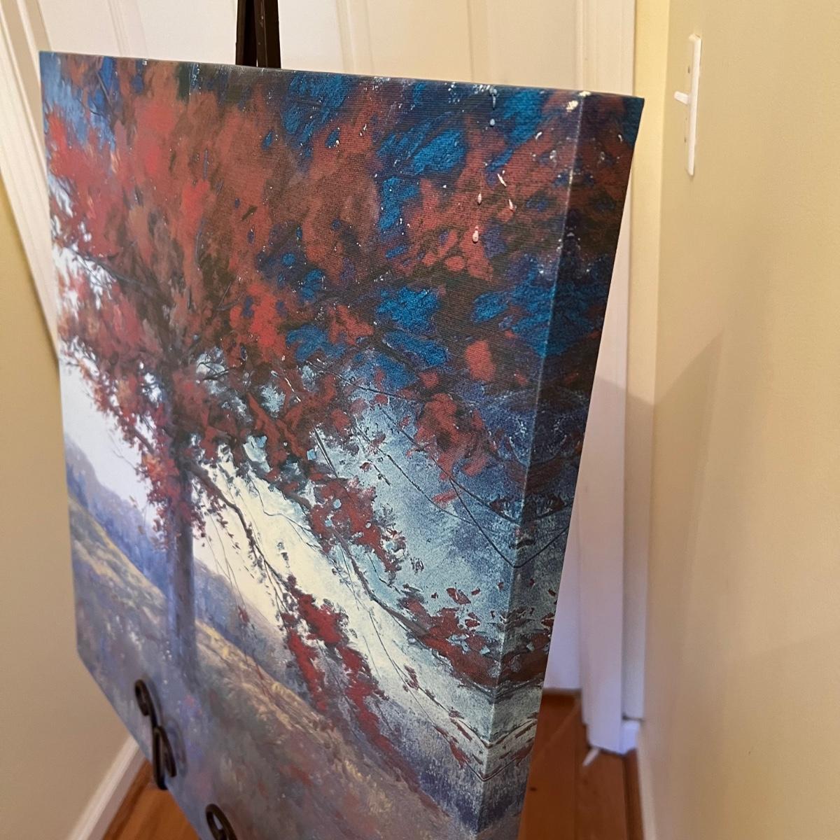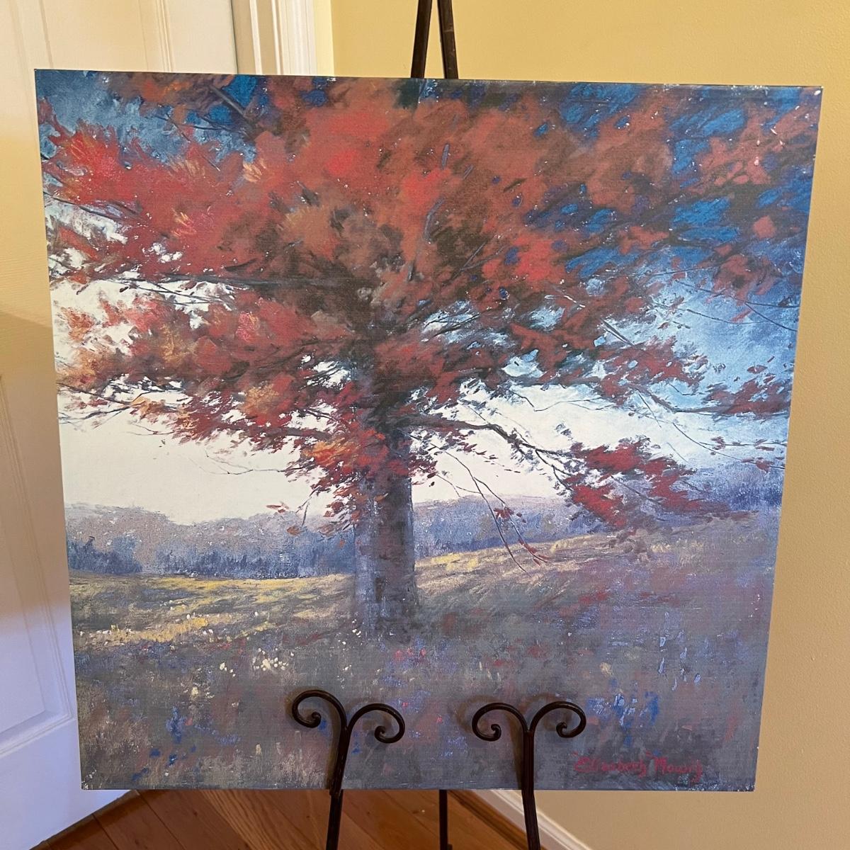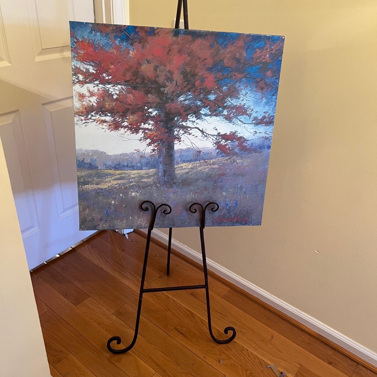 A print on canvas of an autumnal tree by Elizabeth Mowry. Wood frame with metal hanging hardware. The wrought iron brown metal tripod stand folds flat and stands 60”H.