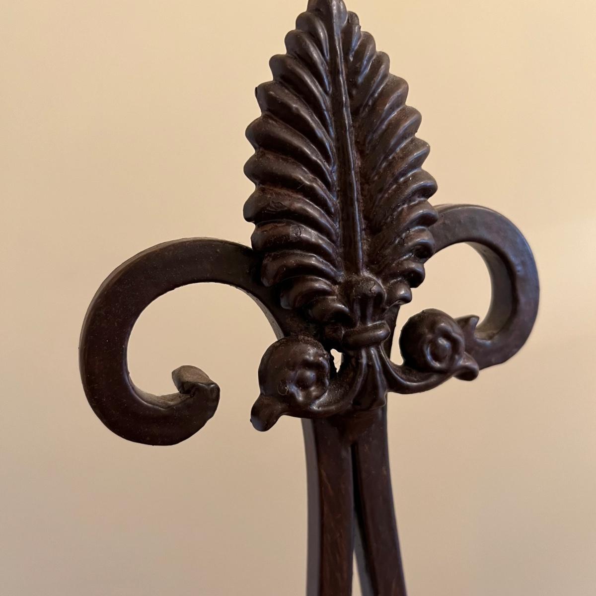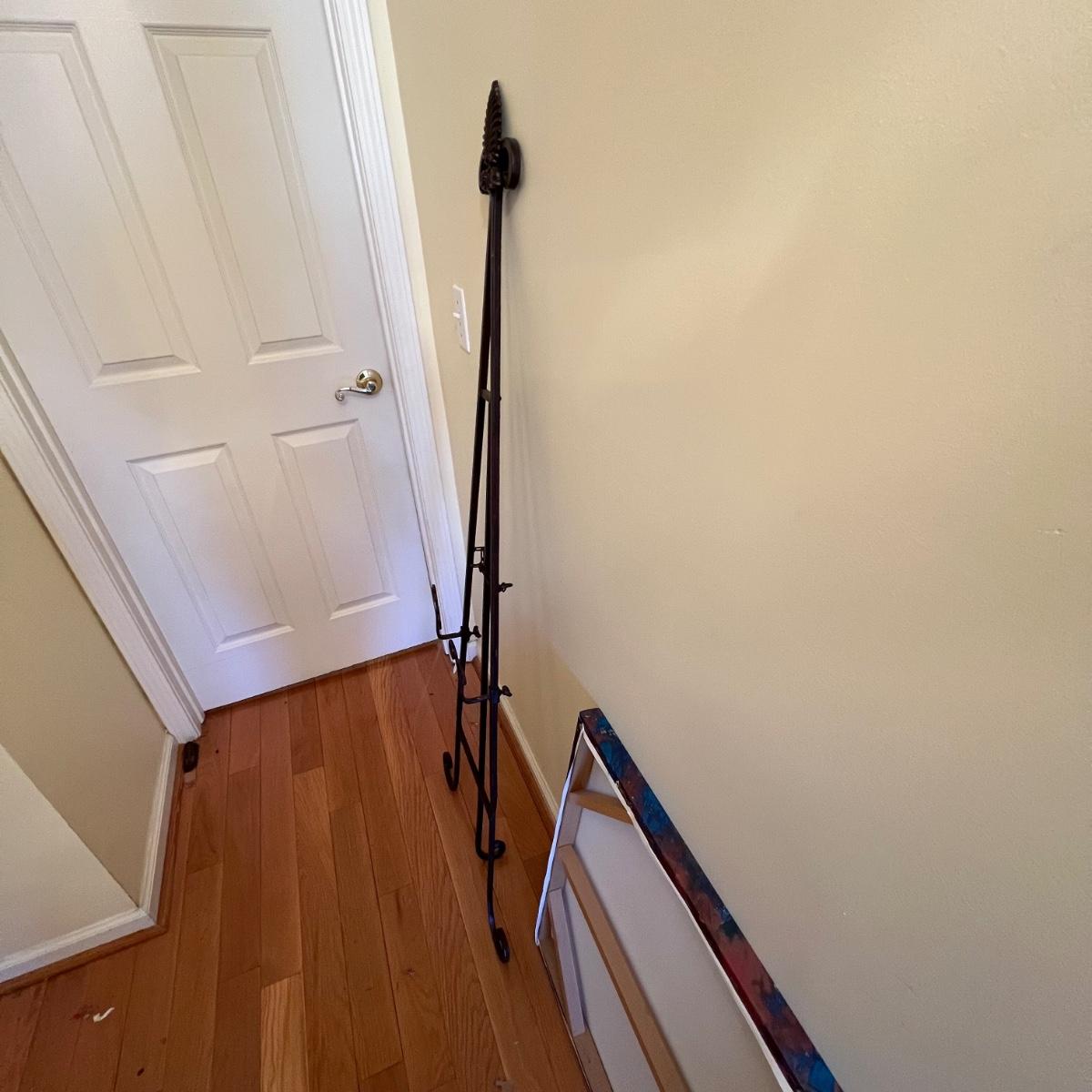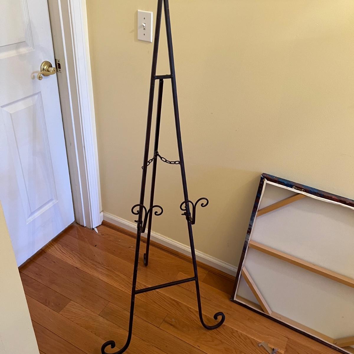 A print on canvas of an autumnal tree by Elizabeth Mowry. Wood frame with metal hanging hardware. The wrought iron brown metal tripod stand folds flat and stands 60”H.