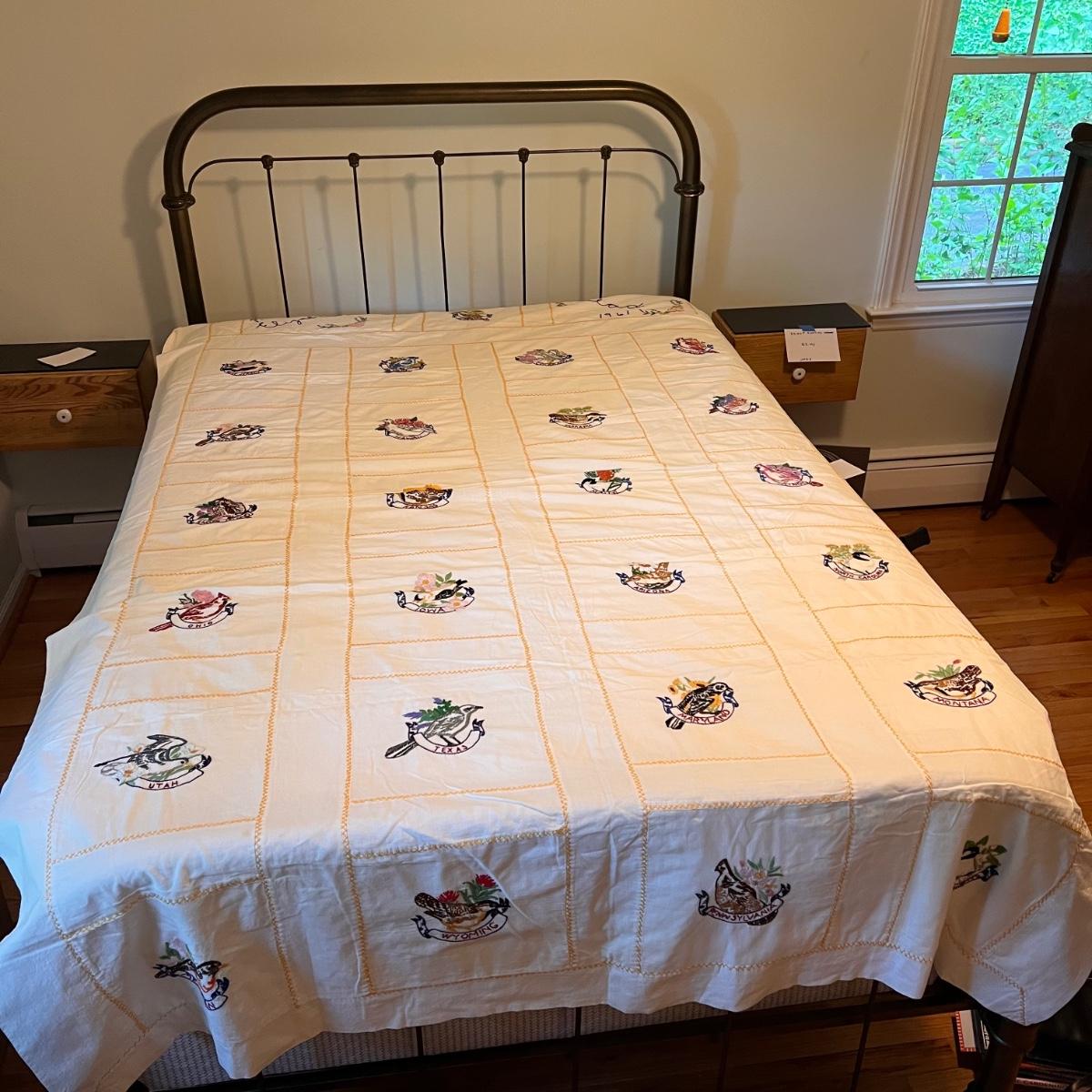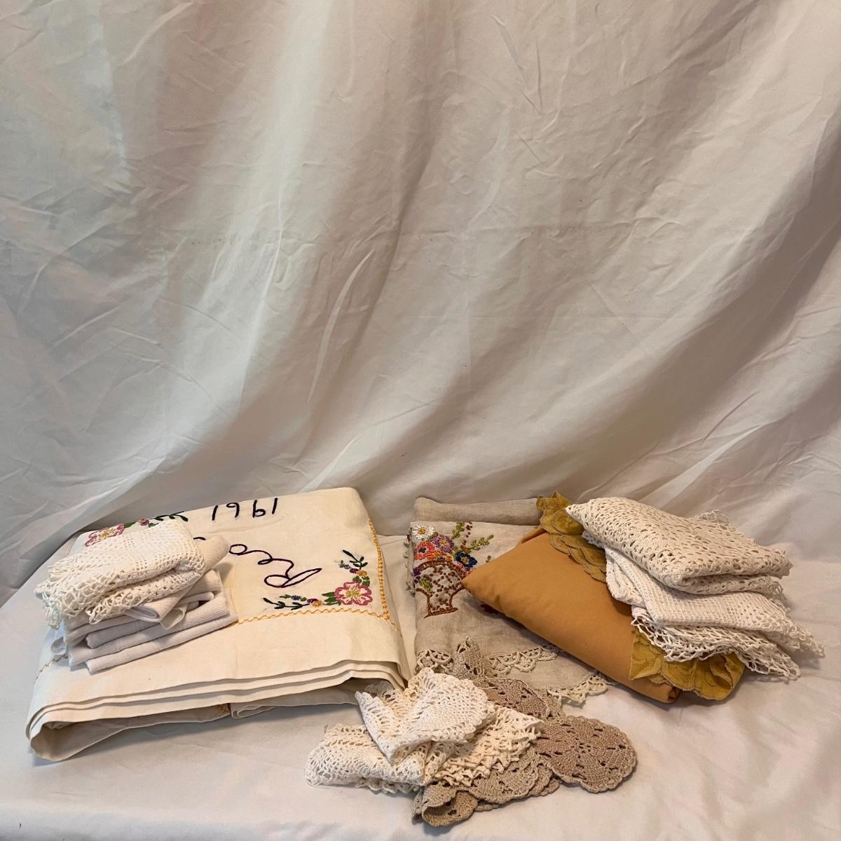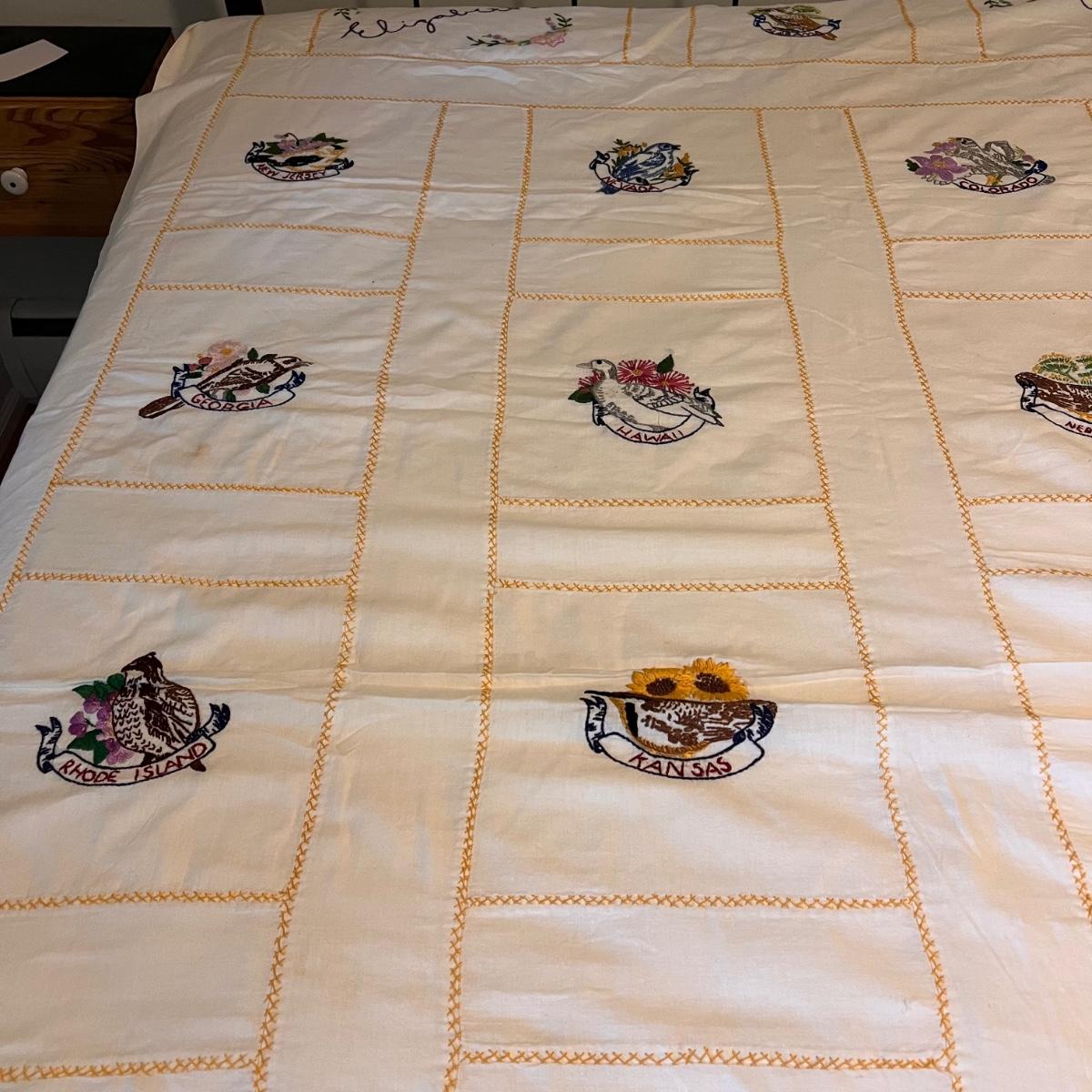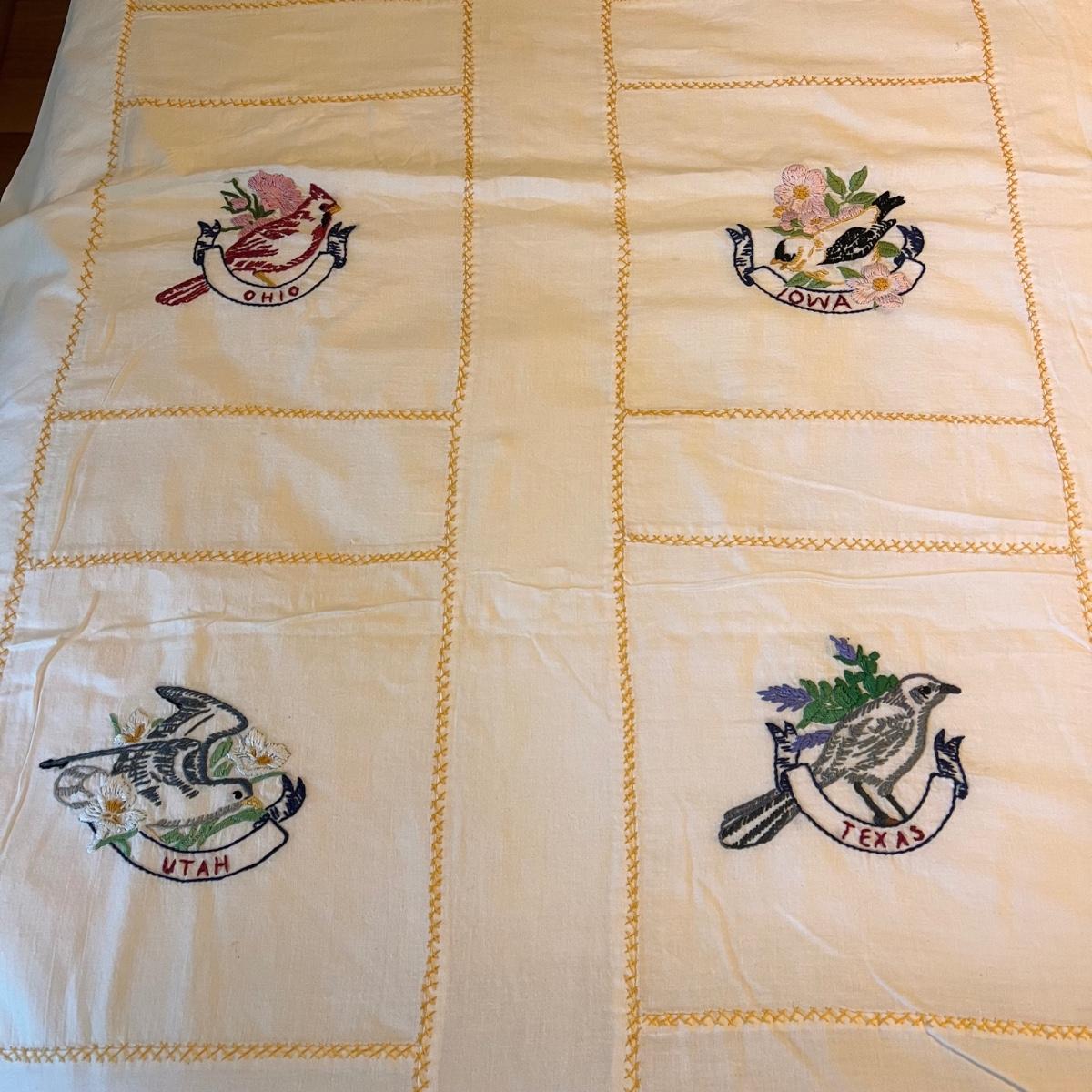 This lot includes one twin size Elizabeth Read embroidered sheet, one round yellow table cloth with a lace trim, five linen napkins, two table runners, and several doilies. The Elizabeth Read sheet is embroidered with her name and 25 different states and their state bird. The sheet is twin size, but it is pictured on a full size bed. The smallest items are the flower doilies that measure 9”D. Shipping available.