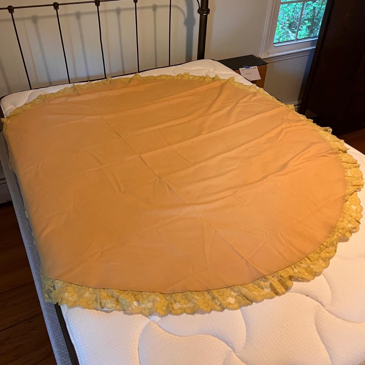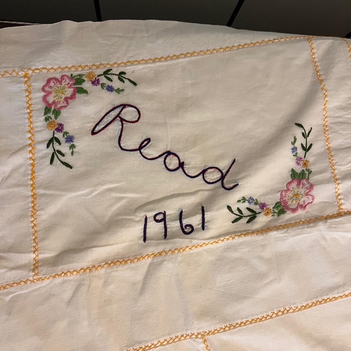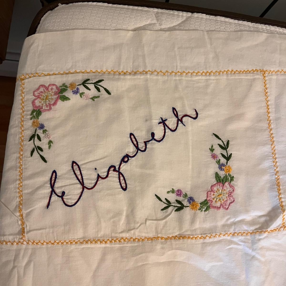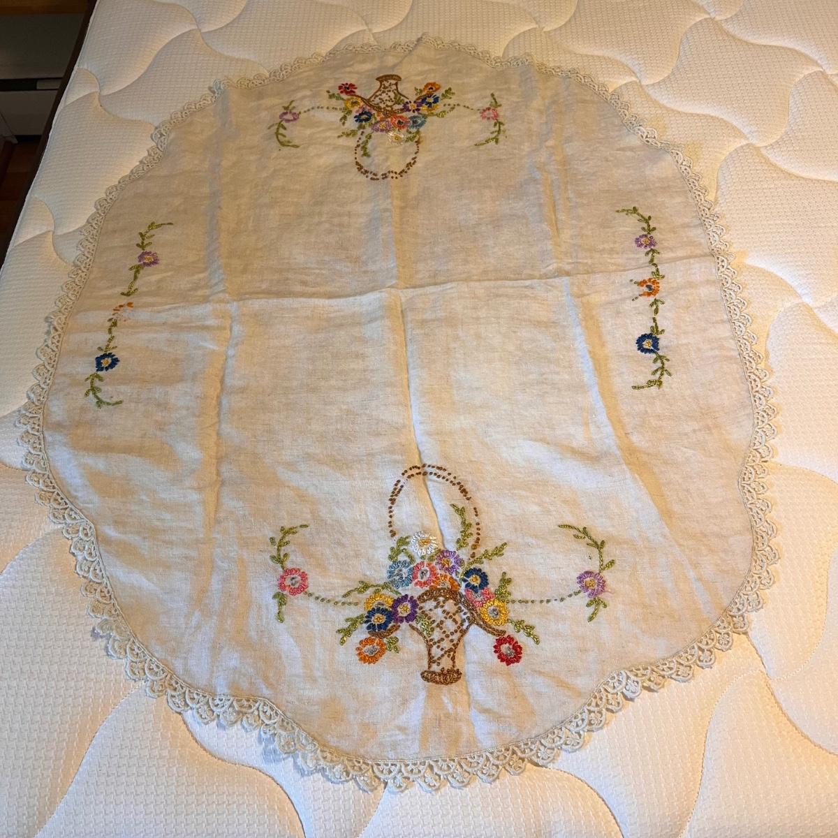 This lot includes one twin size Elizabeth Read embroidered sheet, one round yellow table cloth with a lace trim, five linen napkins, two table runners, and several doilies. The Elizabeth Read sheet is embroidered with her name and 25 different states and their state bird. The sheet is twin size, but it is pictured on a full size bed. The smallest items are the flower doilies that measure 9”D. Shipping available.