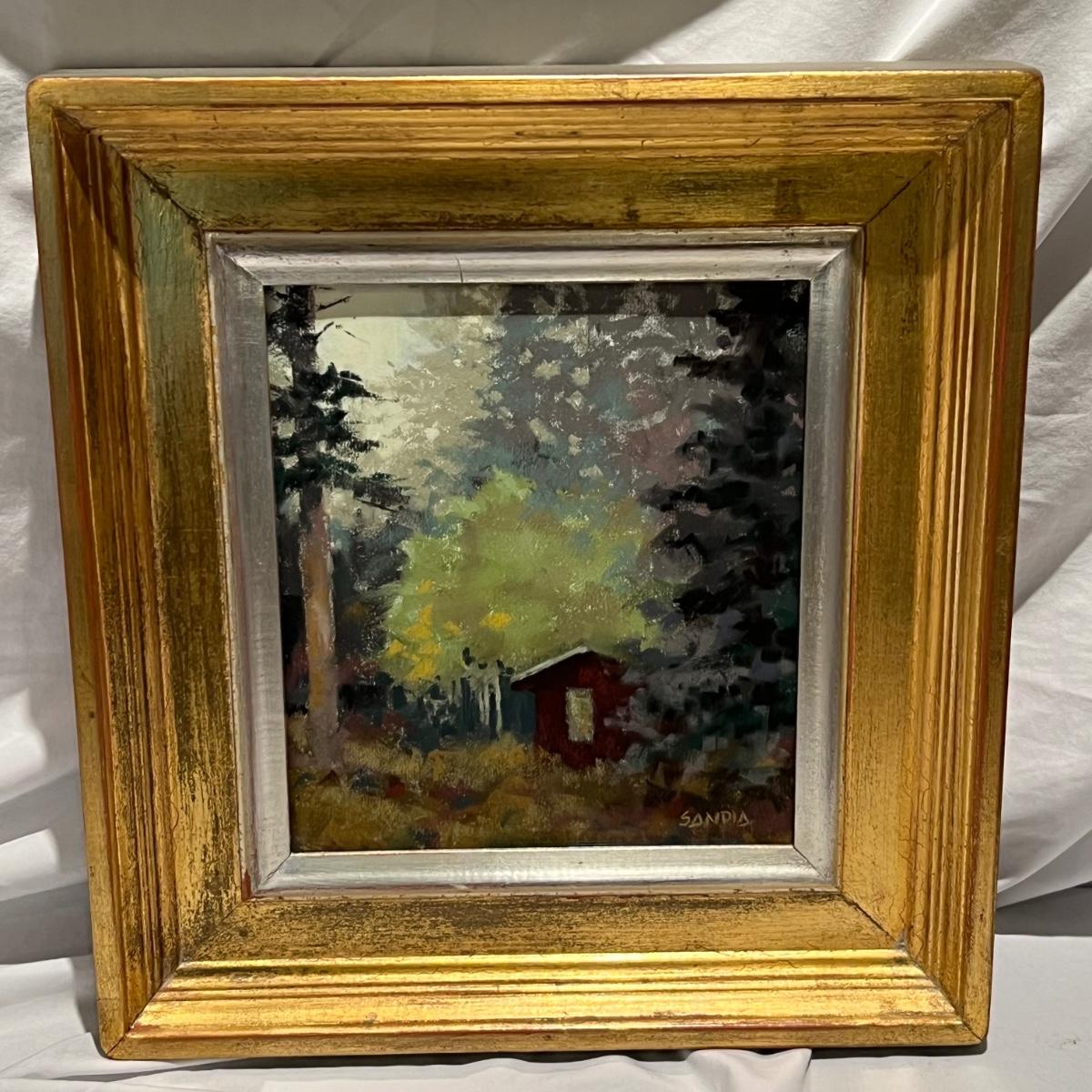 Lovely landscape pastel features a red barn in the woods. Artwork is signed, under glass, and mounted in a gilded wooden frame.