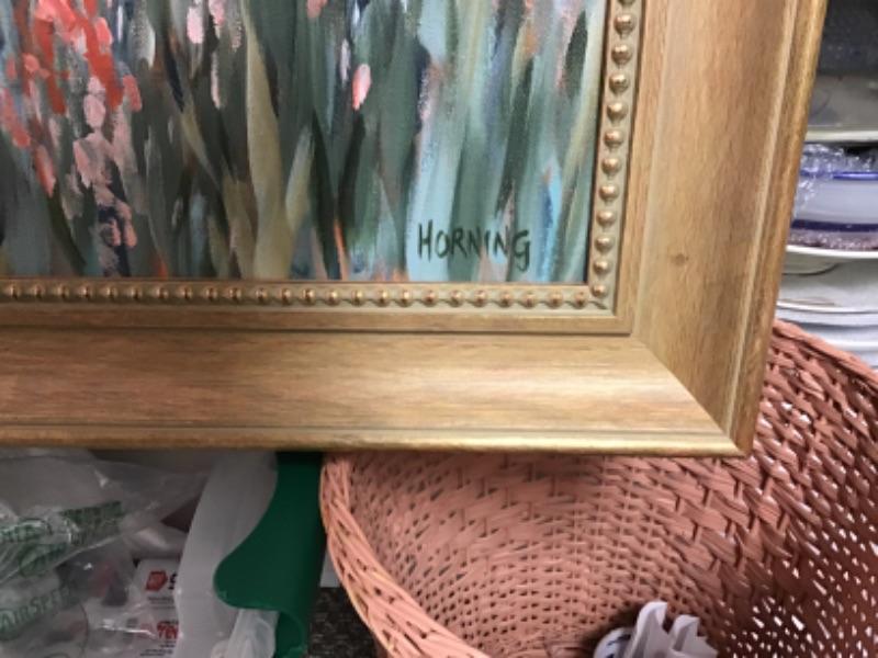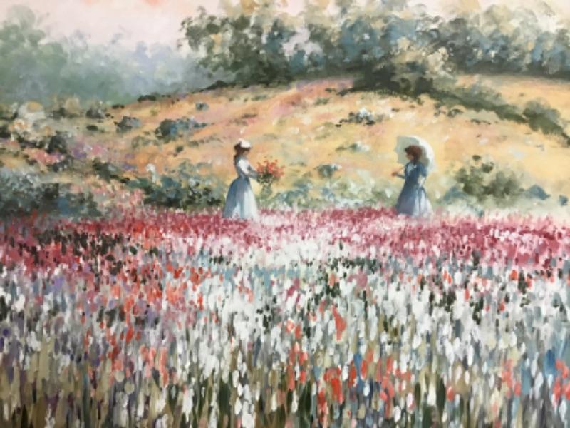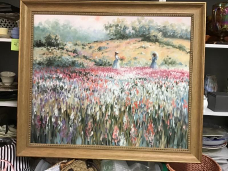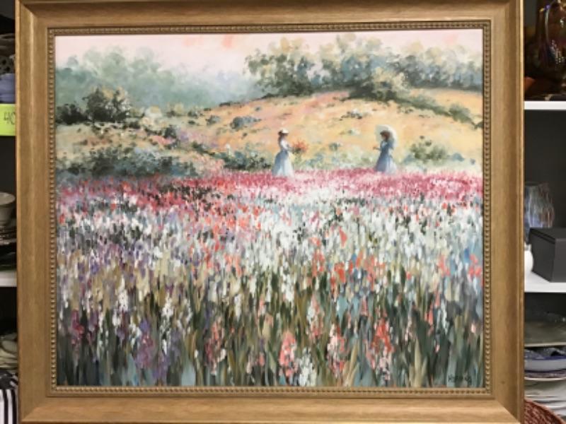 This is an original oil painting On canvas by Elizabeth “Liz” Horning (1943- )Depicts two women in a blooming field of flowers. Not dated but signed Horning in bottom right. Painting measures 35.5” wide and 29.5” high. Frame measures 41..75” wide x 35.75” high.