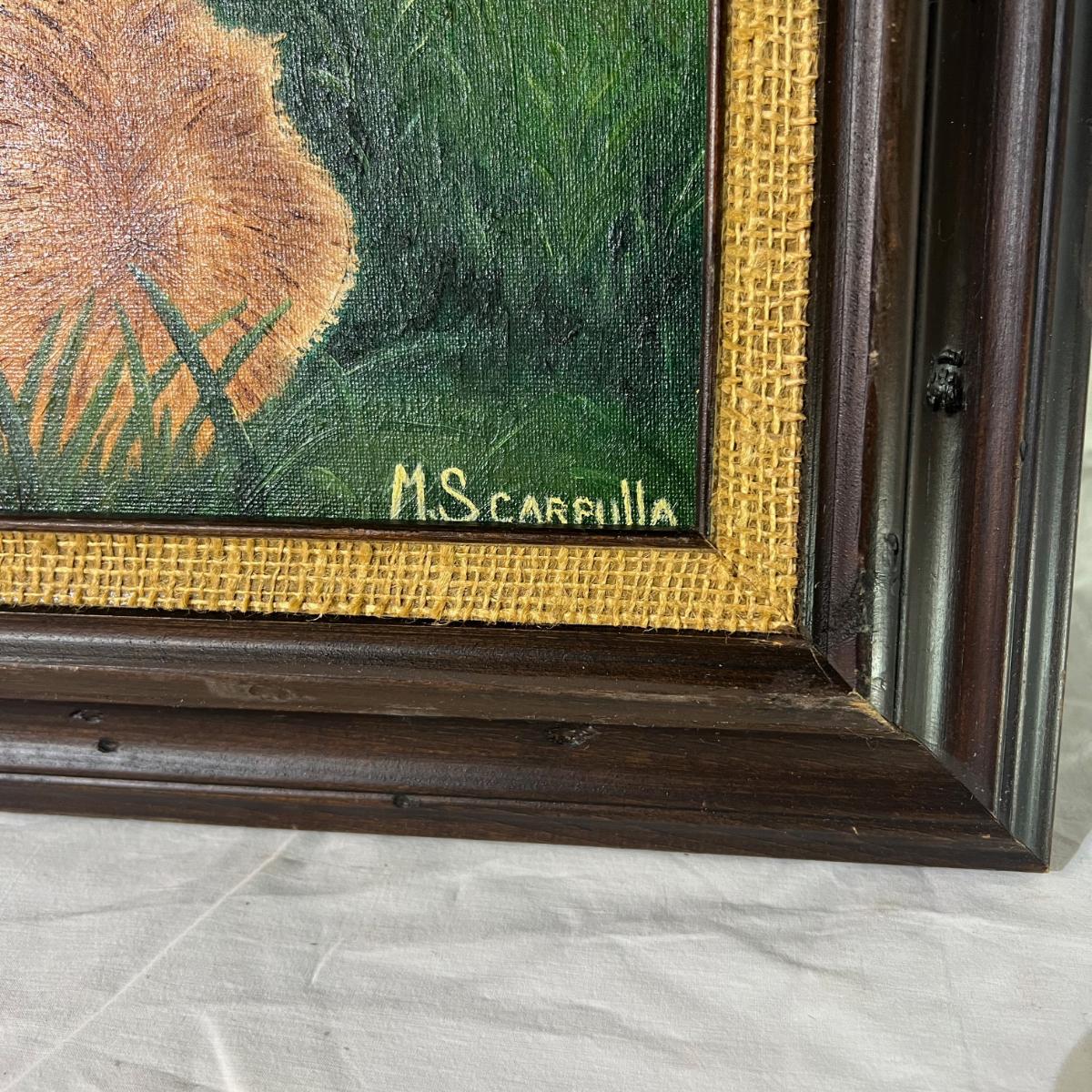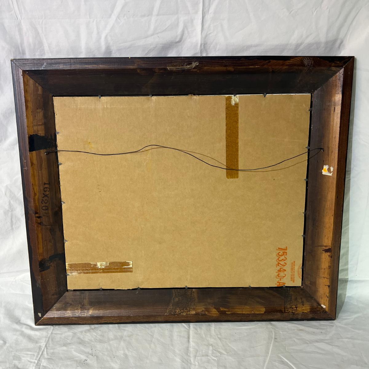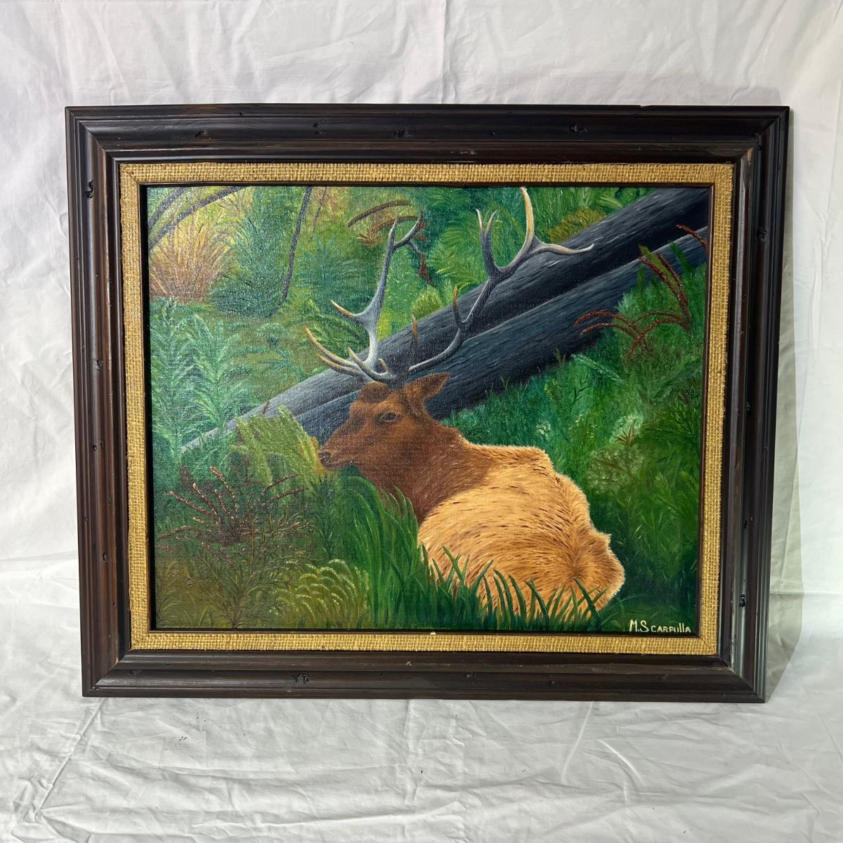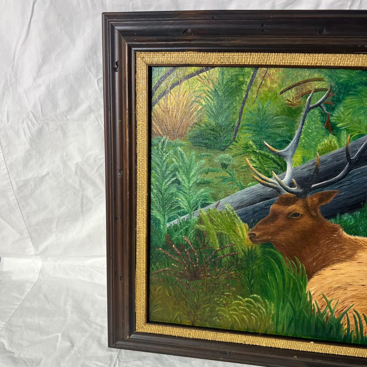 Elk Bedded In Forest Painting with Wood Frame, has a burlap framing the edge of the art. Dimensions are 25 1/4" x 21 1/2"