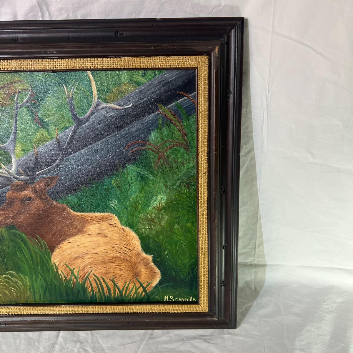 Elk Bedded In Forest Painting with Wood Frame