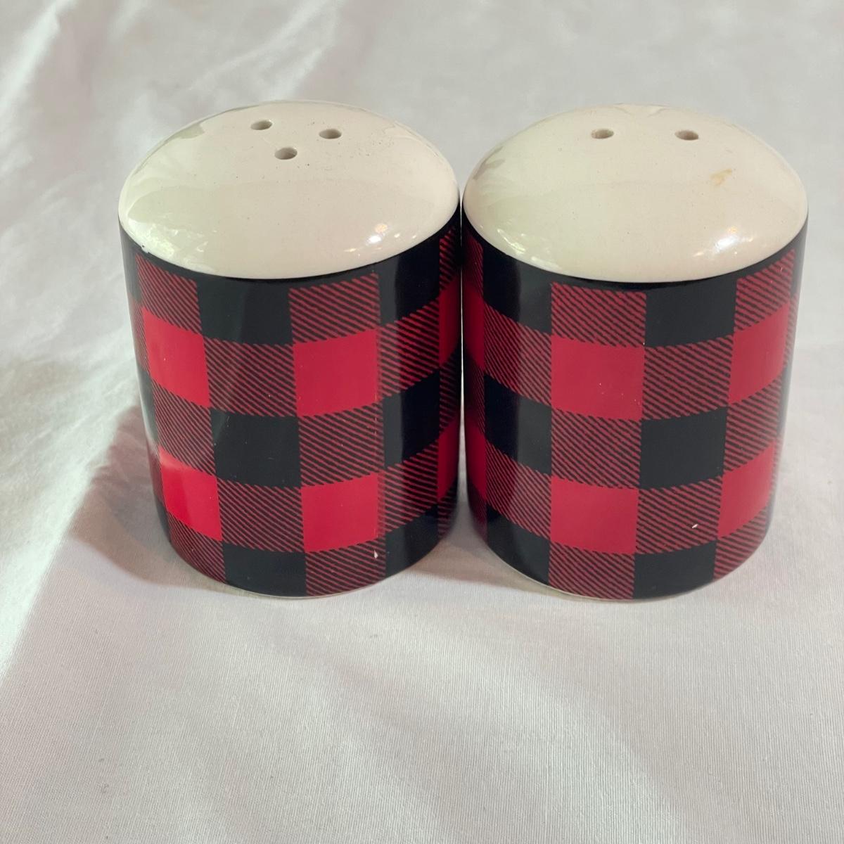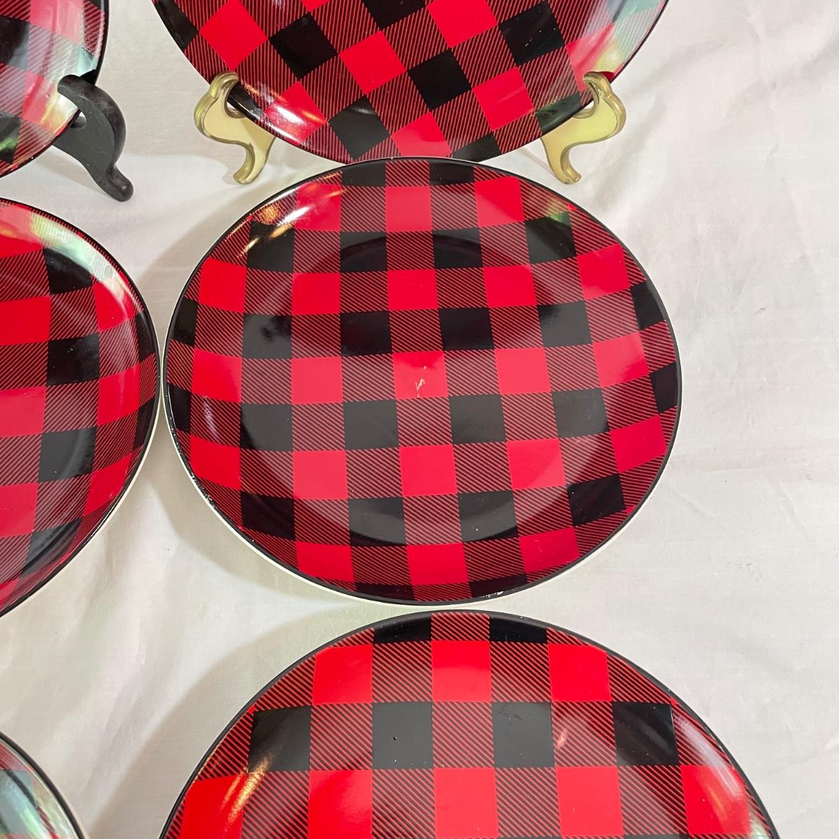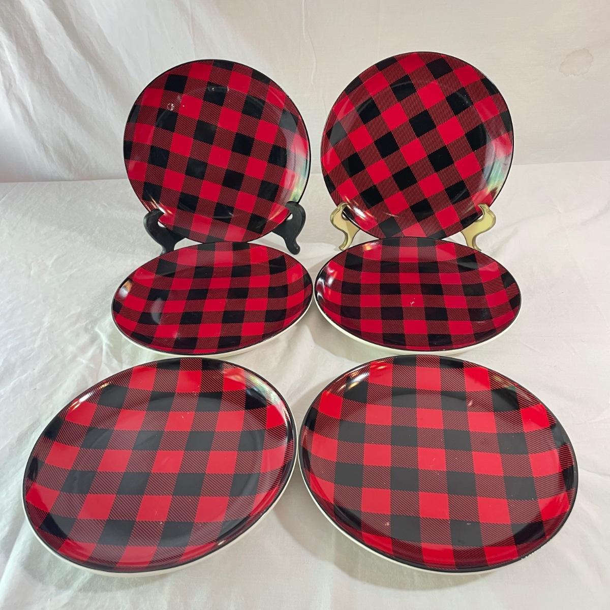 Two separate sets of six each plus matching salt shakers. Two bison and four elk dinner plates from Unison Gifts measure 10.5”D. A set of six red buffalo plaid plates measure 8.5”. There are some noted blemishes in the finish on these plates. Their matching seasoning shaker set are 2”D x 2.75”H. See images. Shipping available.