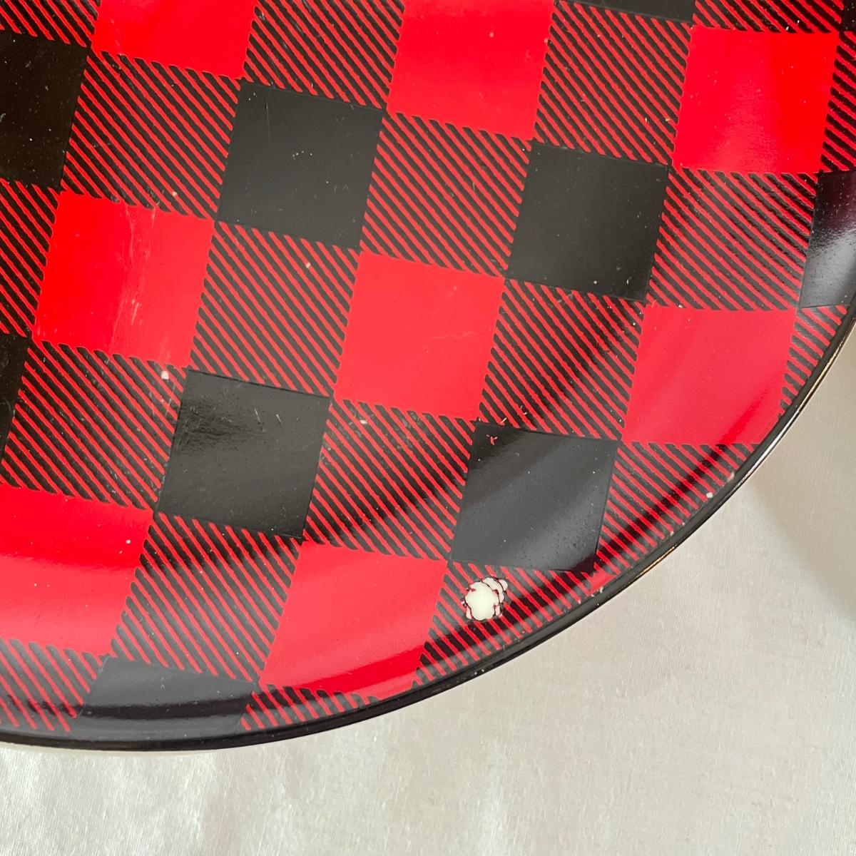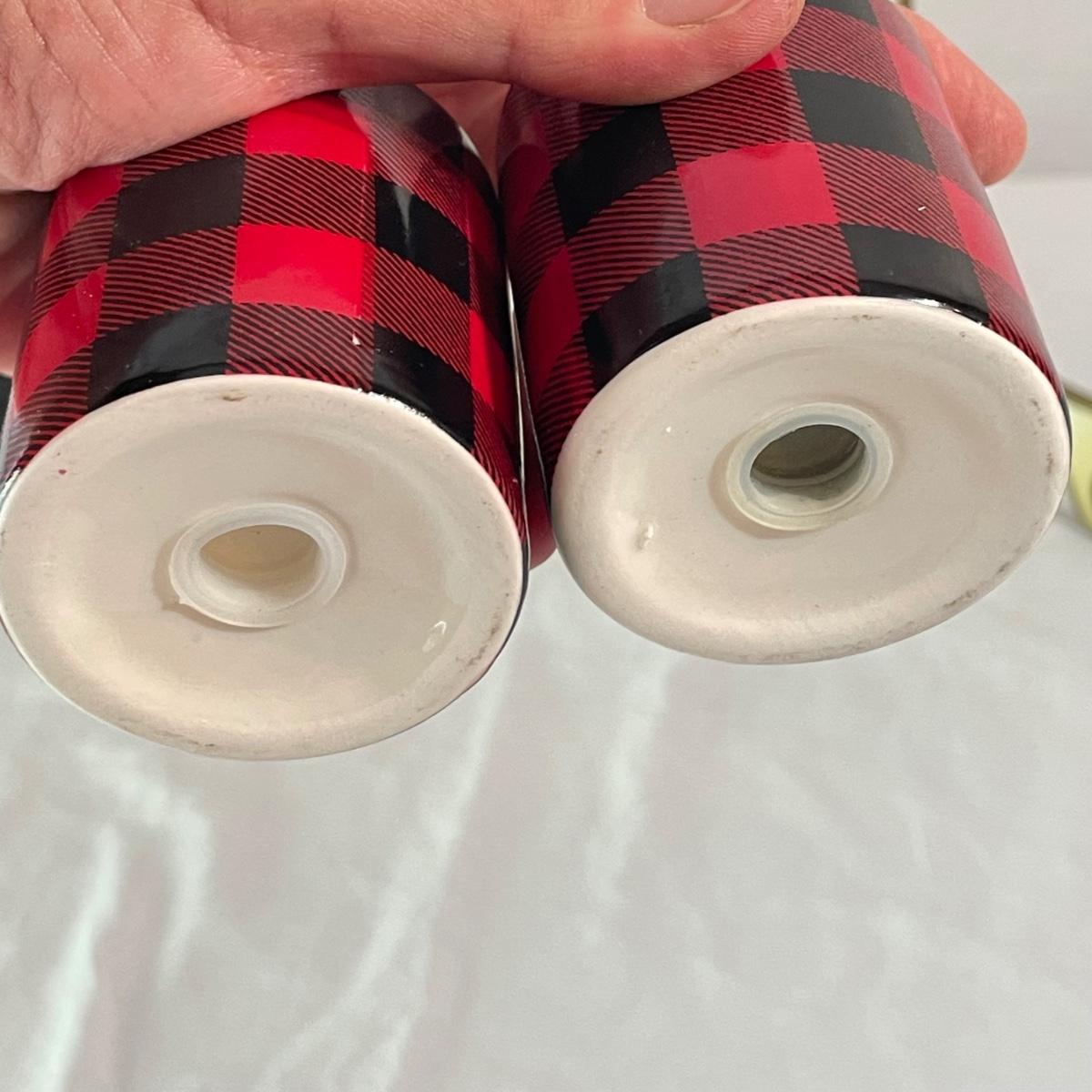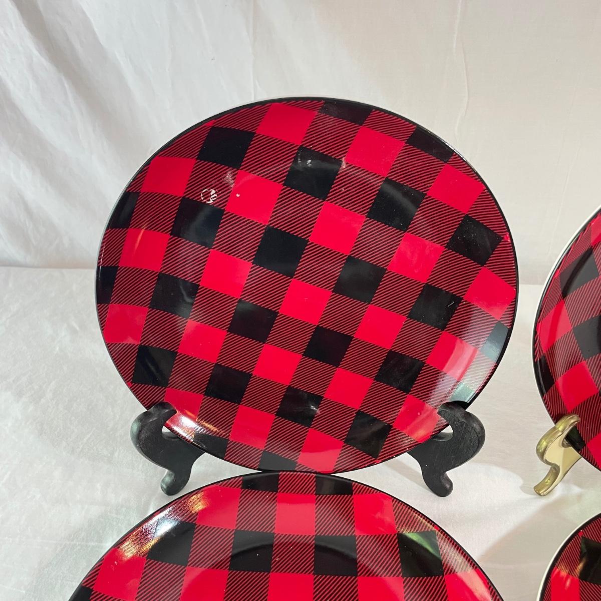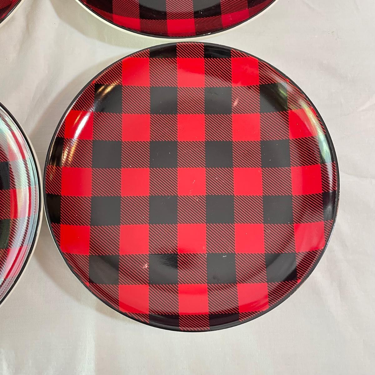 Two separate sets of six each plus matching salt shakers. Two bison and four elk dinner plates from Unison Gifts measure 10.5”D. A set of six red buffalo plaid plates measure 8.5”. There are some noted blemishes in the finish on these plates. Their matching seasoning shaker set are 2”D x 2.75”H. See images. Shipping available.