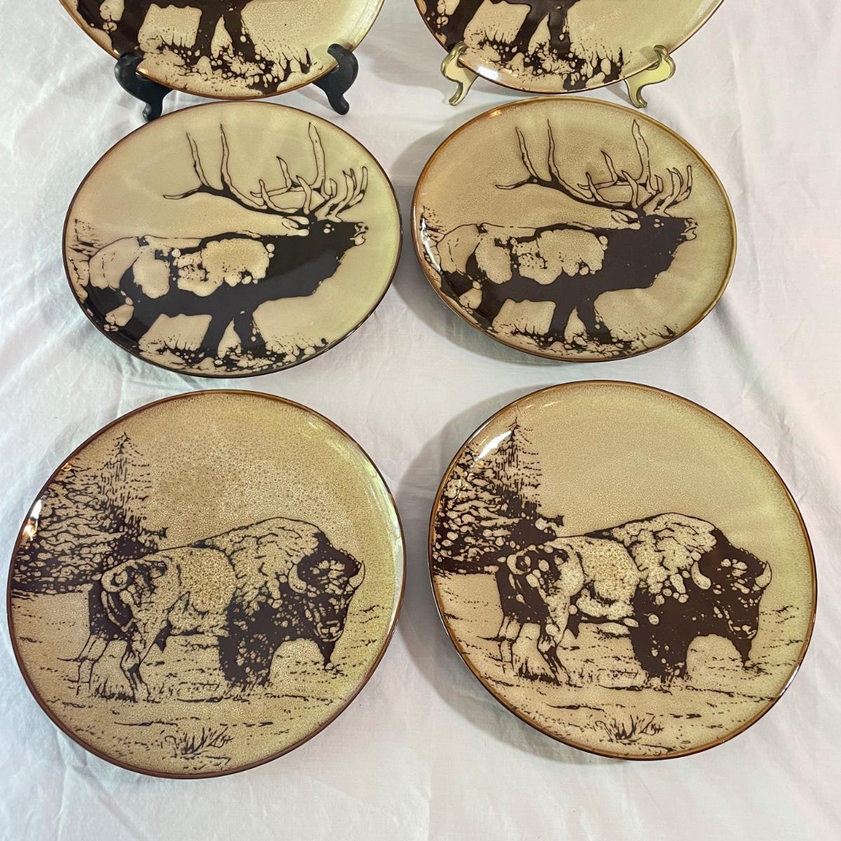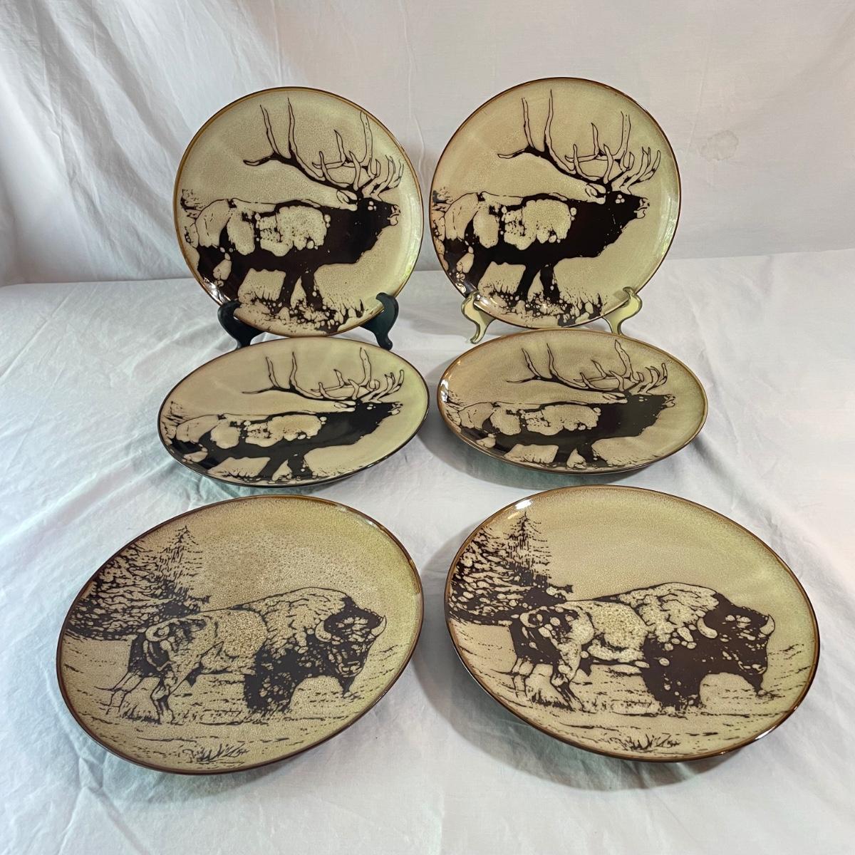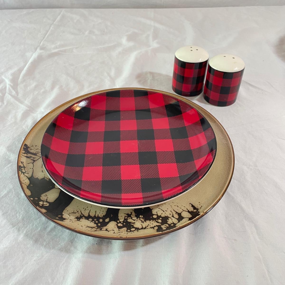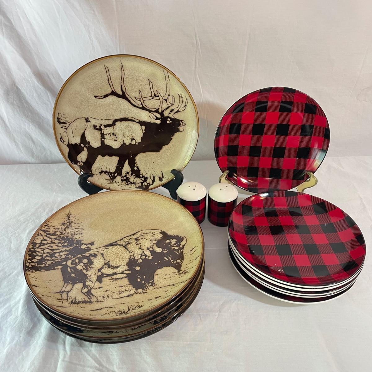Elk & Bison Dinner Plates w/ Buffalo Plaid Salad Plates & Shakers (DR-SS)