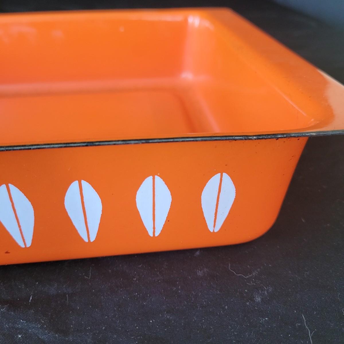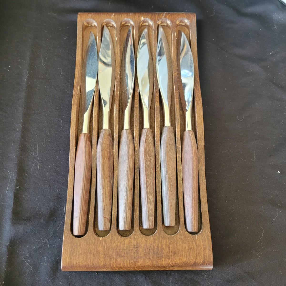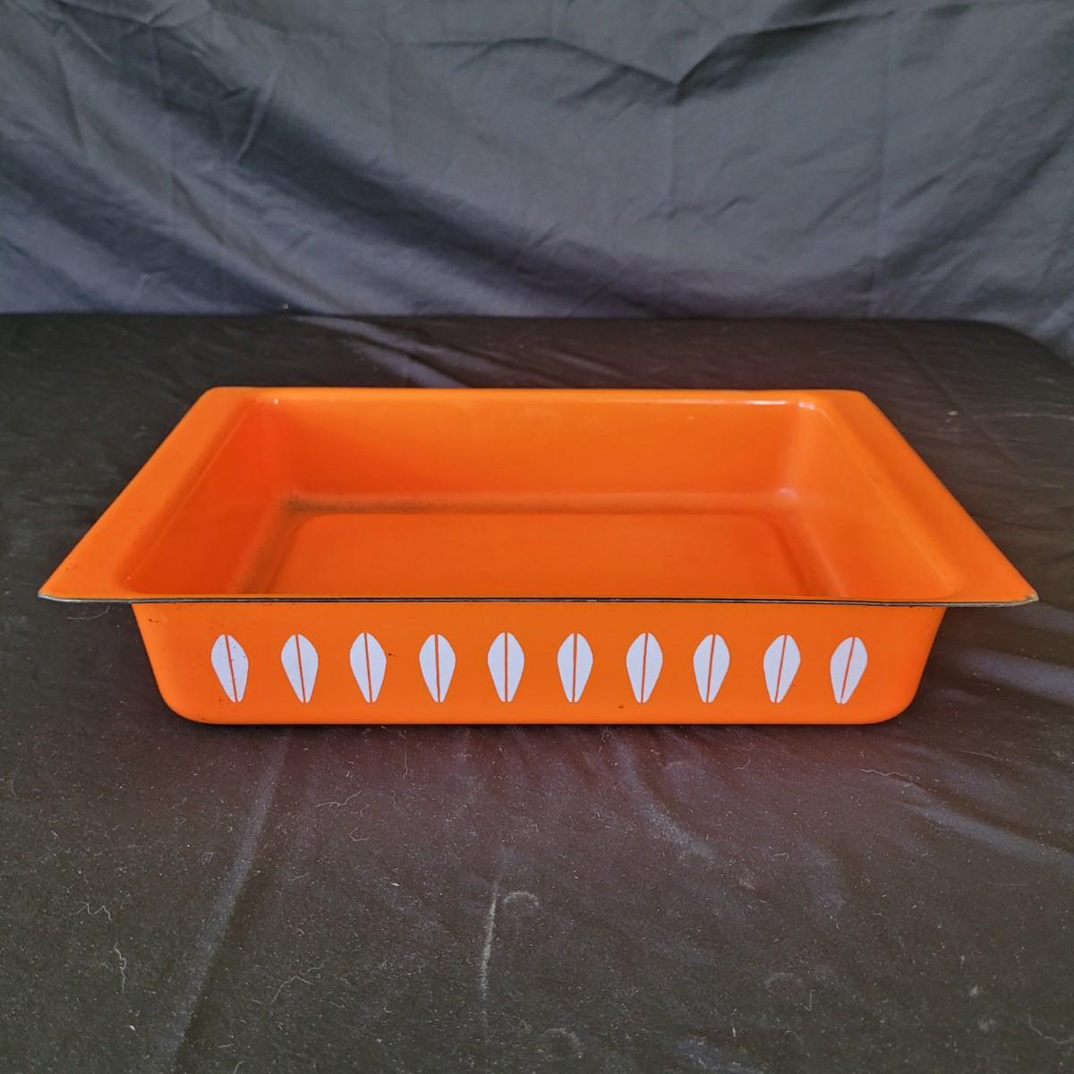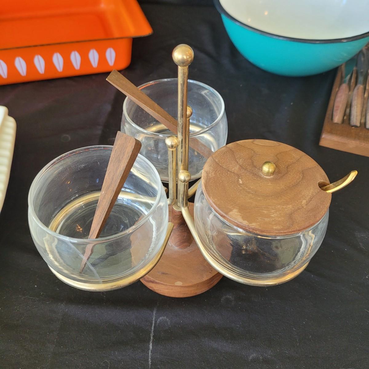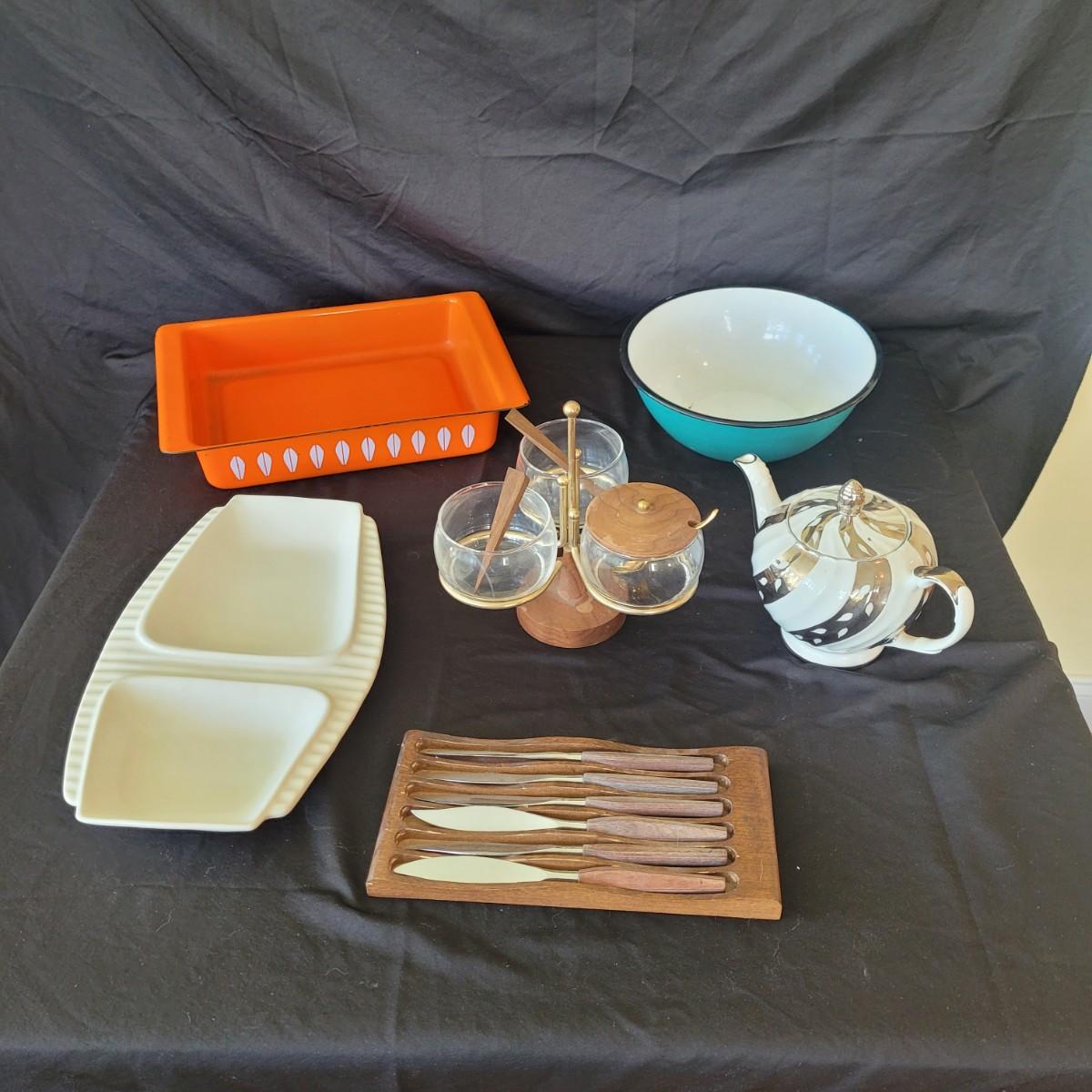 This fun collection of MCM kitchenware includes a silver plated Ellgreave England teapot, a Florence Ceramics semi porcelain serving tray, a MCM glass and wood swiveling condiment jar, Japanese metal mixing bowl, orange enamel coated baking tray, and a set of six wooden handled Moderna Columbia stainless steel steak knives. Orange baking tray measures approximately 14” x 9”. Shipping available.