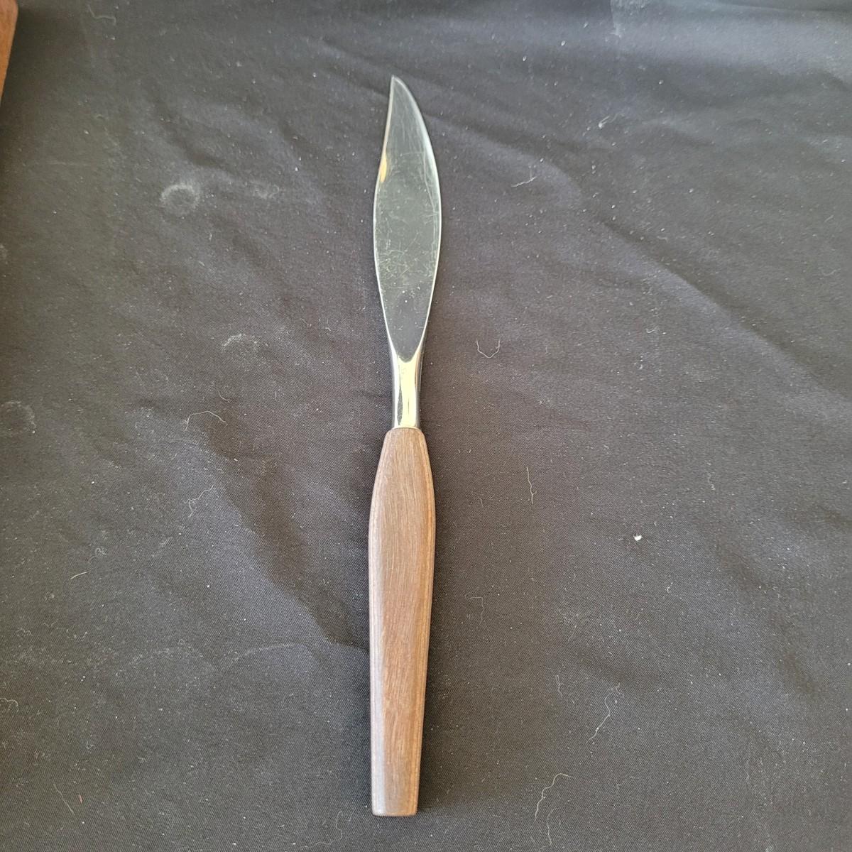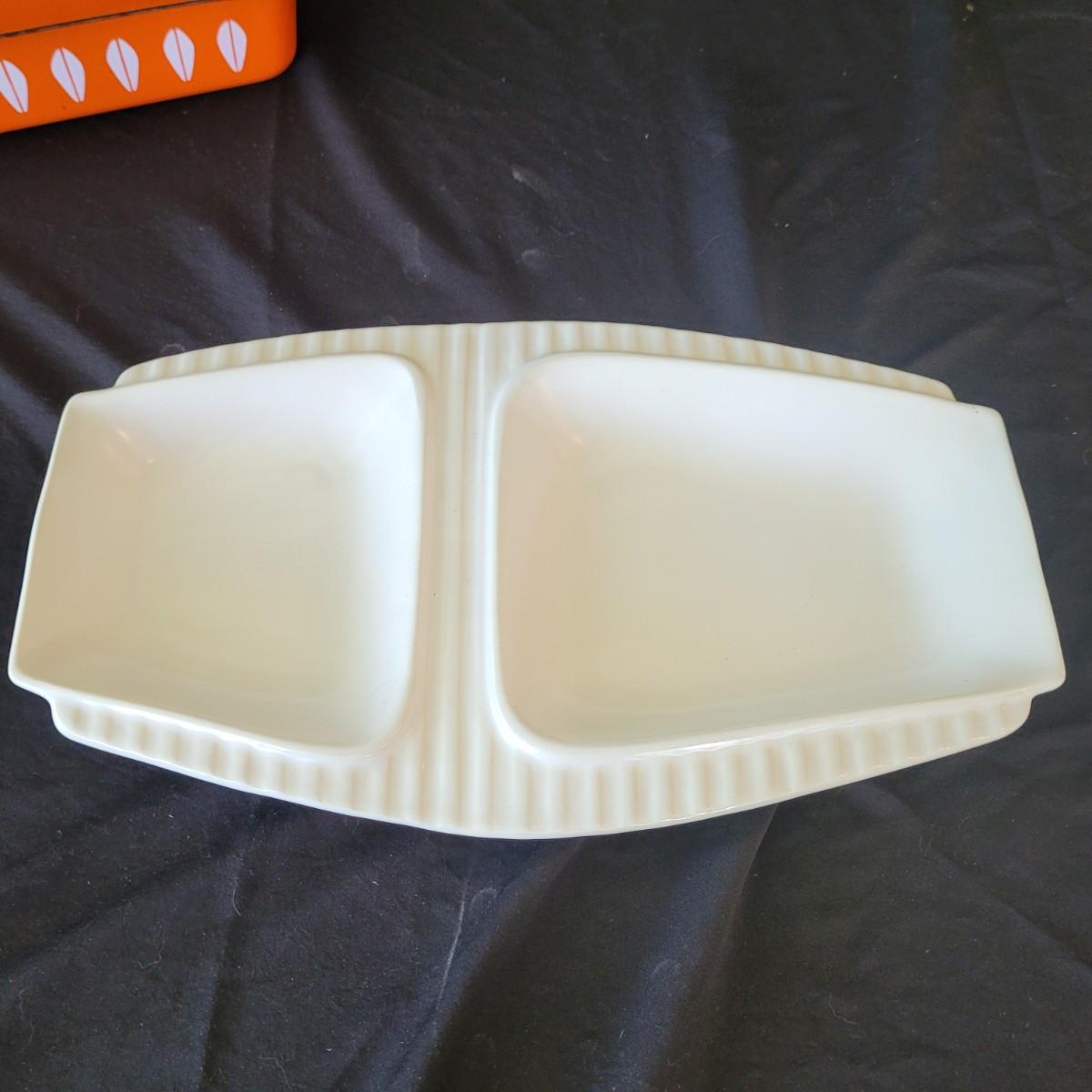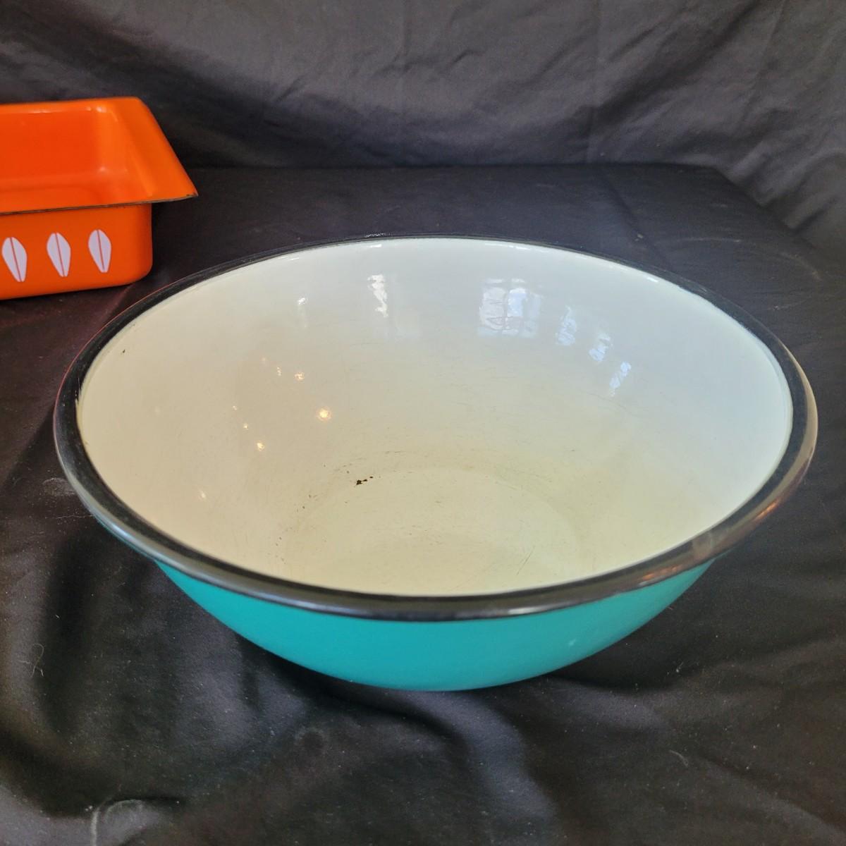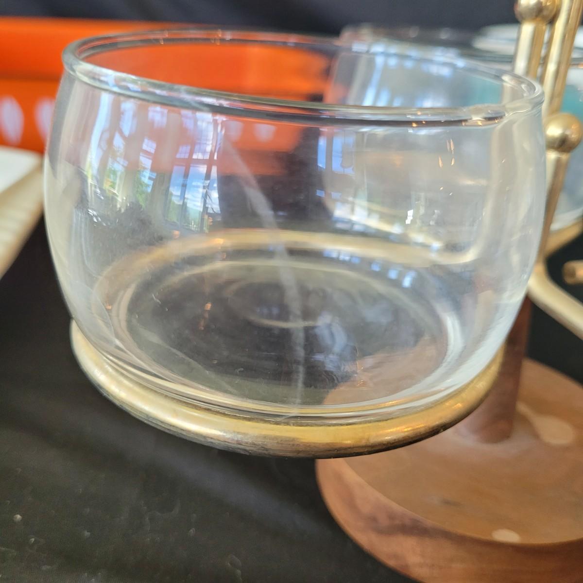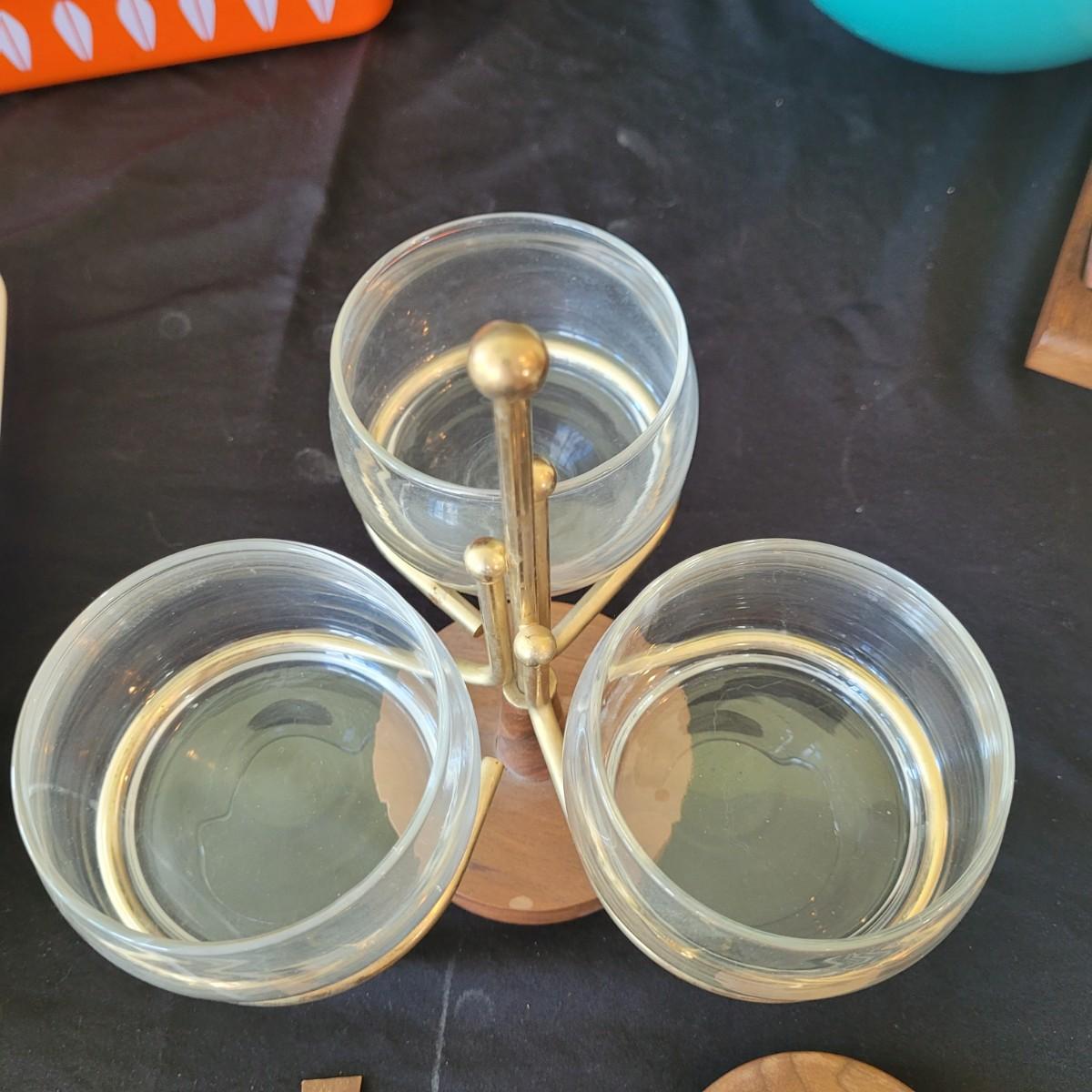 This fun collection of MCM kitchenware includes a silver plated Ellgreave England teapot, a Florence Ceramics semi porcelain serving tray, a MCM glass and wood swiveling condiment jar, Japanese metal mixing bowl, orange enamel coated baking tray, and a set of six wooden handled Moderna Columbia stainless steel steak knives. Orange baking tray measures approximately 14” x 9”. Shipping available.