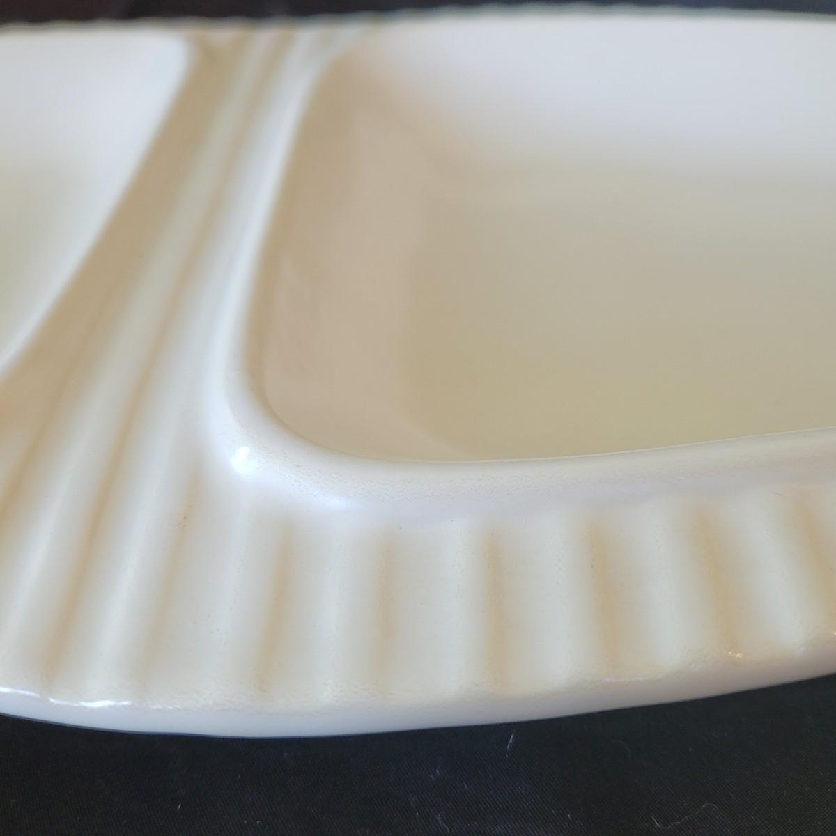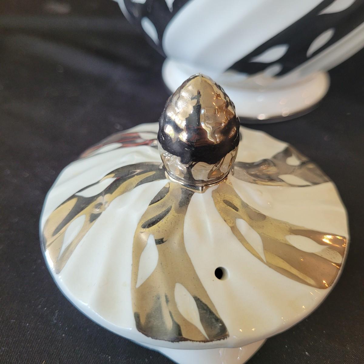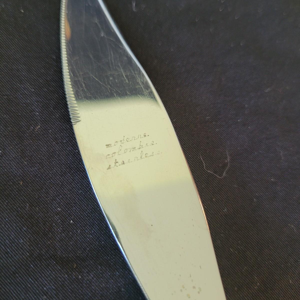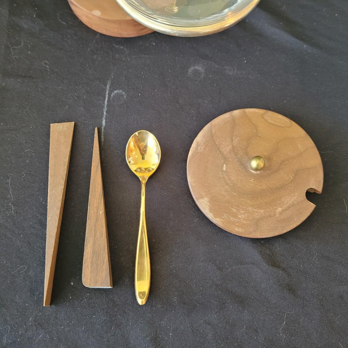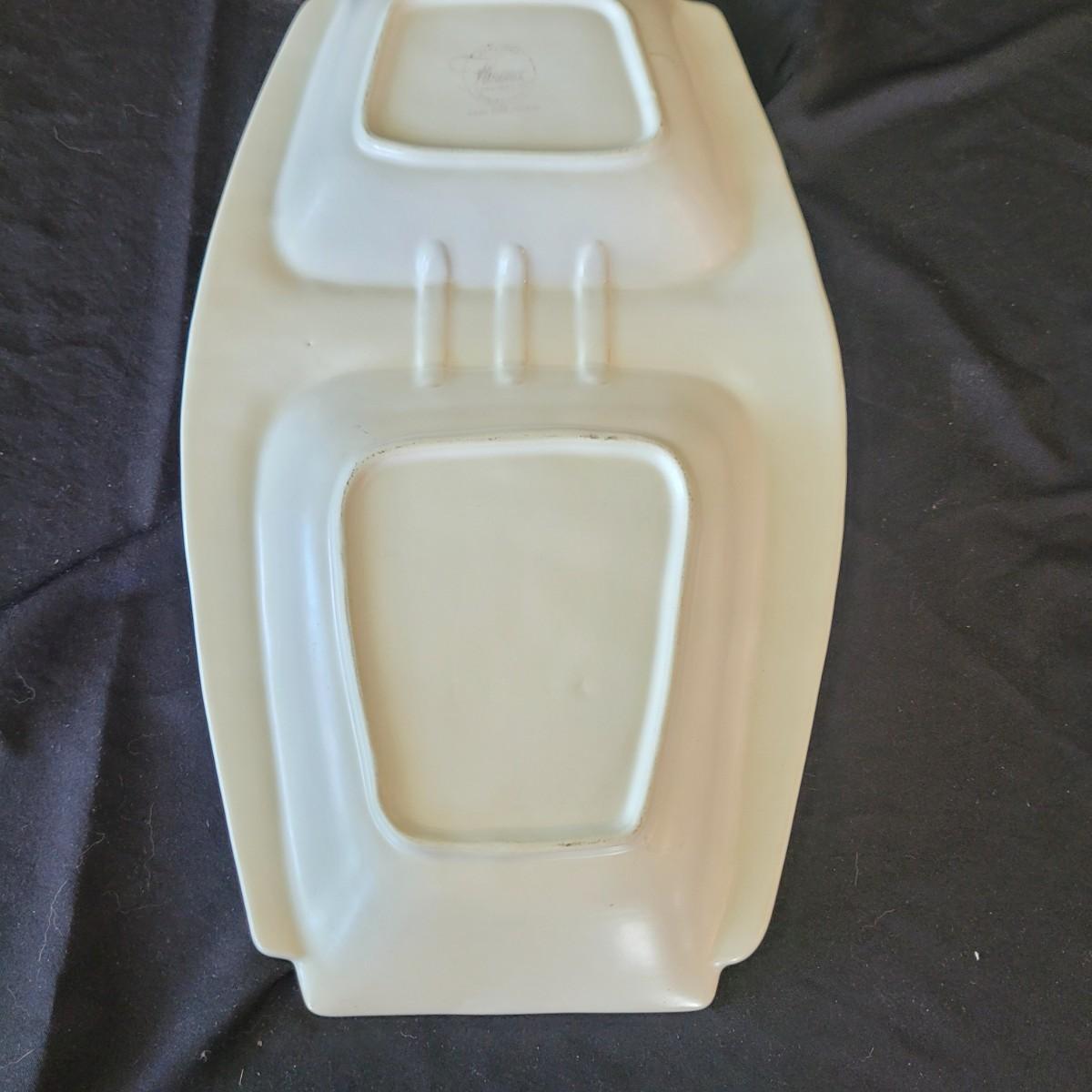 This fun collection of MCM kitchenware includes a silver plated Ellgreave England teapot, a Florence Ceramics semi porcelain serving tray, a MCM glass and wood swiveling condiment jar, Japanese metal mixing bowl, orange enamel coated baking tray, and a set of six wooden handled Moderna Columbia stainless steel steak knives. Orange baking tray measures approximately 14” x 9”. Shipping available.