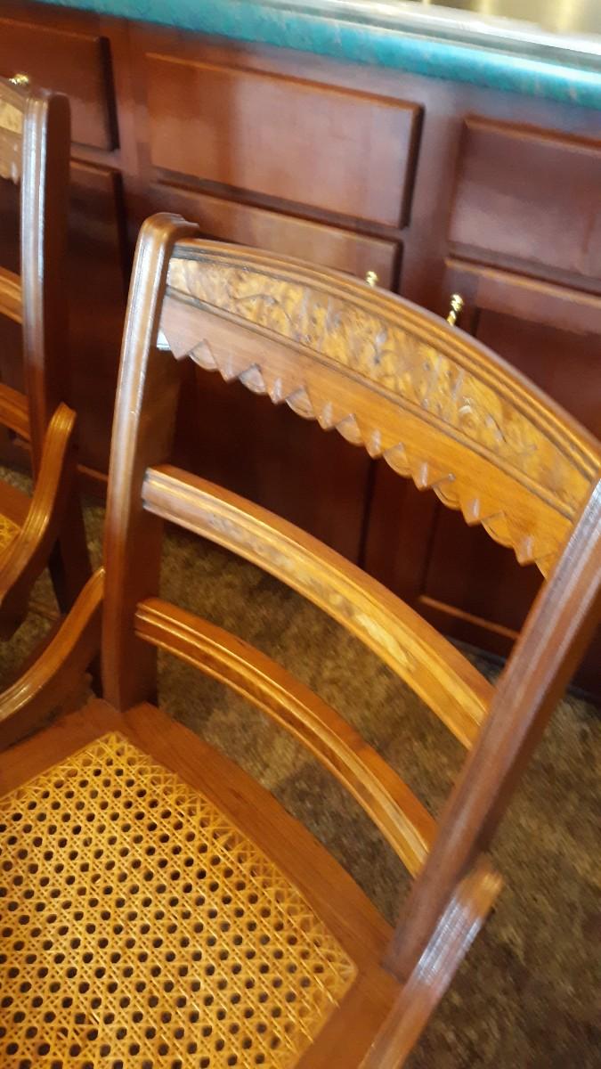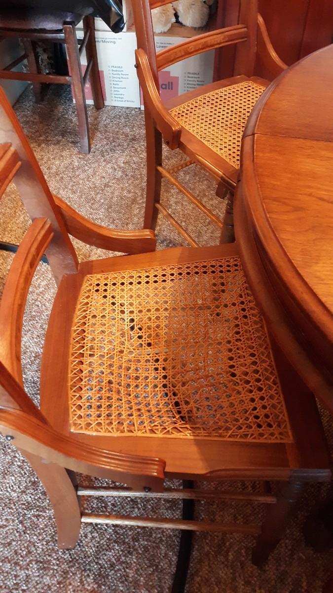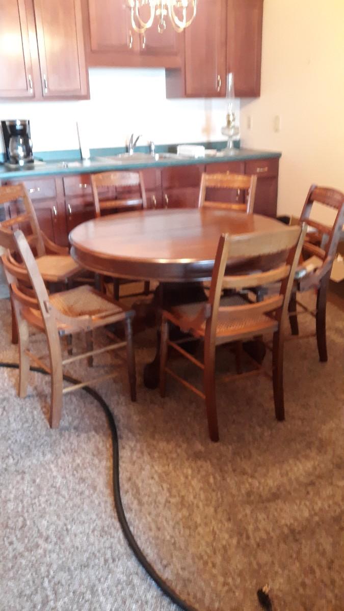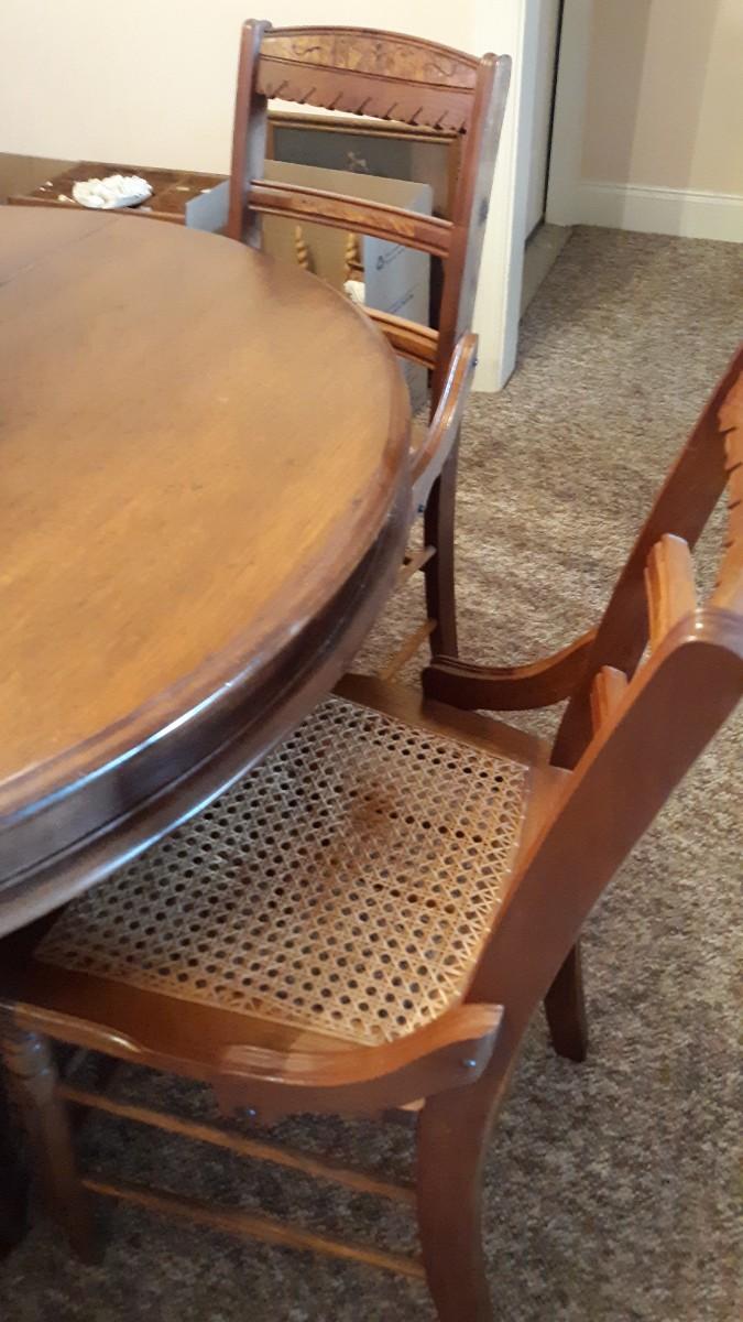 Round wooden dining table. Six chairs included. The seating in a few of the chairs (at least two) need to be refurbished. This set includes two leaf inserts. Beautiful carvings on the chairs. Nice! Use as a round kitchen table with four chairs or put in the inserts and use as oblong with six chairs. Many possibilities.