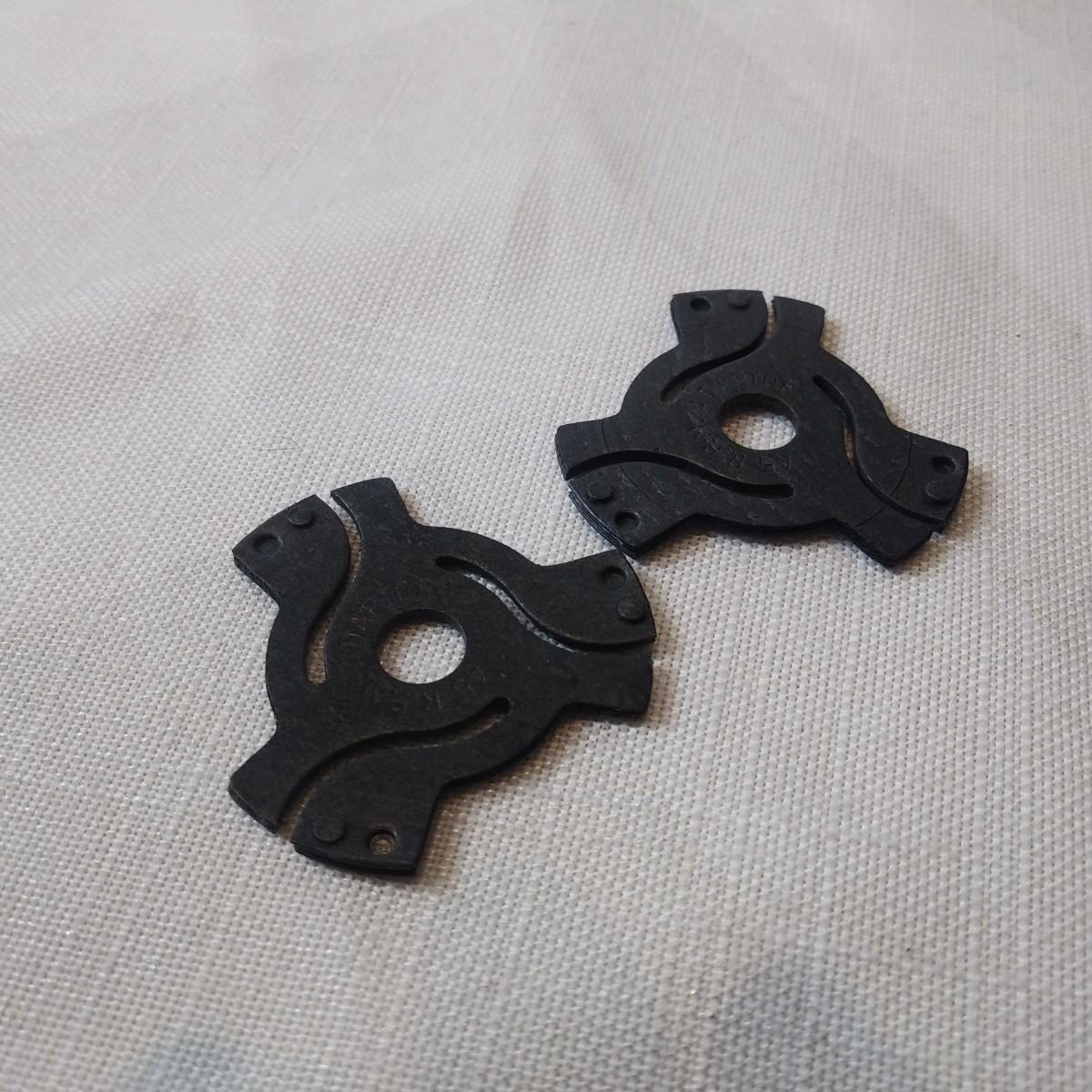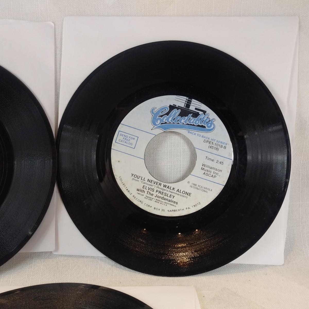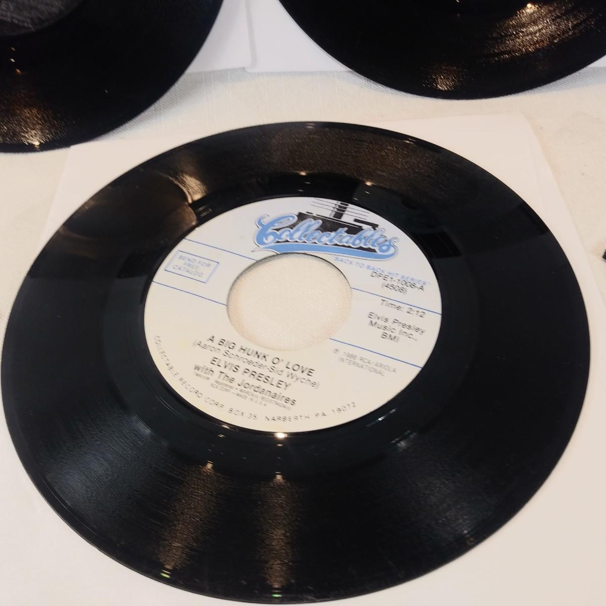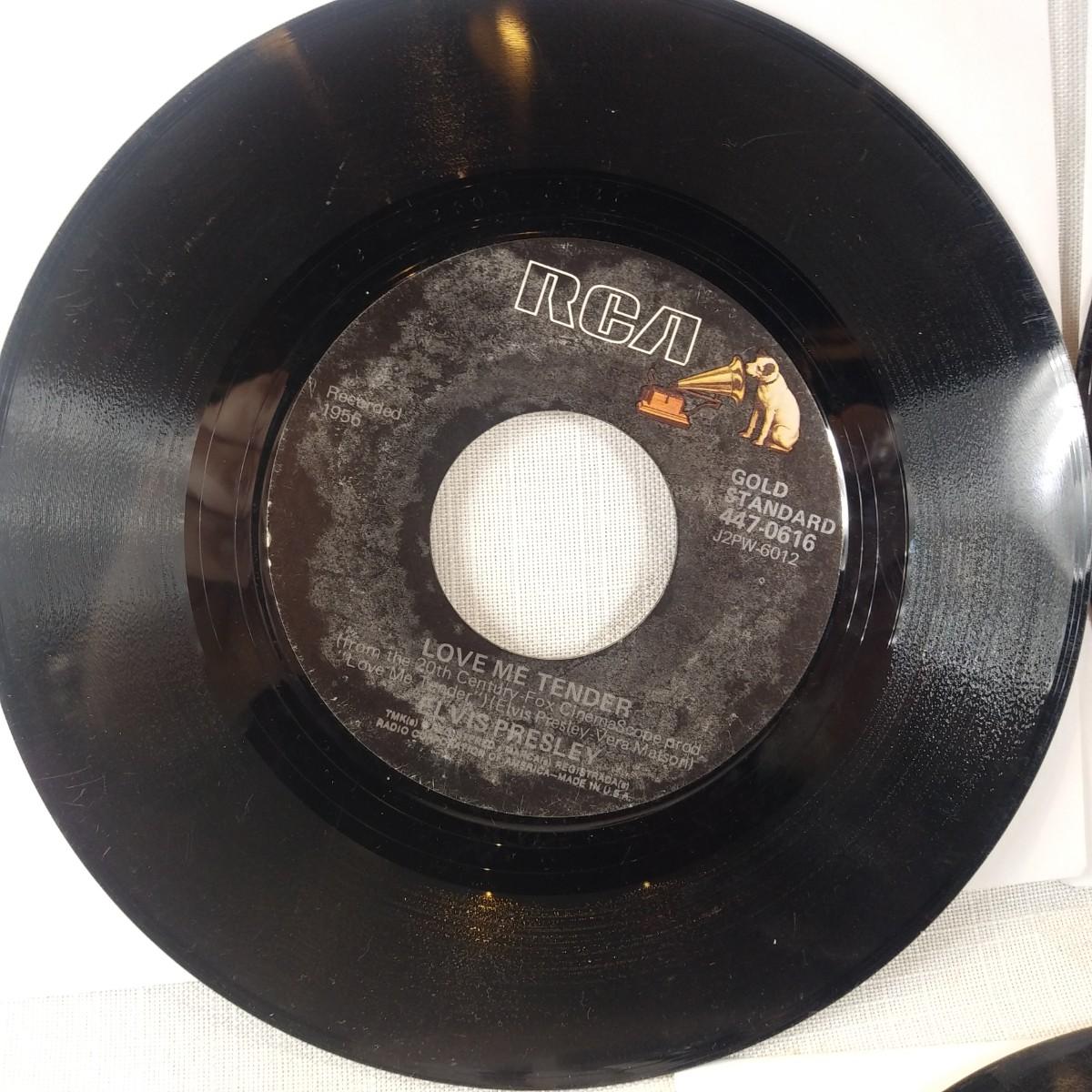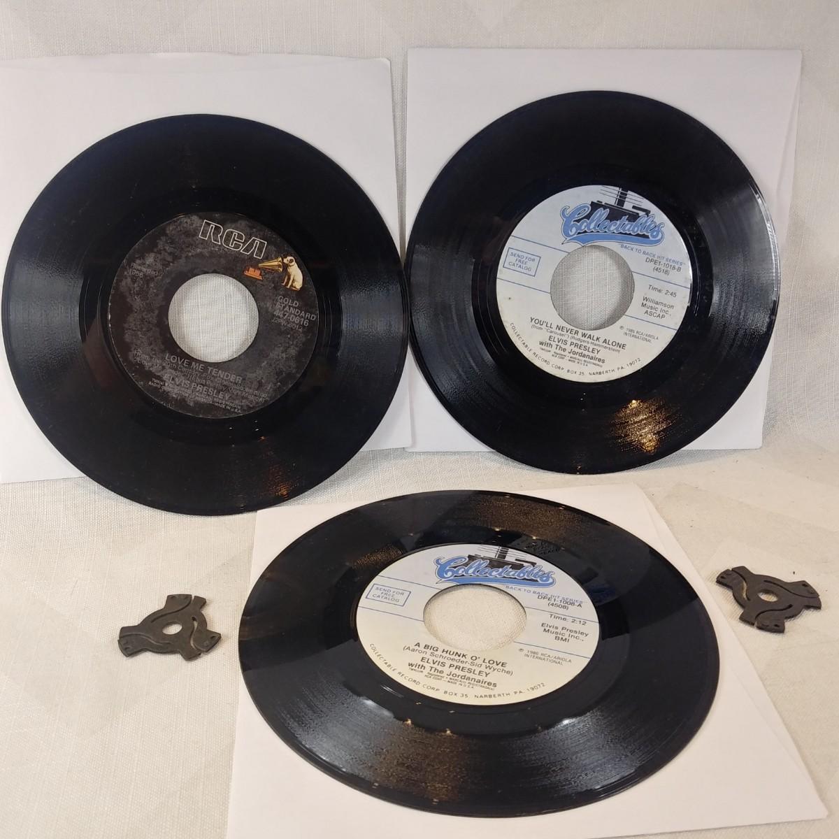 This is a grouping of Elvis Presley 45 rpm records. All are without original jackets. Their condition is consistent with age and use. This Lot C contains: Love Me Tender/Anyway You Want Me, A Big Hunk of Love/My Wish Came True and You'll Never Walk Alone/Old Shep. This lot also includes two 45 disc stereo adapters.