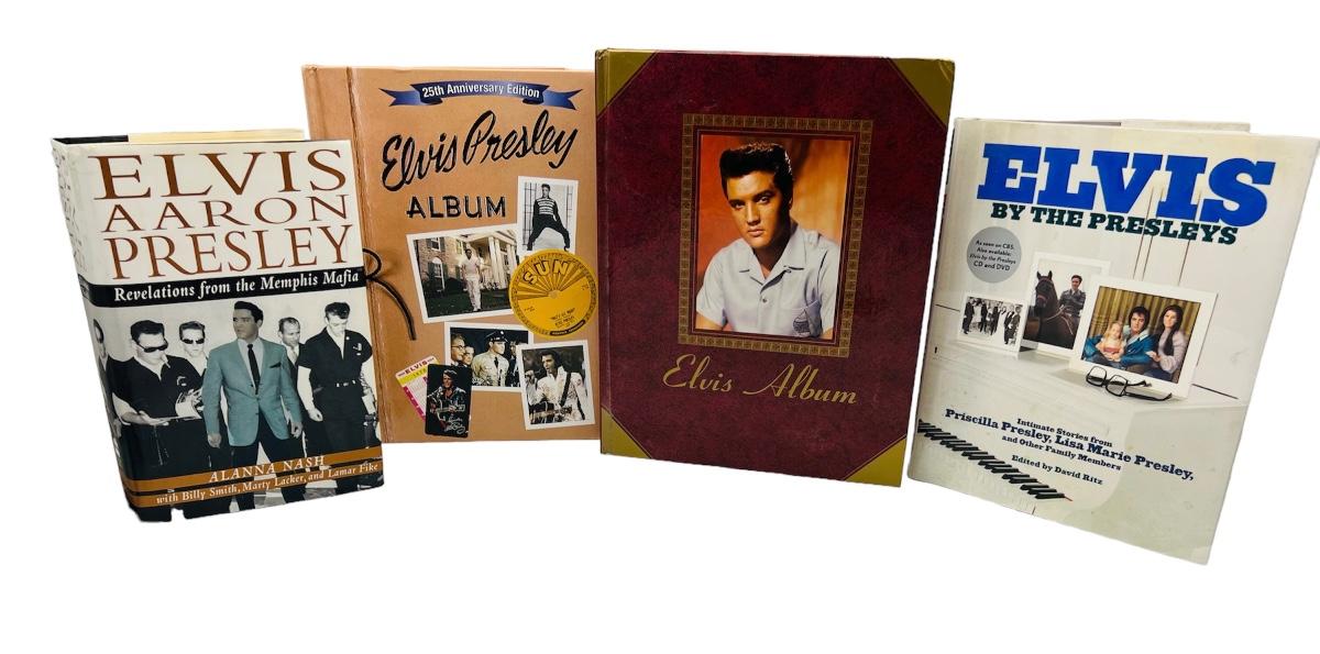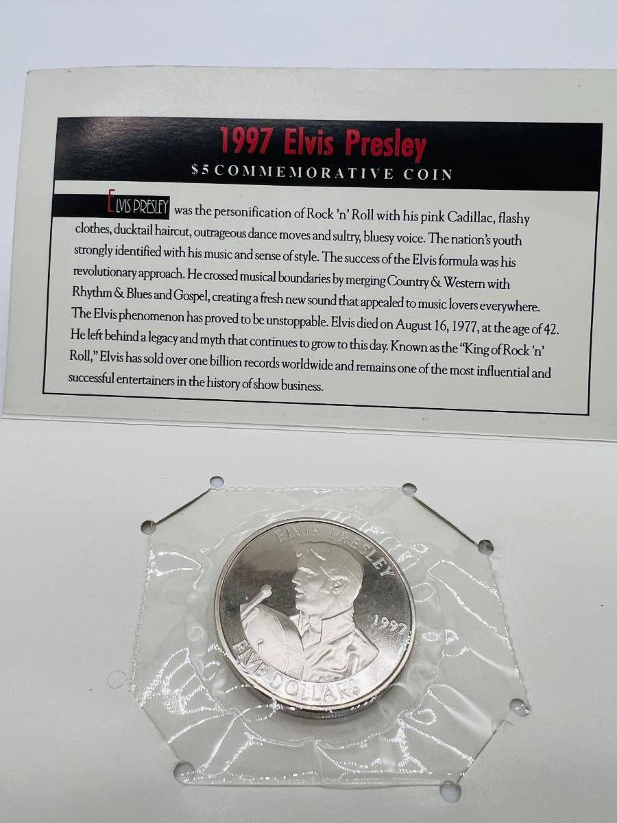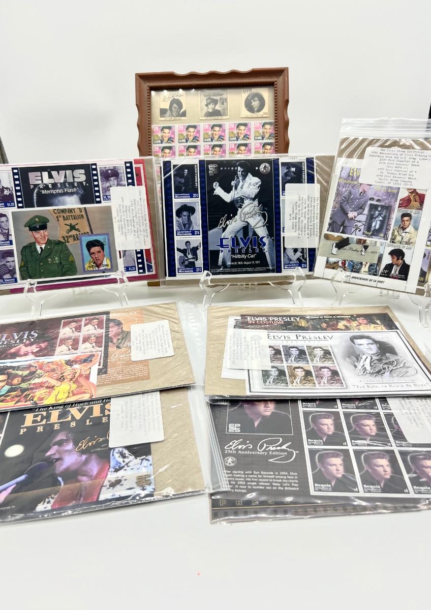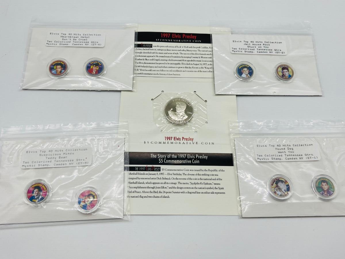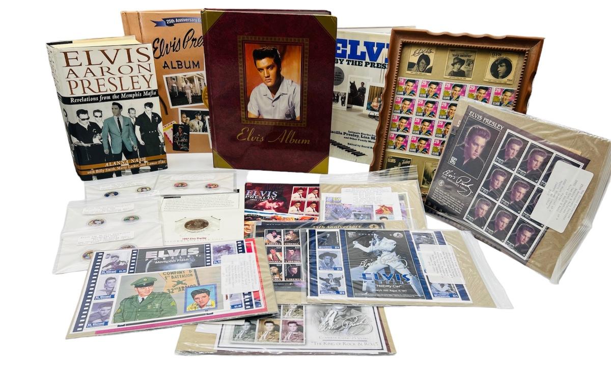 Huge Elvis Lot- 8 Tennessee quarters, 15 dollar commemorative coin 1997, seven bagged mint stamps, one frame of stamps and 4 Elvis books