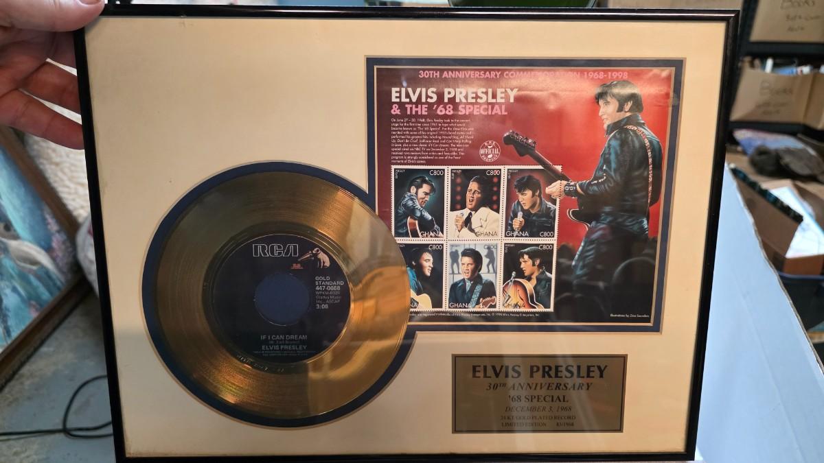 This officially licensed Elvis Presley commemorative display was produced to mark the 30th anniversary of the legendary 1968 television special. The framed presentation features a 24-karat gold-plated RCA 45 RPM record of “If I Can Dream,” paired with a Ghana stamp sheet celebrating Elvis’s ’68 Special performance era. A brushed metal plaque within the mat identifies this piece as a limited edition, numbered 83 of 1968 produced, while the rear backing carries the Elvis Presley Enterprises licensing hologram and trademark notice confirming authenticity as an official Elvis collectible product.