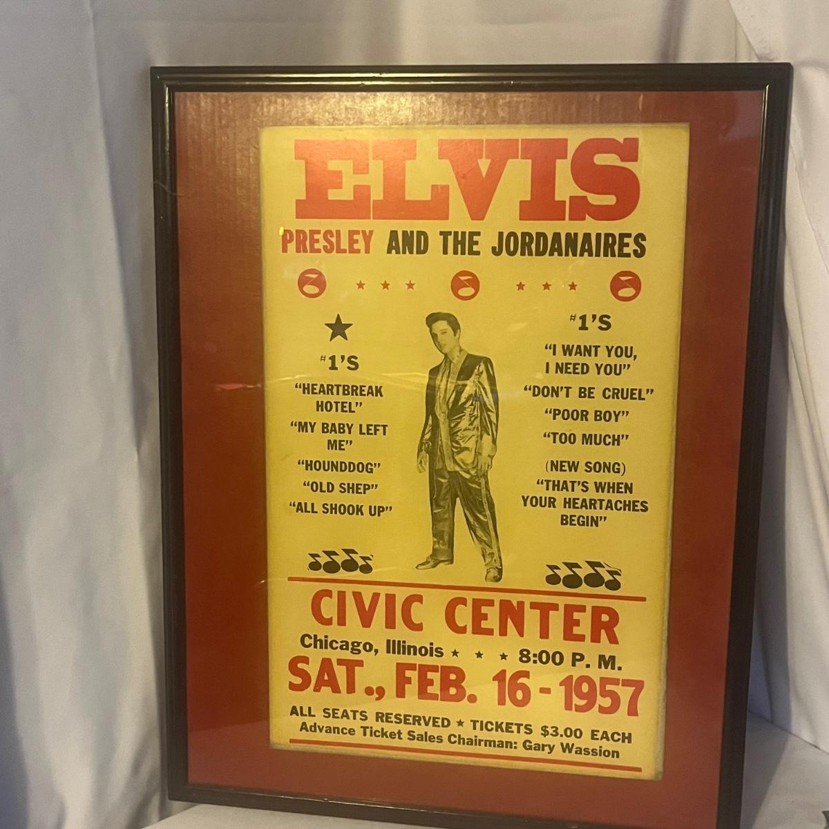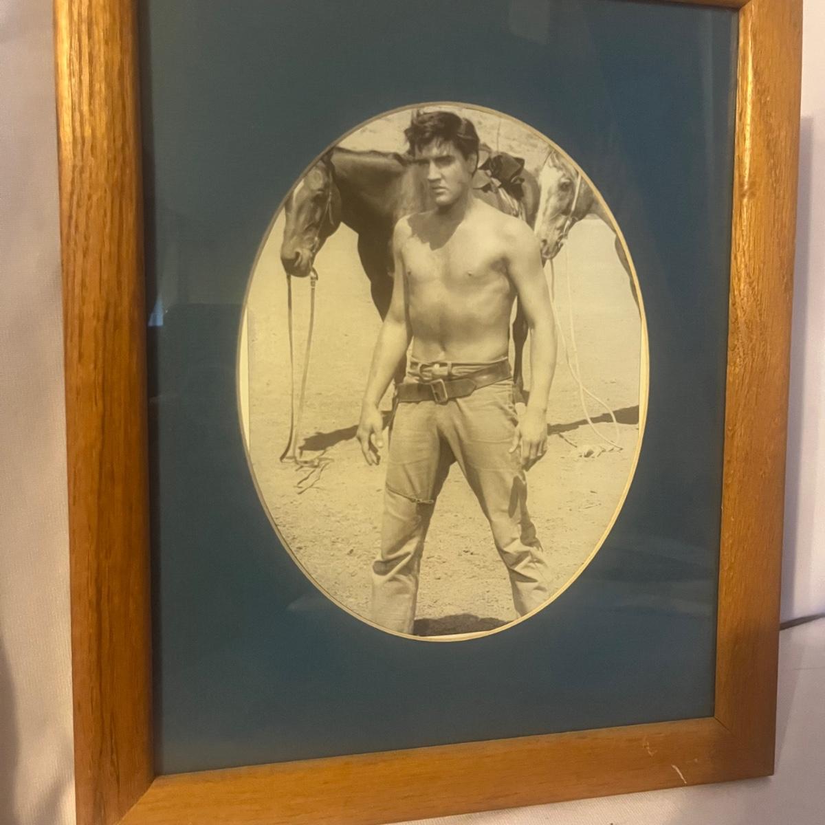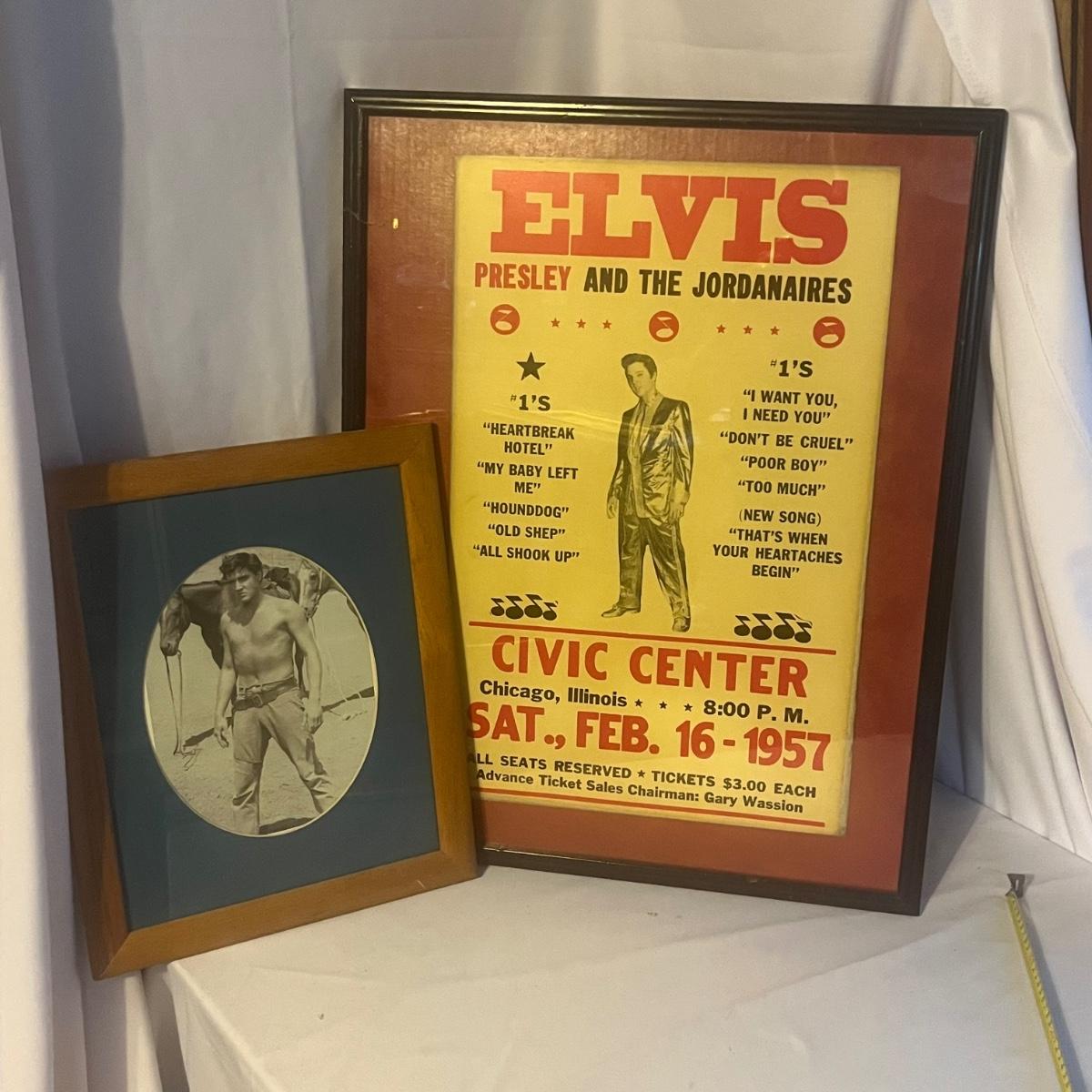 Lot includes an Elvis Presley and the Jordanaires framed poster, frame is plastic, a wood framed photo of Elvis with horses and six photos of Elvis in concert. Also includes a hardcover book titled Elvis and the Colonel. Largest frame measures 20” x 26”.