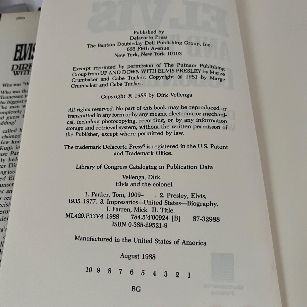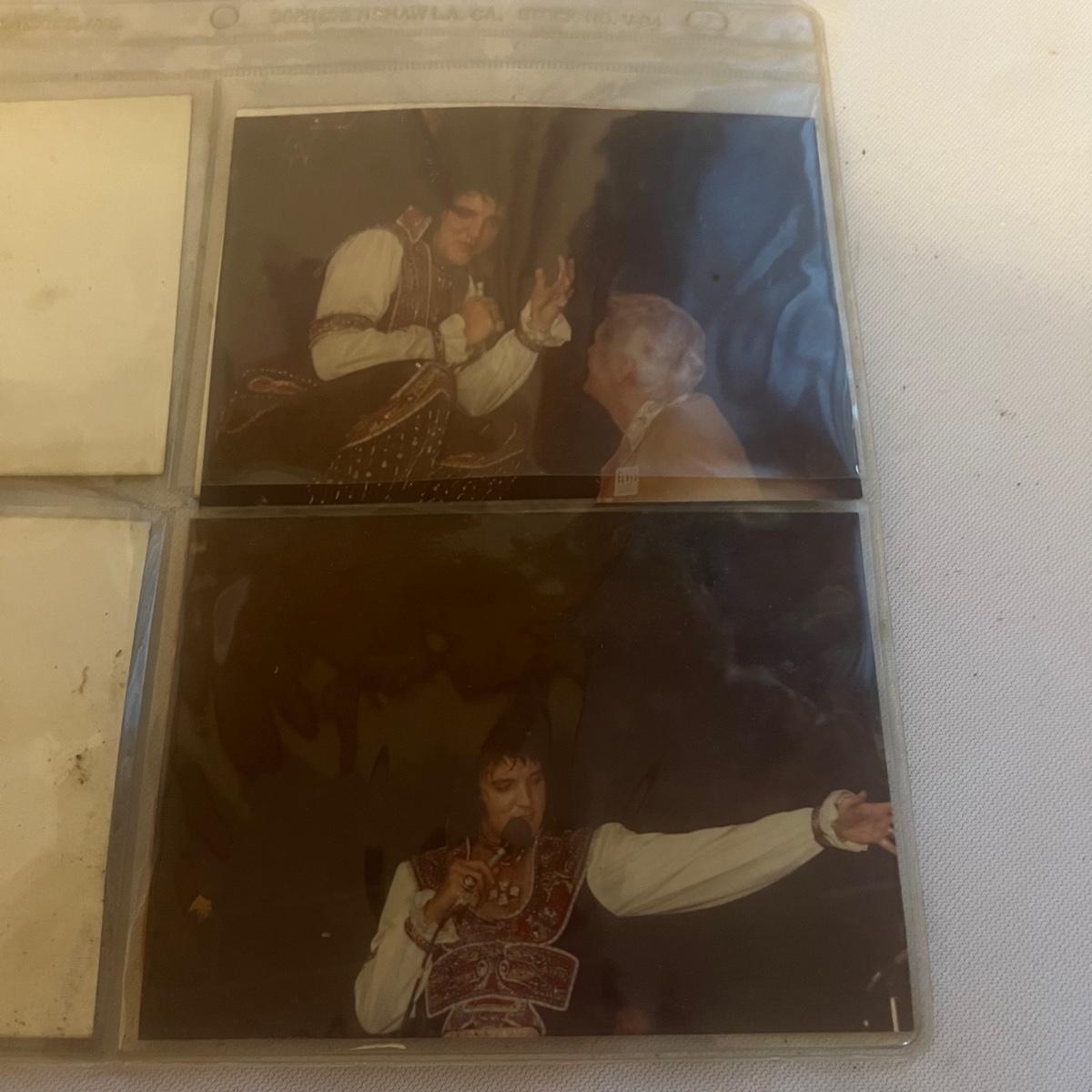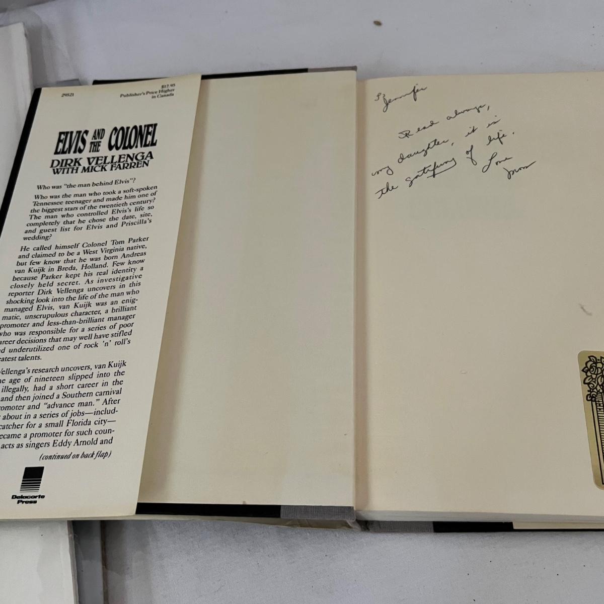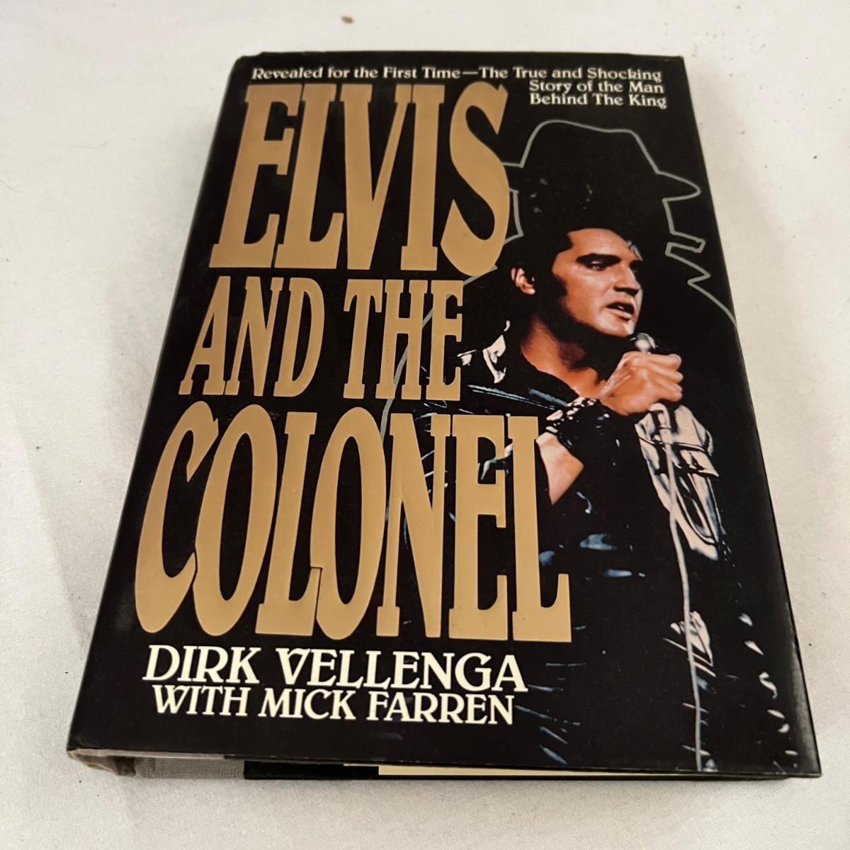 Lot includes an Elvis Presley and the Jordanaires framed poster, frame is plastic, a wood framed photo of Elvis with horses and six photos of Elvis in concert. Also includes a hardcover book titled Elvis and the Colonel. Largest frame measures 20” x 26”.