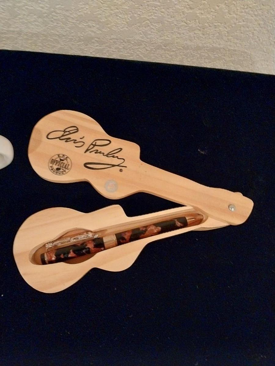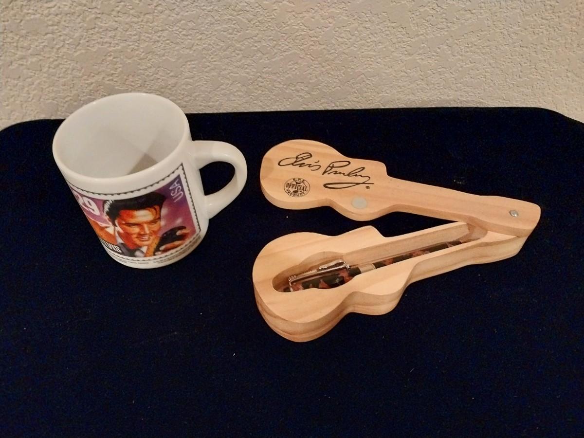ELVIS PRESLEY PEN IN A WOODEN GUITAR BOX, COFFEE MUG