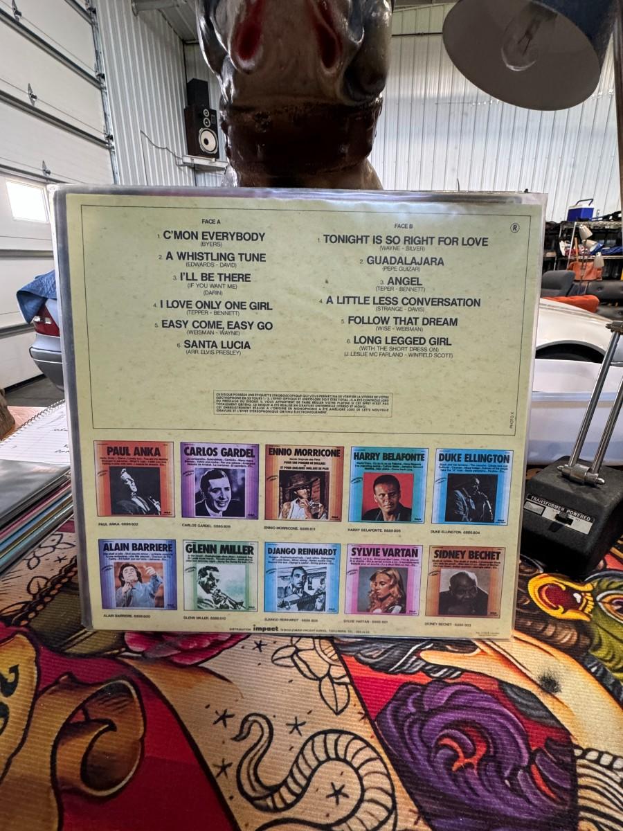 Tracklist Highlights: The album cover lists several Elvis hits, such as "Tonight is so right for love," "I'll be there," "C'mon everybody," "Easy come, easy go," "Long legged girl," "A little less conversation," and "Angel" [0].