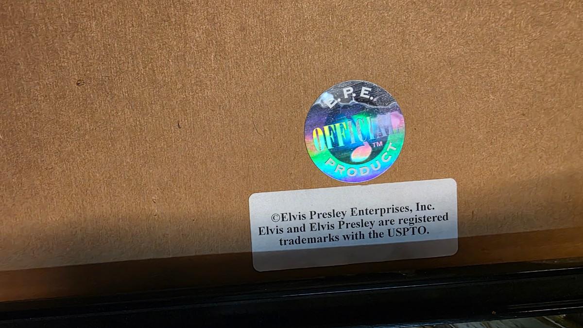 The reverse of the frame carries official Elvis Presley Enterprises authentication markings, confirming this as a licensed commemorative collectible rather than a sales award. The gold-plated record surface shows light natural texturing consistent with the plating process, and the photographs and matting remain clean and well-presented. The frame is solid and display-ready, making this an excellent piece for music memorabilia collectors, Elvis enthusiasts, or vintage pop-culture décor.