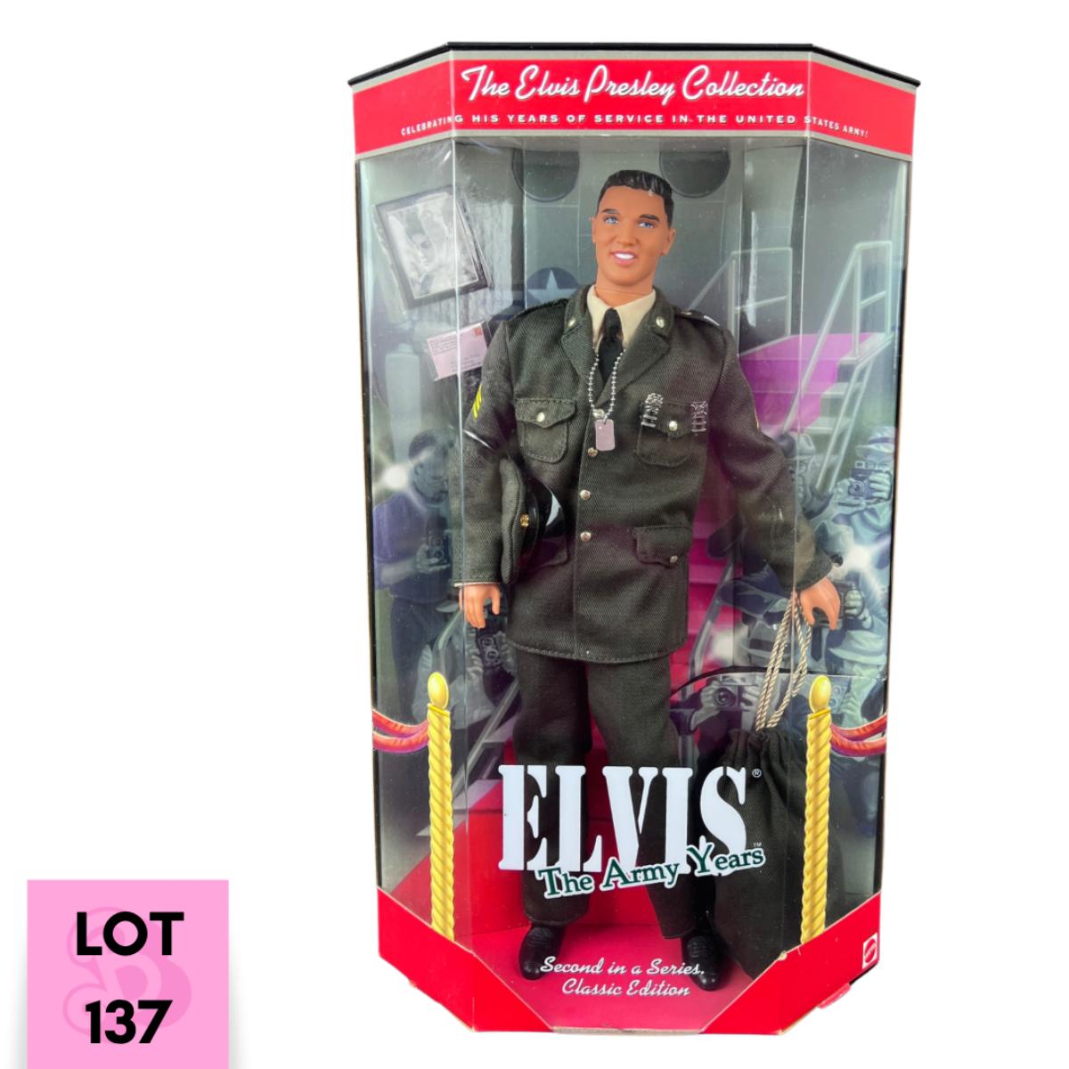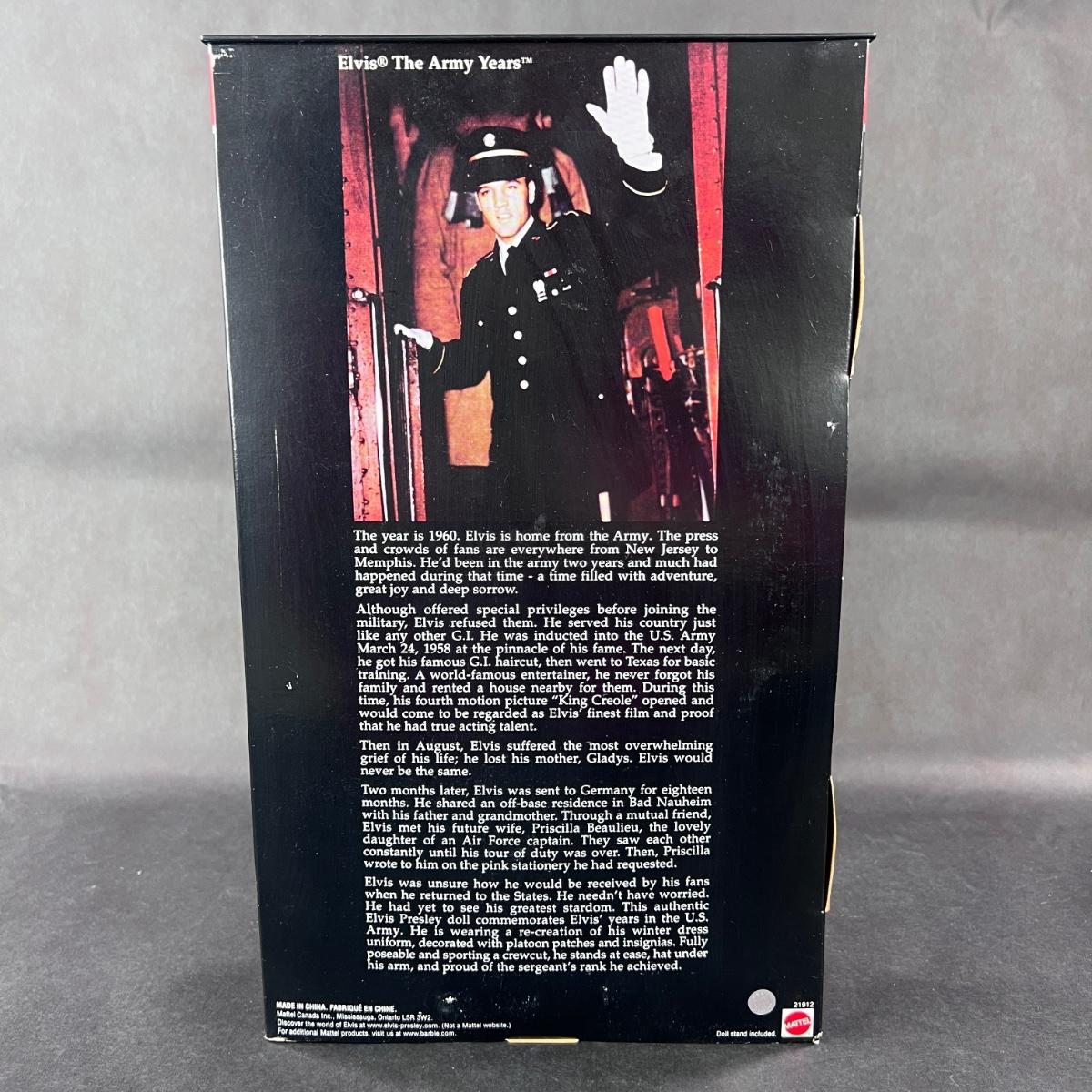 This Elvis Doll, part of The Elvis Presley Collection, depicts Elvis in The Army Years. This doll was produced in 1999 by Mattel. This doll has not been out of its box. **|** Please see photos for details and condition. ::: Shipping is available on this lot. If you require shipping you must let us know at the close of the auction. We will coordinate with you after the item has been won. Shipping fees will include insurance up to or exceeding the value of all items being mailed. If you have any questions regarding this lot please contact the auctioneer either via this website, by direct email or by phone. PICK UP TIMES and other important information can be found in the TERMS and DESCRIPTION of the auction. Please take a look for pertinent information. Thanks!