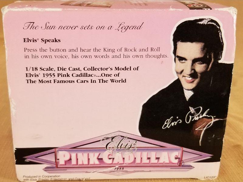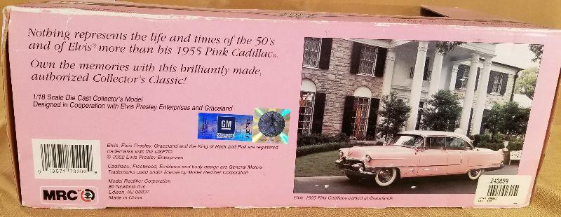Elvis Pink Cadillac ““ Die Cast Collector Car. Never Opened. Manufactured by MRC Corporation in. 2002 to 1/18th scale. There is a small tear in the plastic box cover, box shows a little wear. What a great collectors piece.