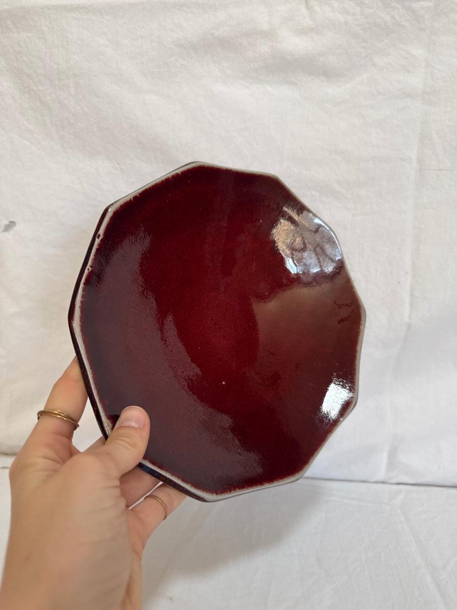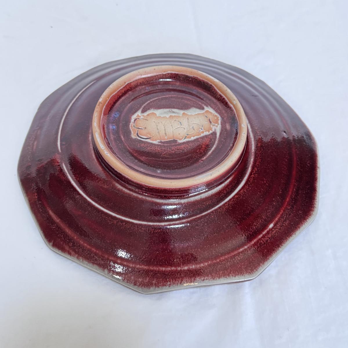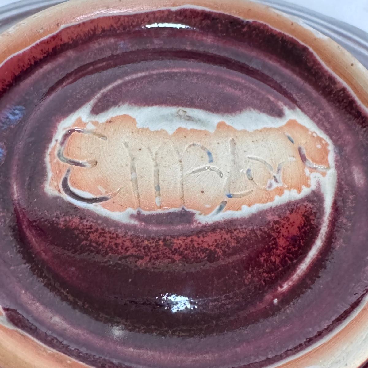 This lot includes one deep red ceramic dish made by Em Block Pottery. The plate is signed by Em Block on the back. The dish measures 9”D x 2”H. Shipping available.