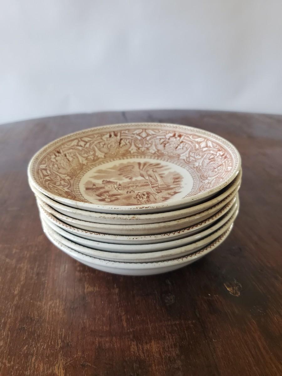 Set of 7 small/dessert bowls. 5.75 inches diameter. 4 are chipped or cracked.
