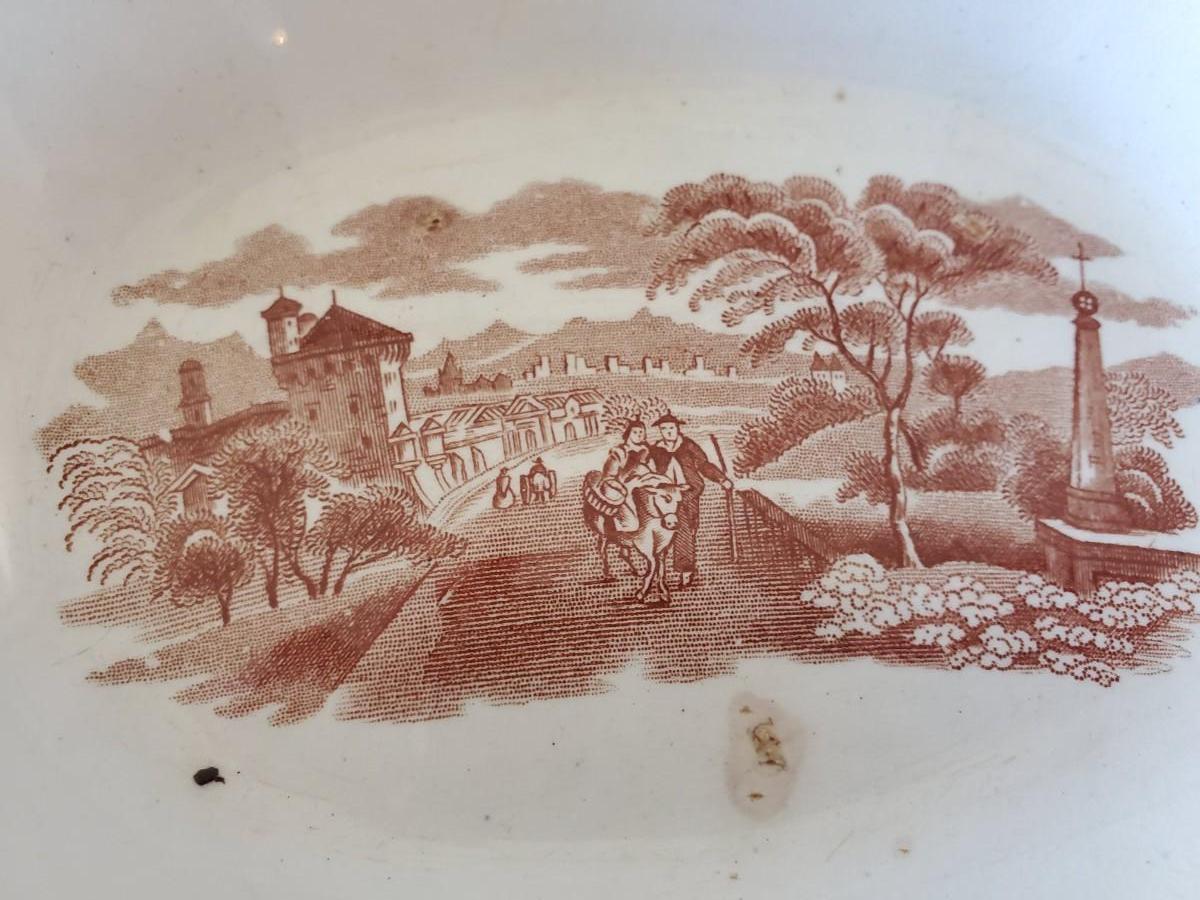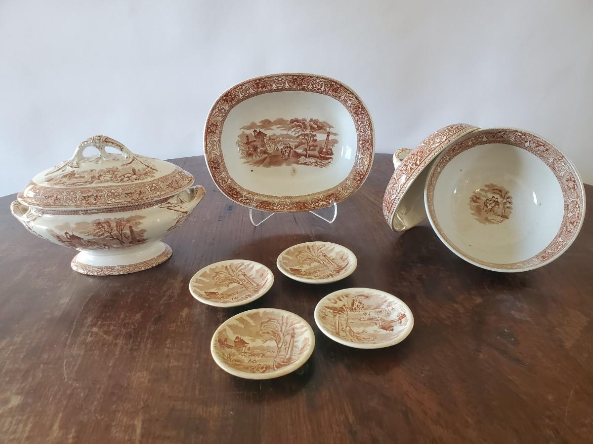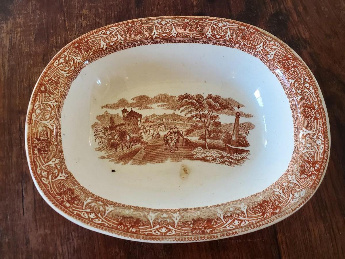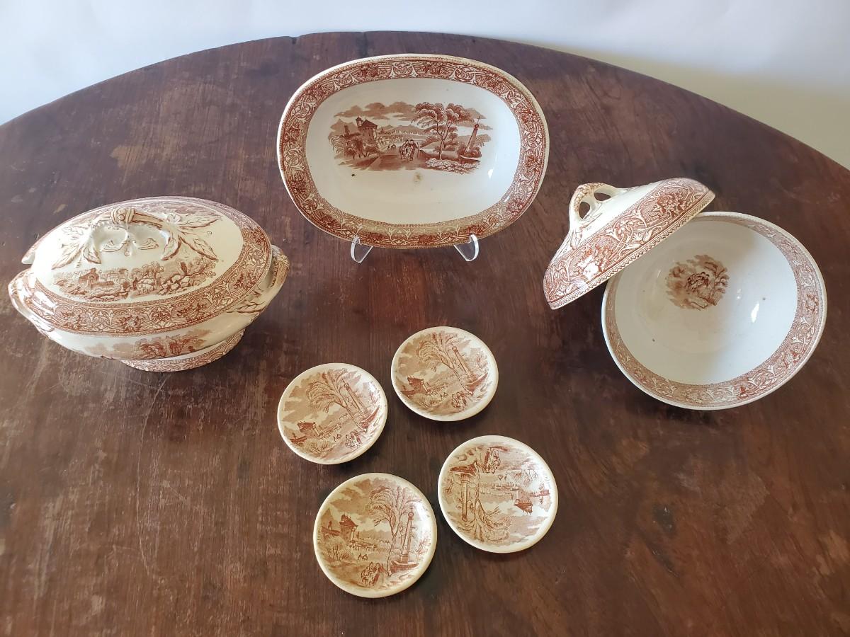 Edge, Malkin & Co. Made in England. Italian Scenes from: Isola di Sora, Isle Gandolfa, Como, & Naples. Small tureen 5 inches tall by 8 inches wide (missing its spoon), 4 butter pats (3 inches), 1 cereal bowl (5.5 inches), 1 small serving dish (8 by 6 inches), 1 misc. round lid with a handle (5 inches).