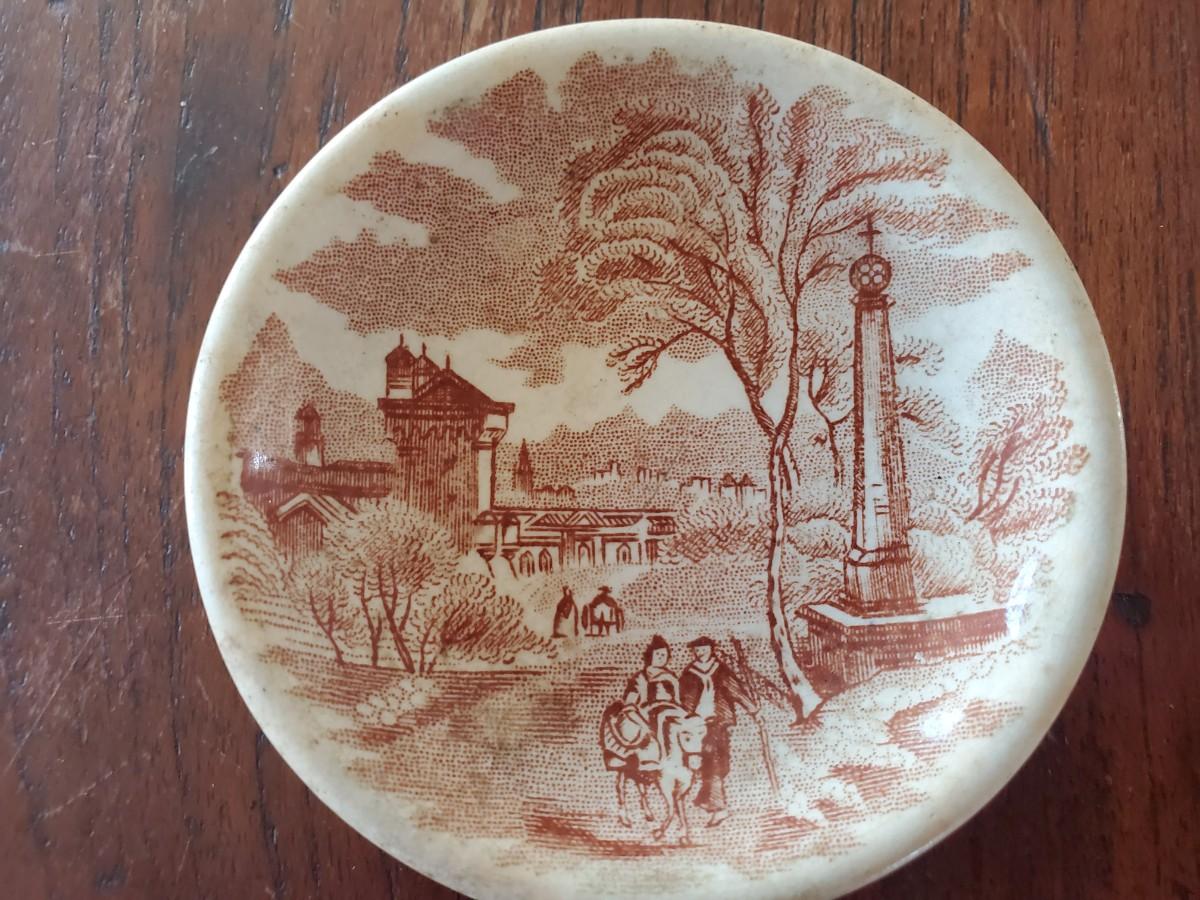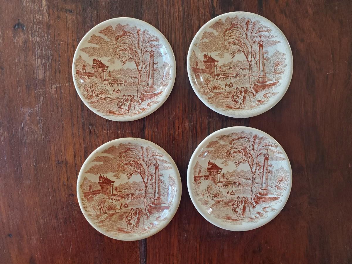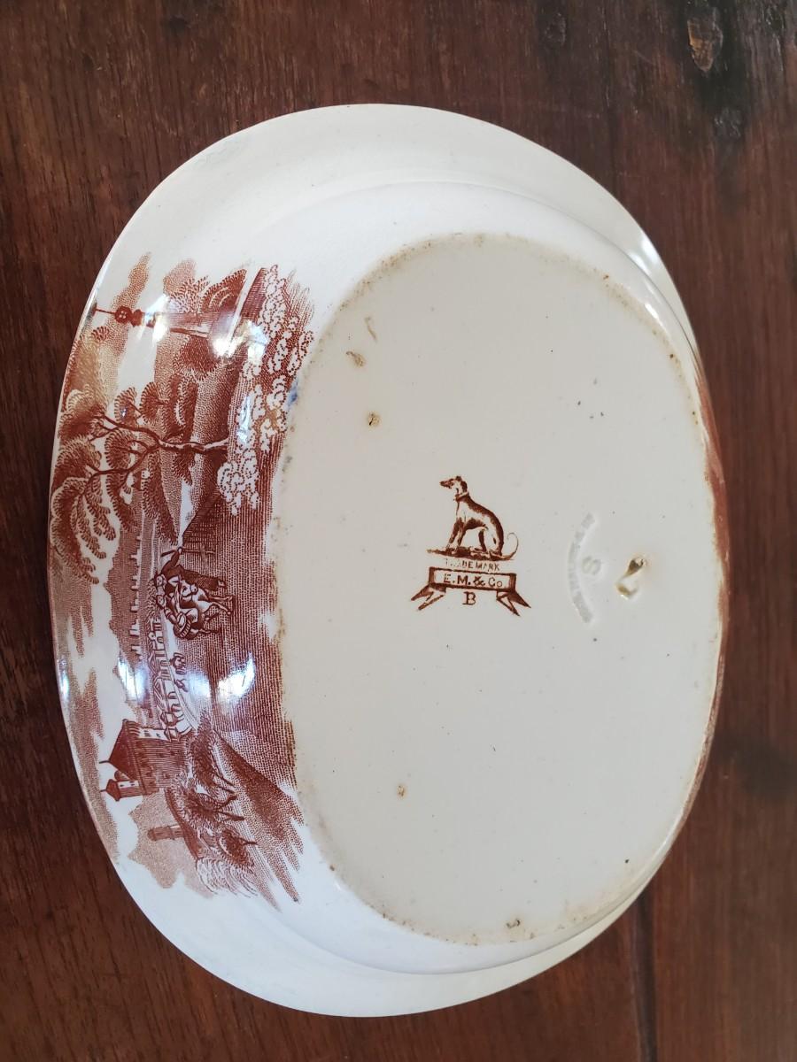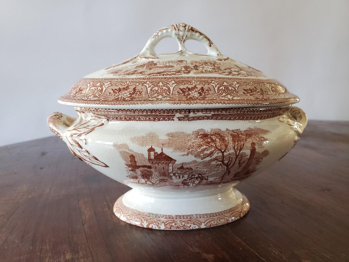 Edge, Malkin & Co. Made in England. Italian Scenes from: Isola di Sora, Isle Gandolfa, Como, & Naples. Small tureen 5 inches tall by 8 inches wide (missing its spoon), 4 butter pats (3 inches), 1 cereal bowl (5.5 inches), 1 small serving dish (8 by 6 inches), 1 misc. round lid with a handle (5 inches).