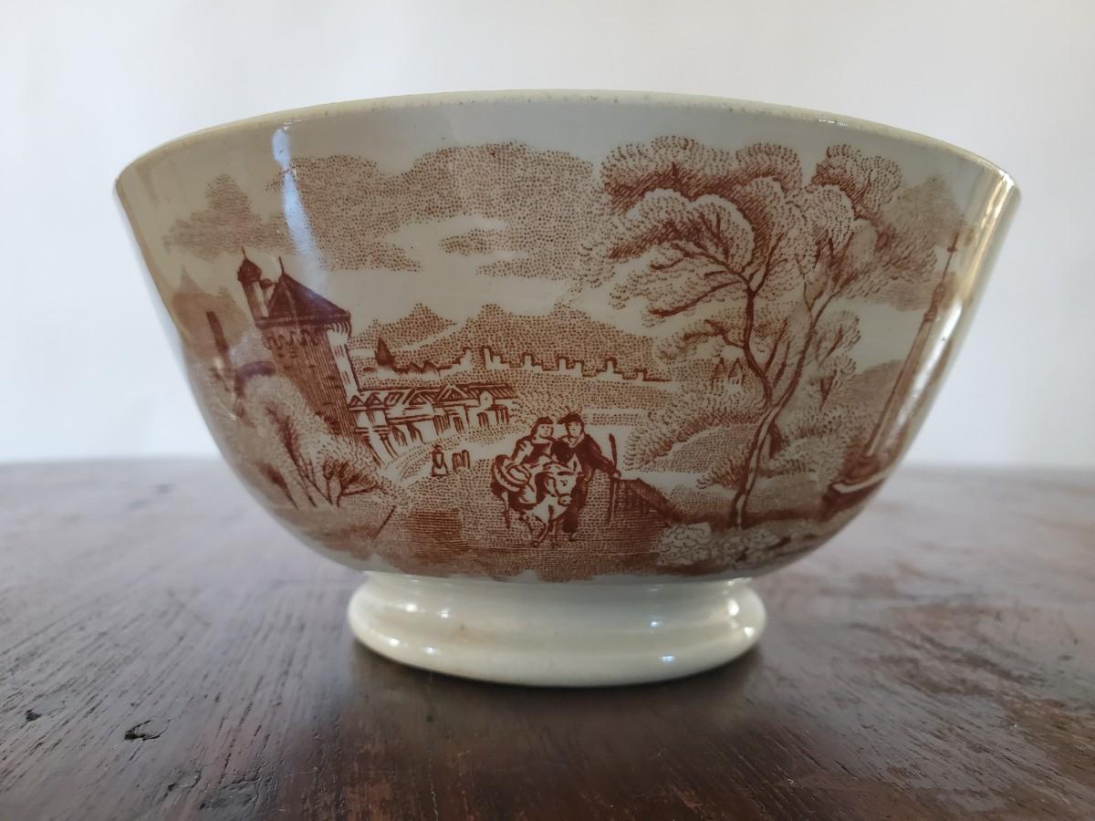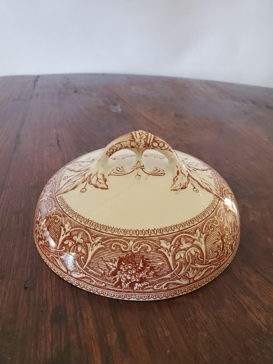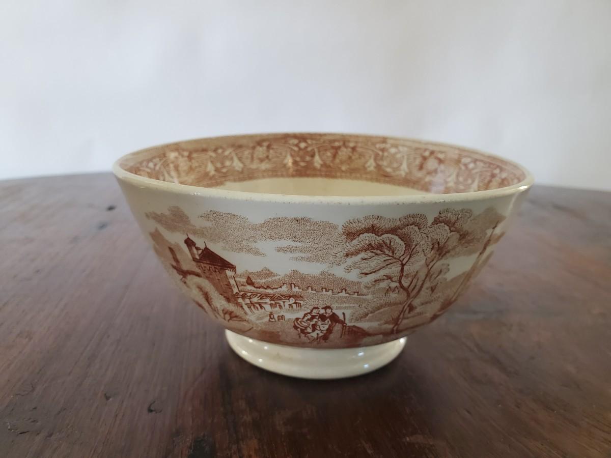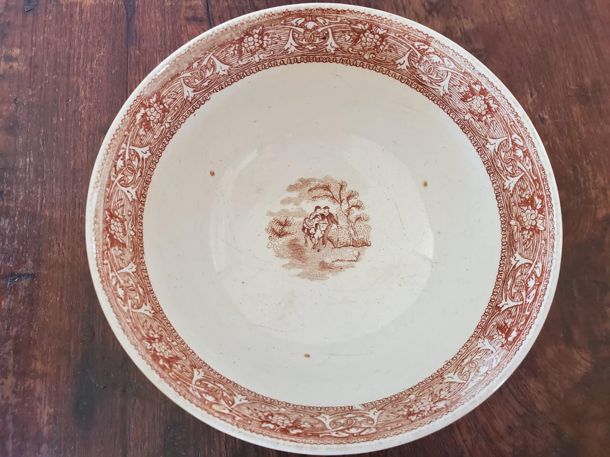 Edge, Malkin & Co. Made in England. Italian Scenes from: Isola di Sora, Isle Gandolfa, Como, & Naples. Small tureen 5 inches tall by 8 inches wide (missing its spoon), 4 butter pats (3 inches), 1 cereal bowl (5.5 inches), 1 small serving dish (8 by 6 inches), 1 misc. round lid with a handle (5 inches).