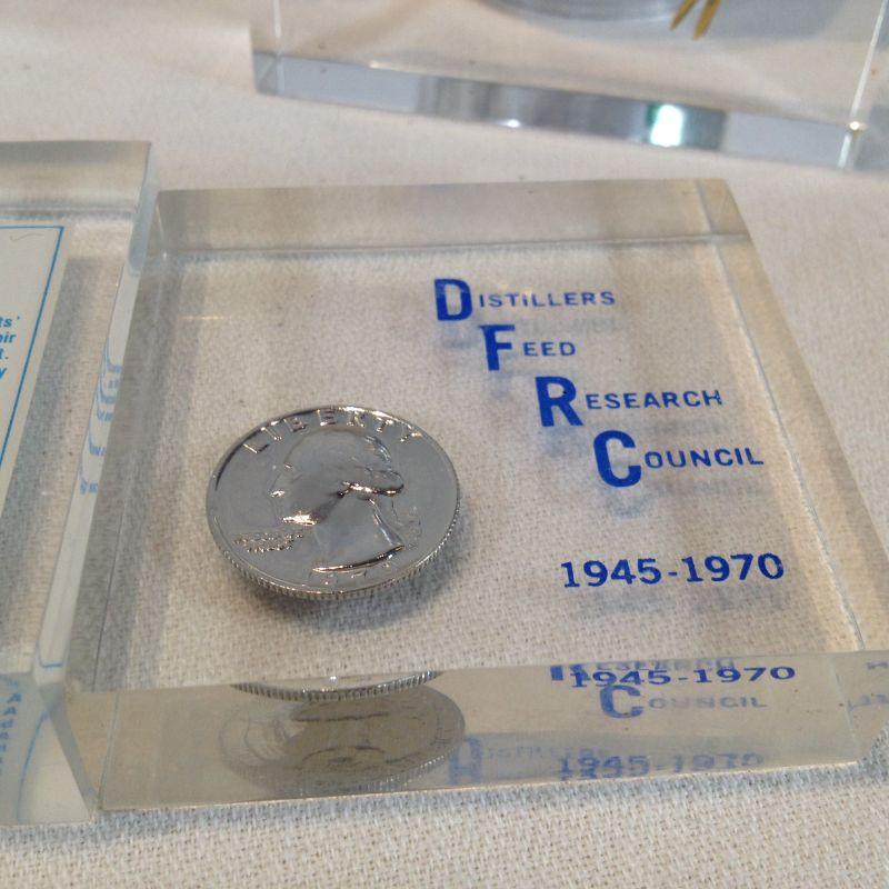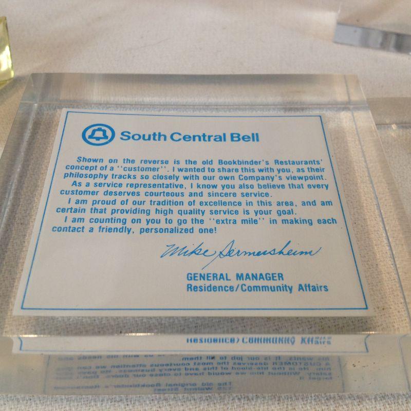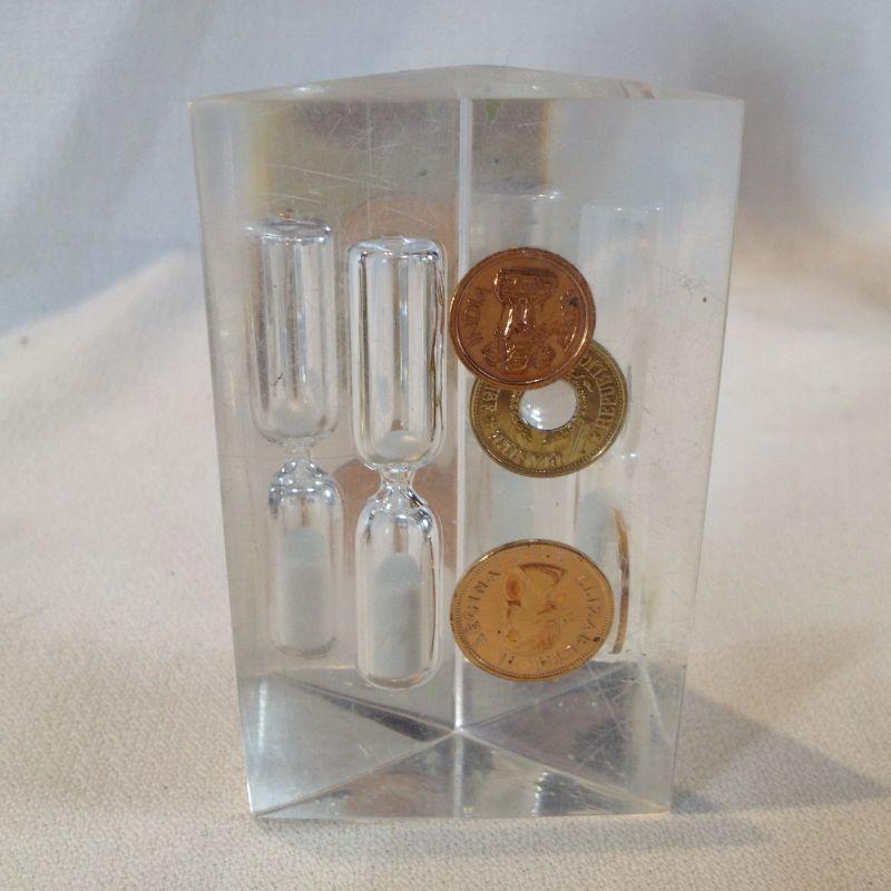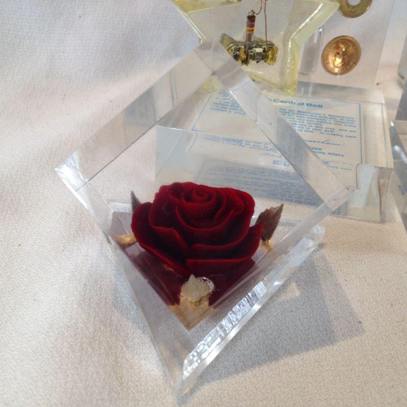 This offering is an unusual grouping of items embedded in Lucite. There are advertising items, a rose, a timer and a star night light. There are 6 items total. All are in very good condition.
