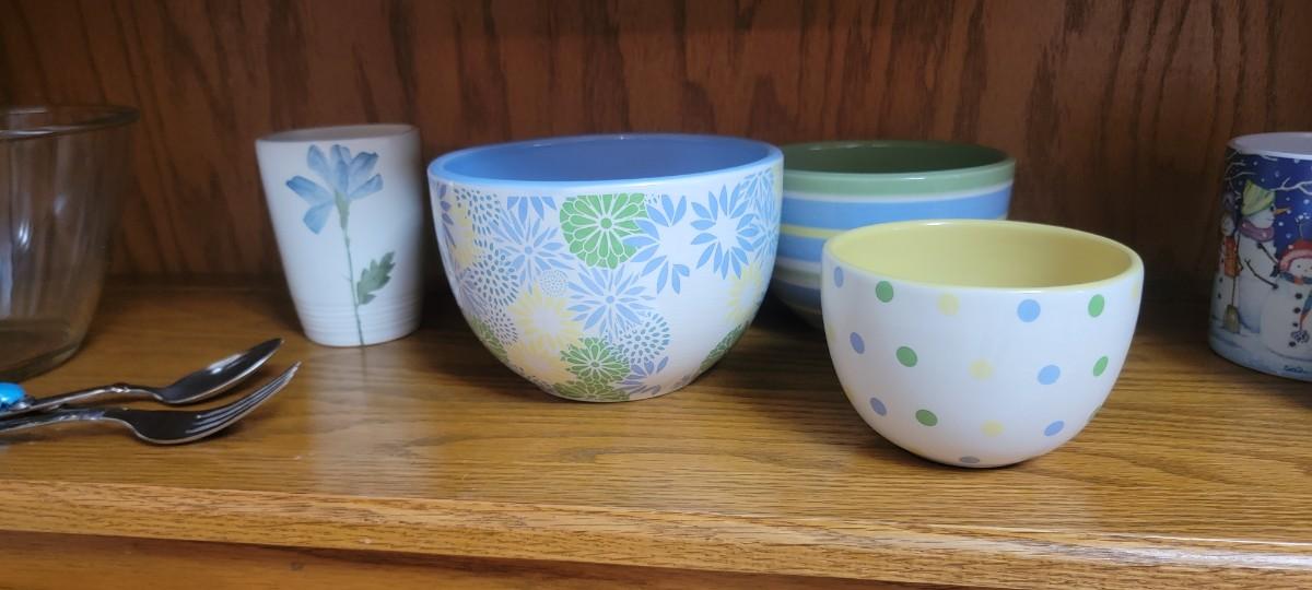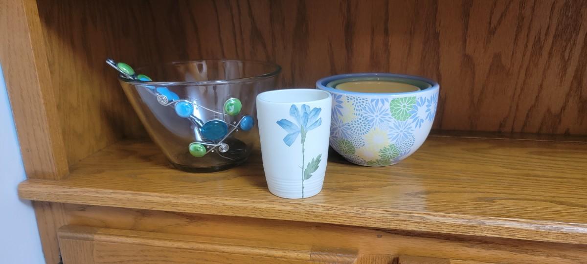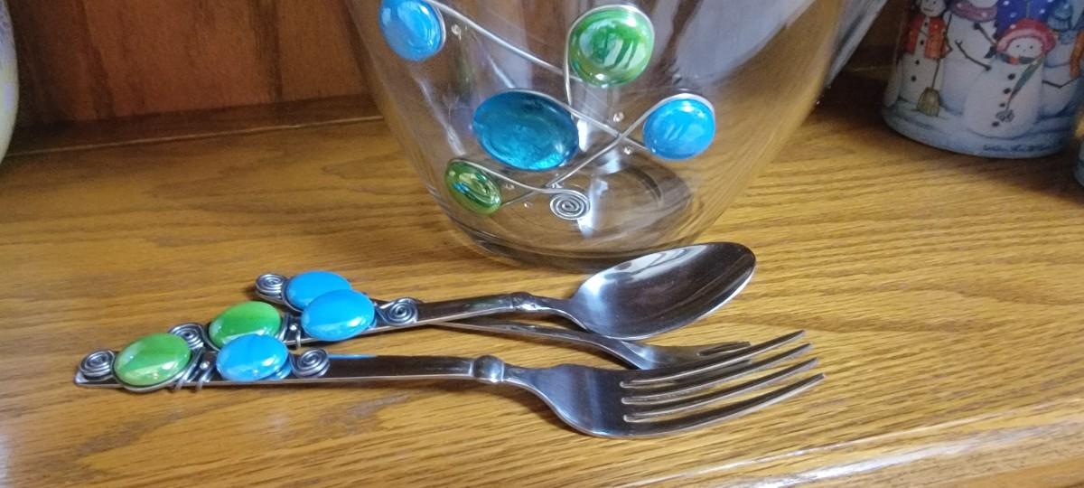 Embellished serving bowl with coordinating forks and spoon. Trio serving bowls, and vase.