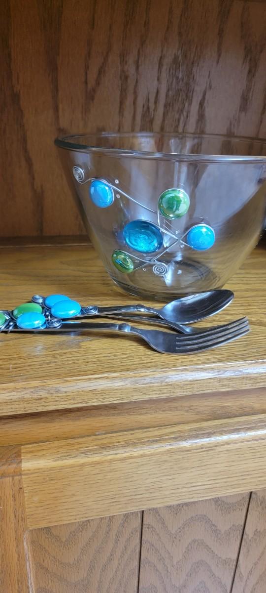 Embellished serving bowl, coordinating forks and spoon, trio stacking bowls