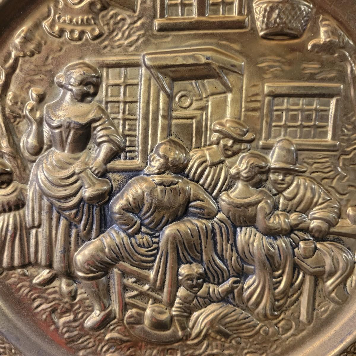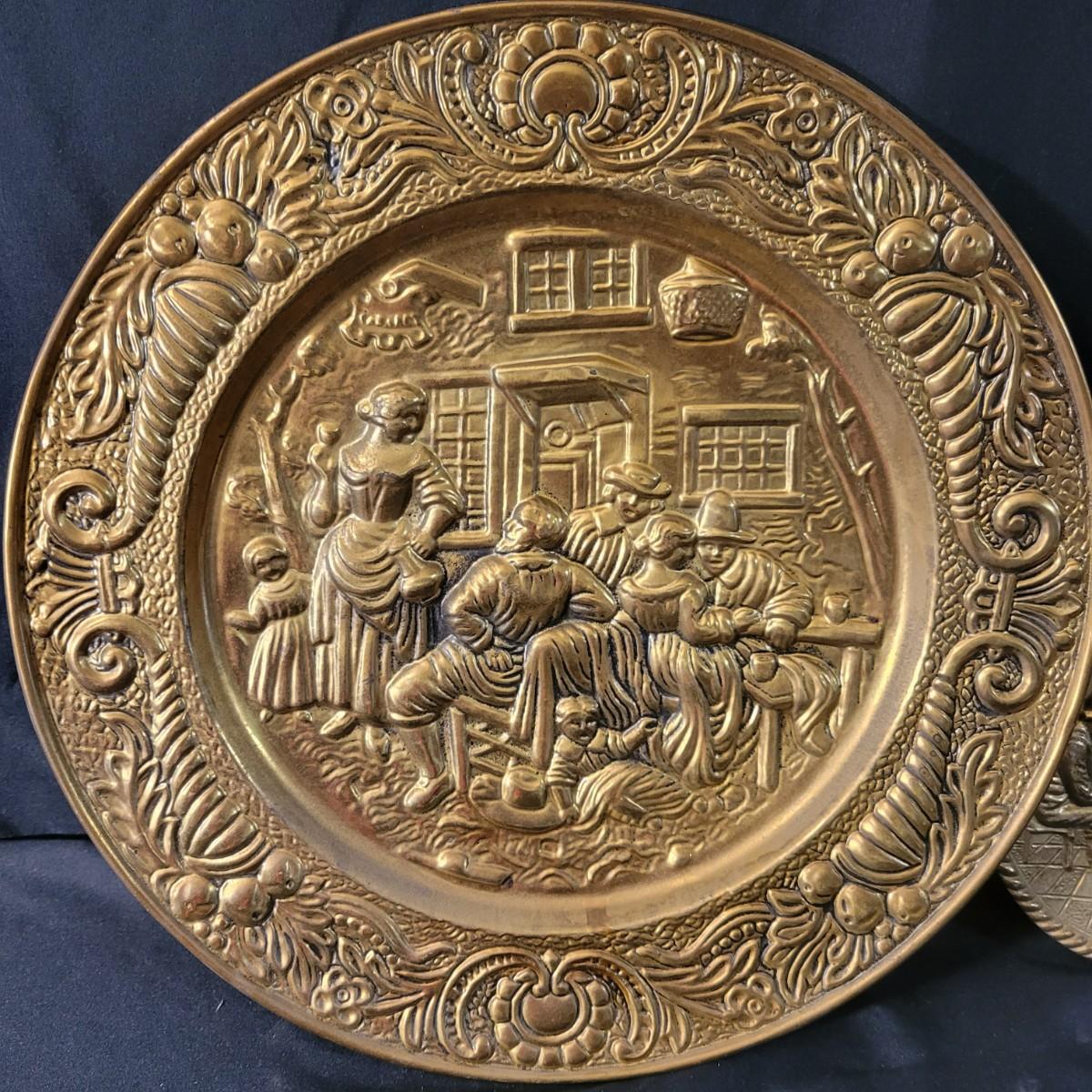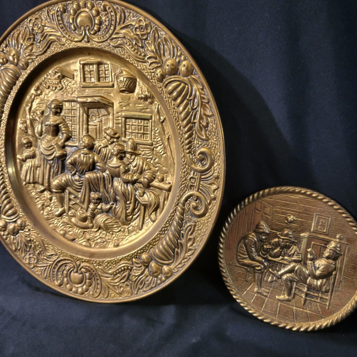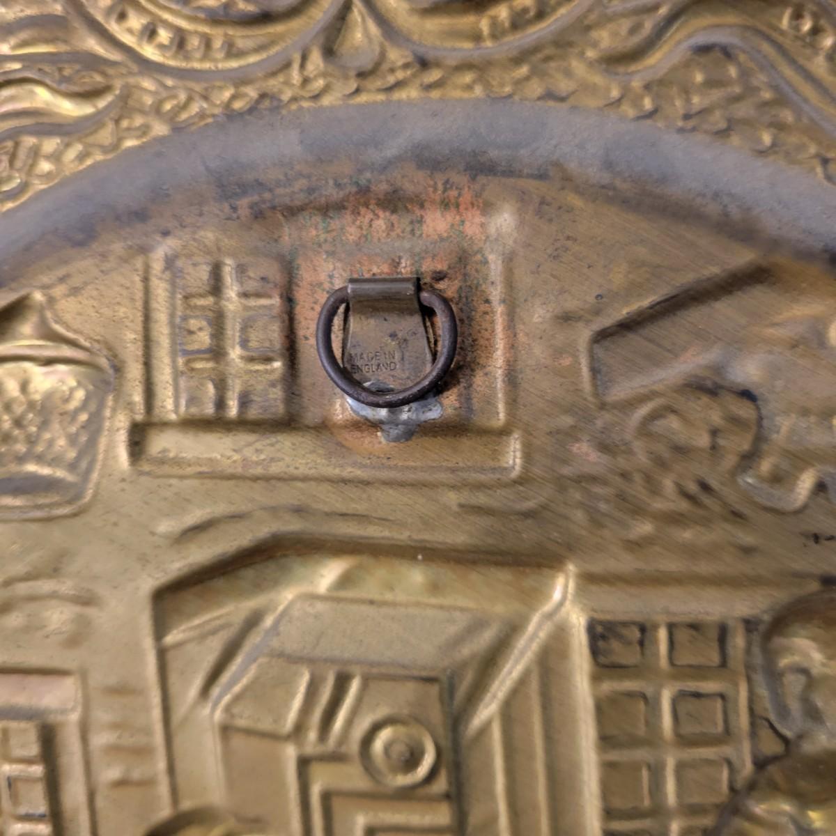 A pair of embossed brass hanging plates manufactured in England that are in excellent condition. Both of the plates feature scenes of English life with stunning detail and both have a hook attached to the back. Largest plate measures approximately 14.5 " x 1" Shipping available