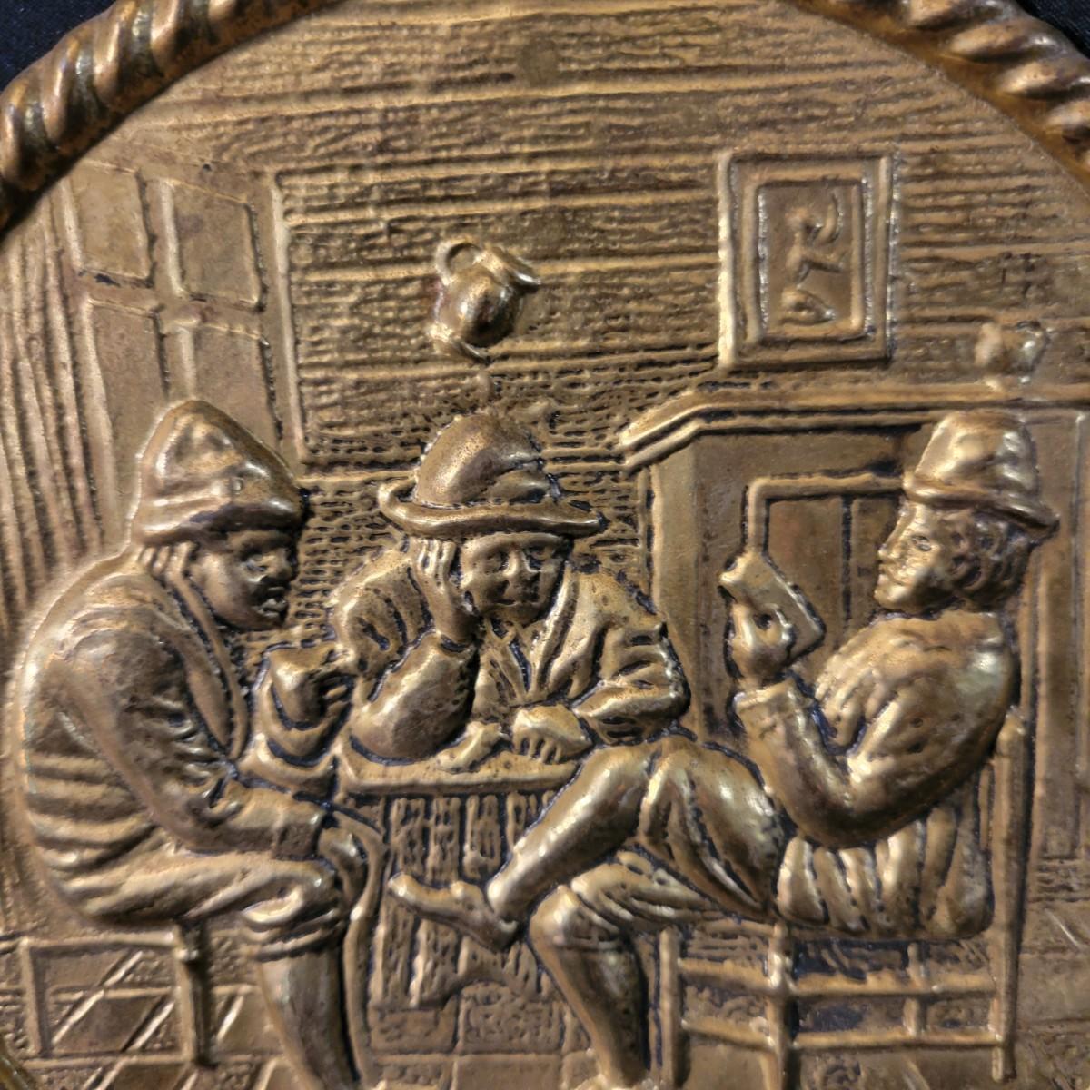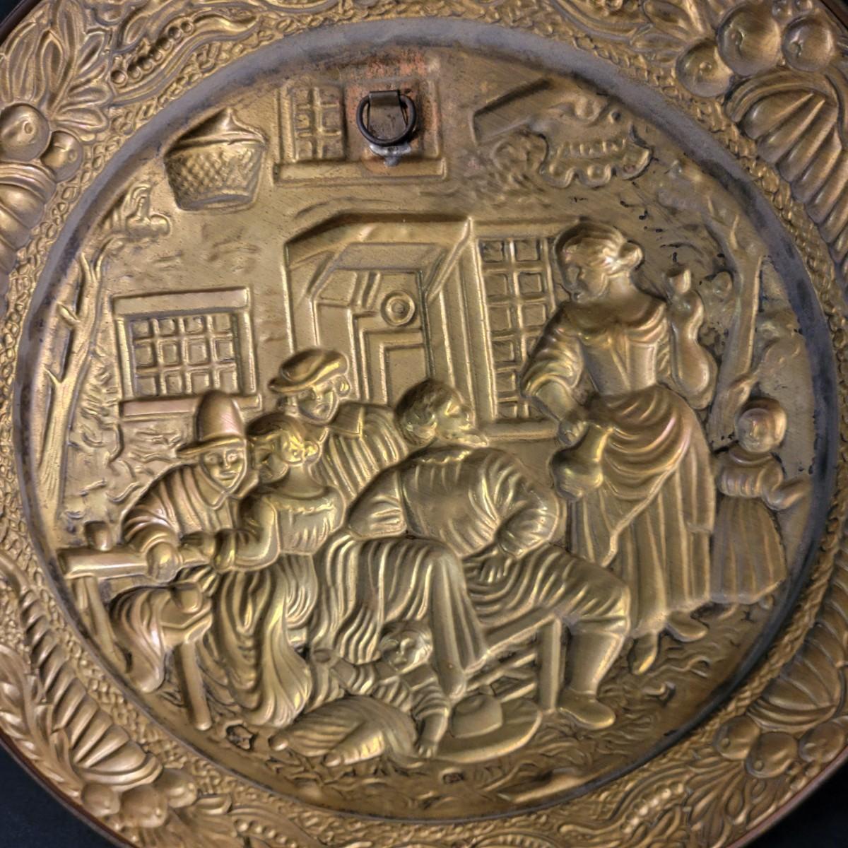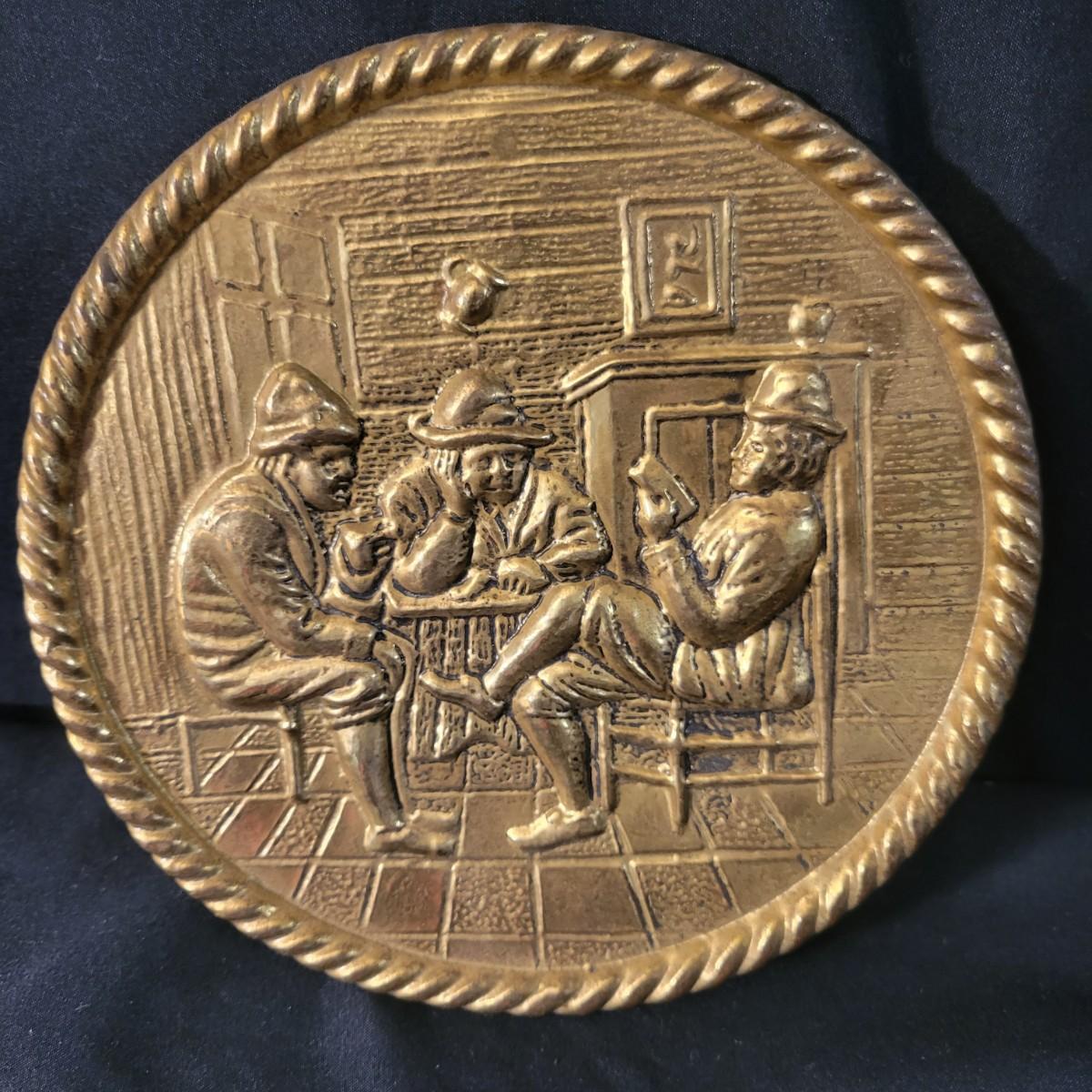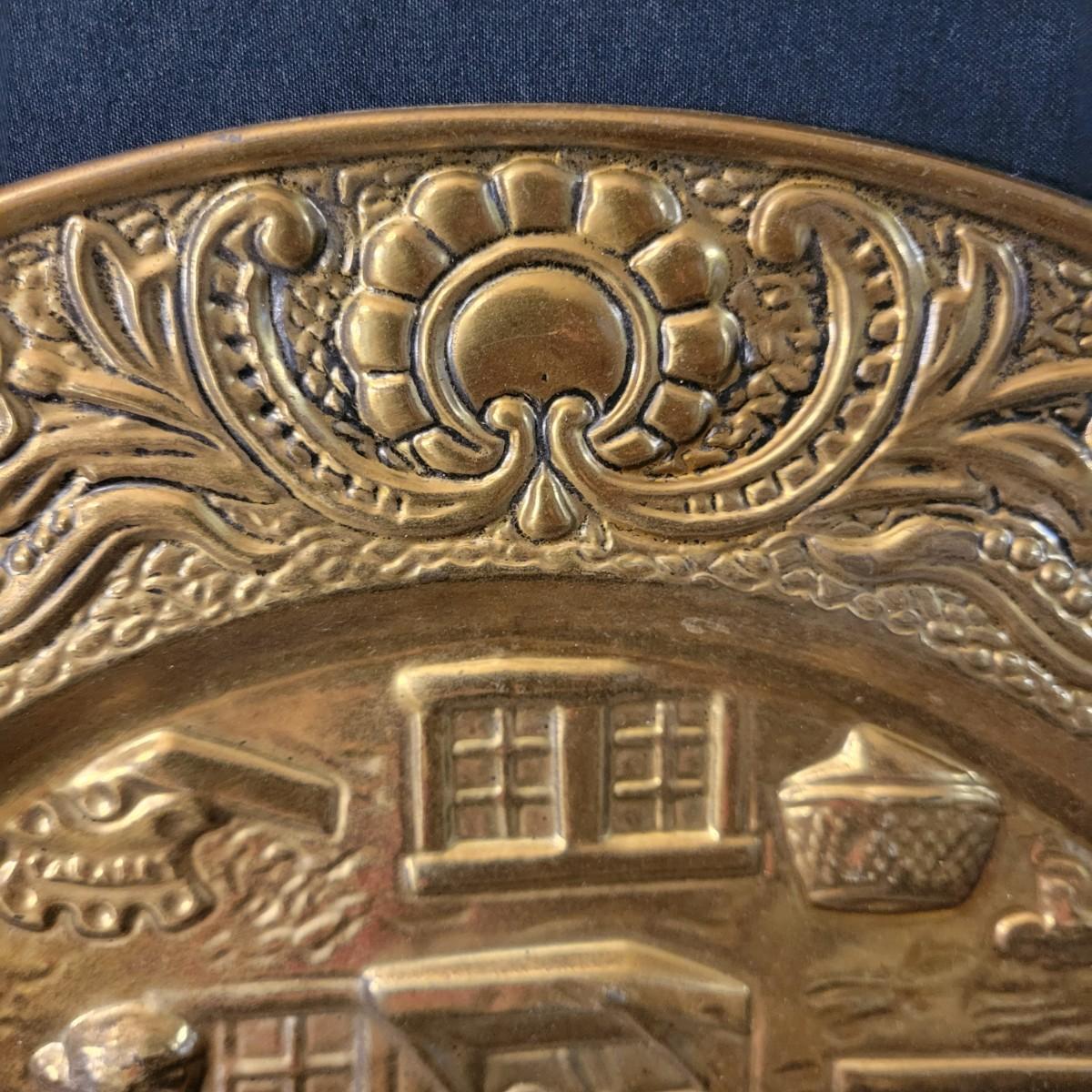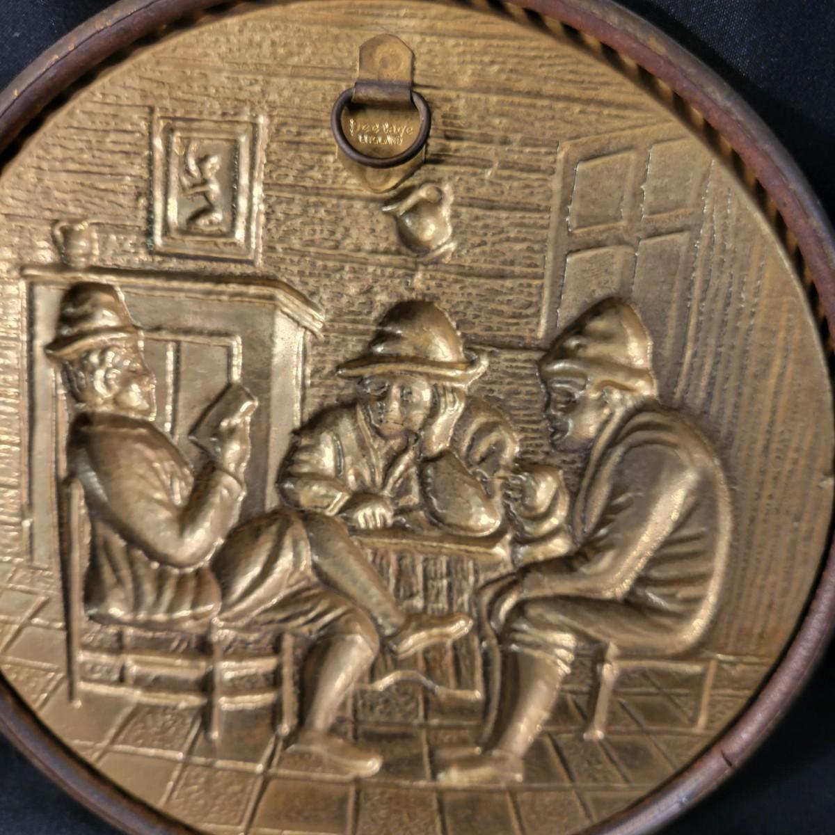 A pair of embossed brass hanging plates manufactured in England that are in excellent condition. Both of the plates feature scenes of English life with stunning detail and both have a hook attached to the back. Largest plate measures approximately 14.5 " x 1" Shipping available