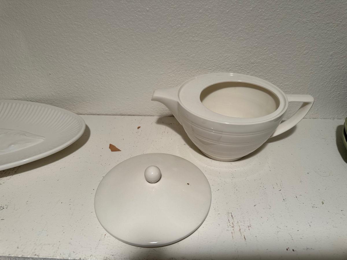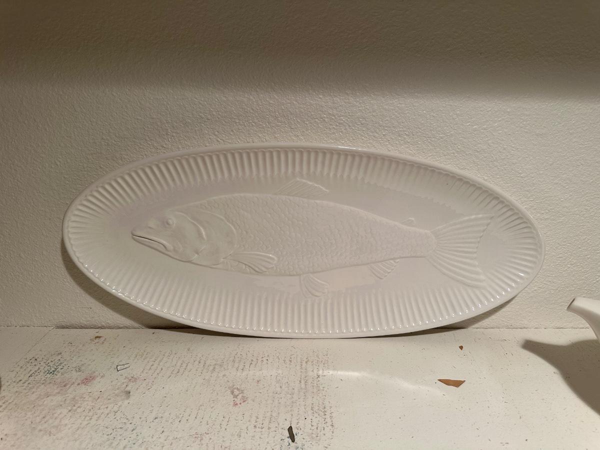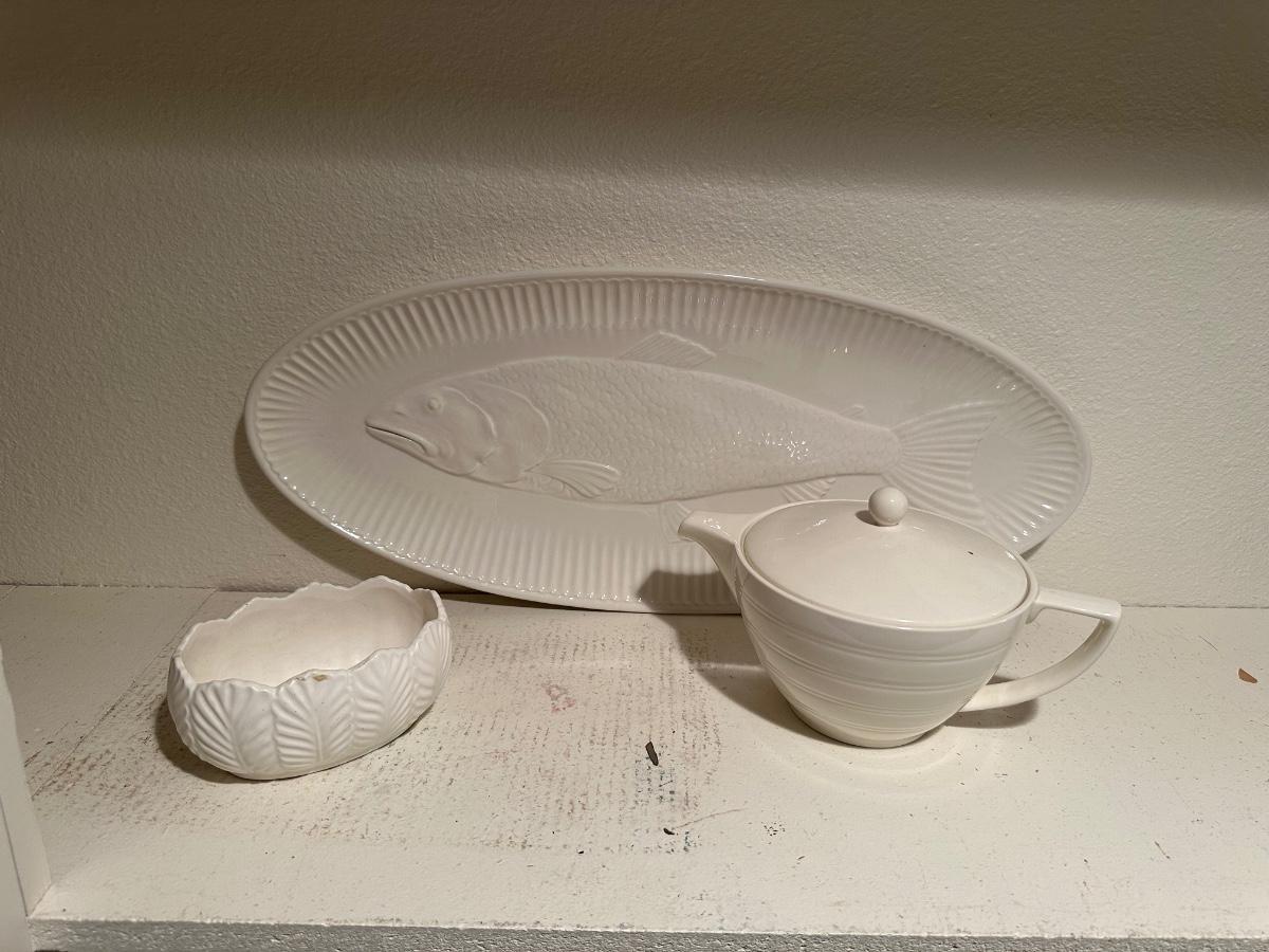 EMBOSSED FISH PLATTER, WEDGEWOOD GRAVY BOAT AND A SIDE DISH