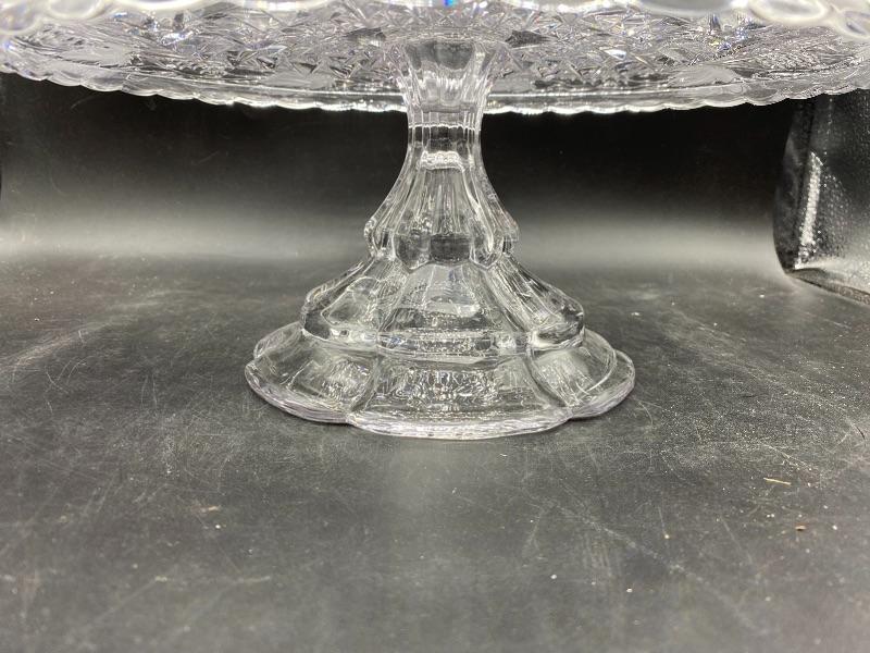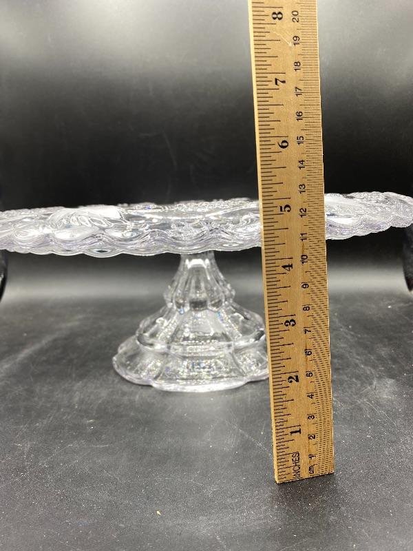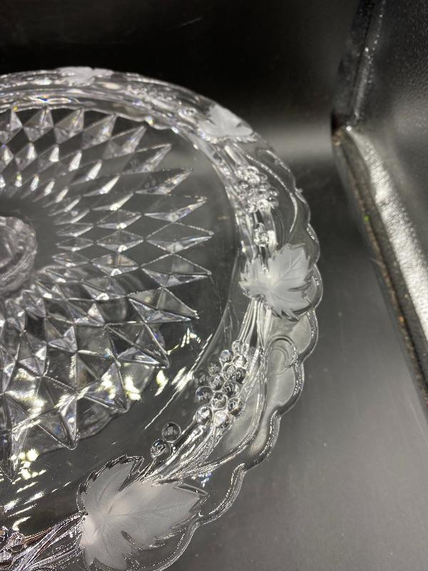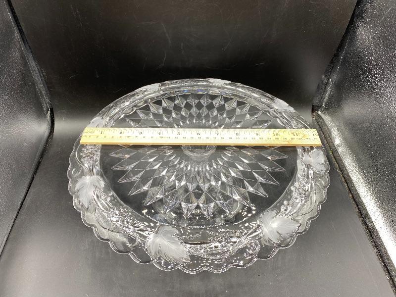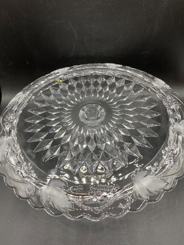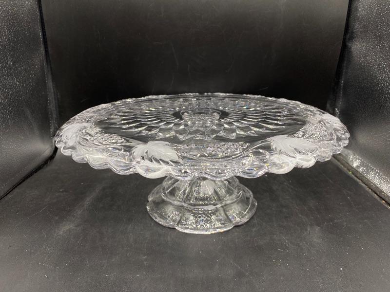 Embossed & frosted grapevine patterned cake plate. Scalloped edge pedestal stand. Diamond pattern center with grapevine around outer edge. Stands about 5" tall and is just over 12" across. Good condition.
