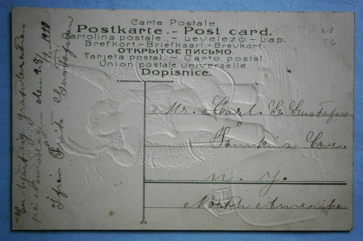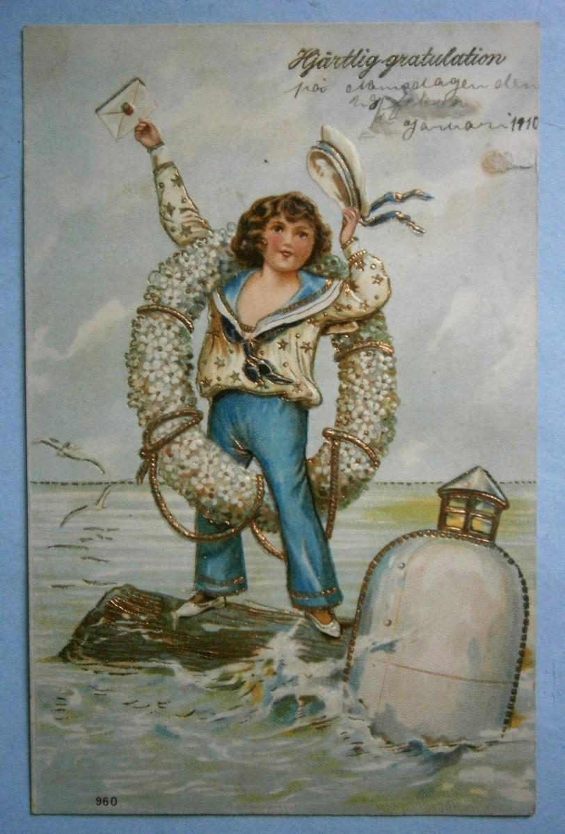 Embossed Greeting Card with Sailor Boy in Life Preserver, standard size, unposted with message on back & front dated 1910,