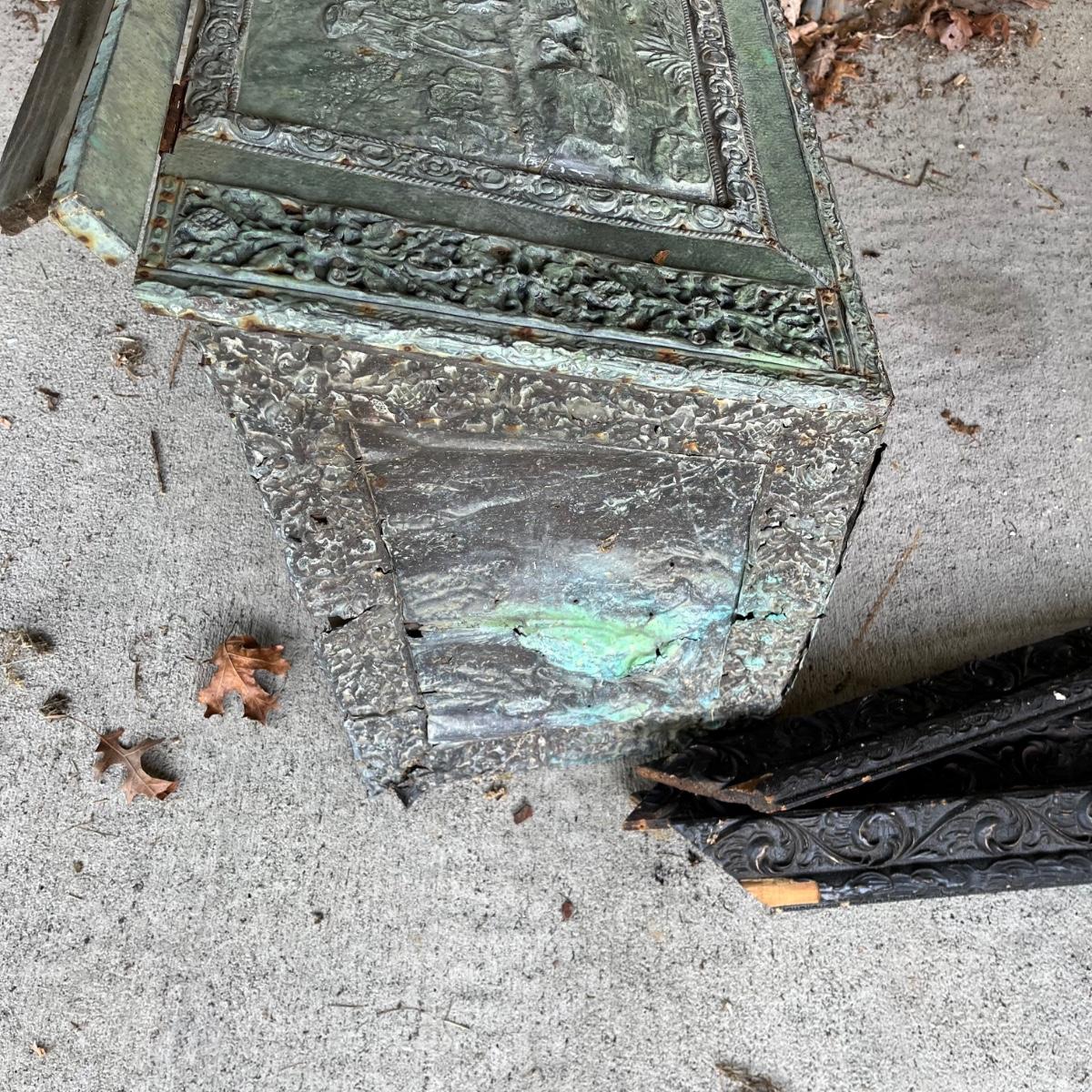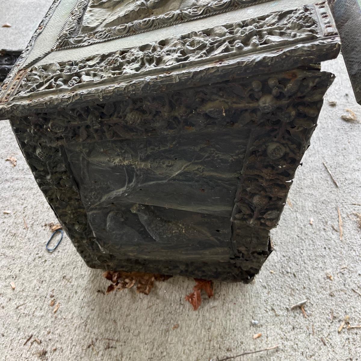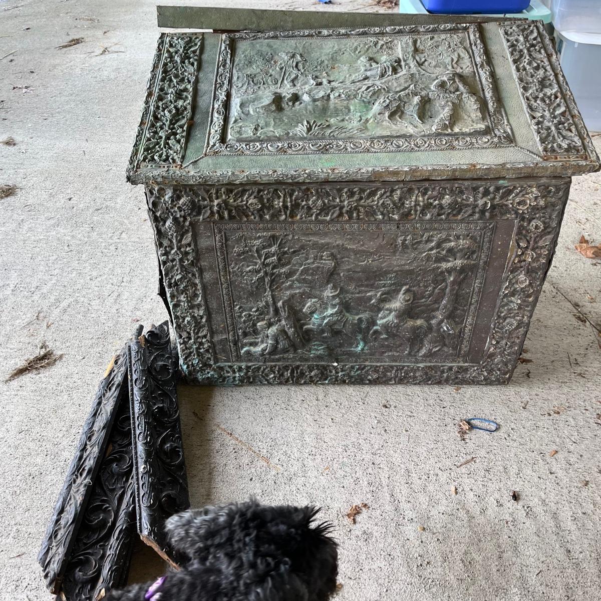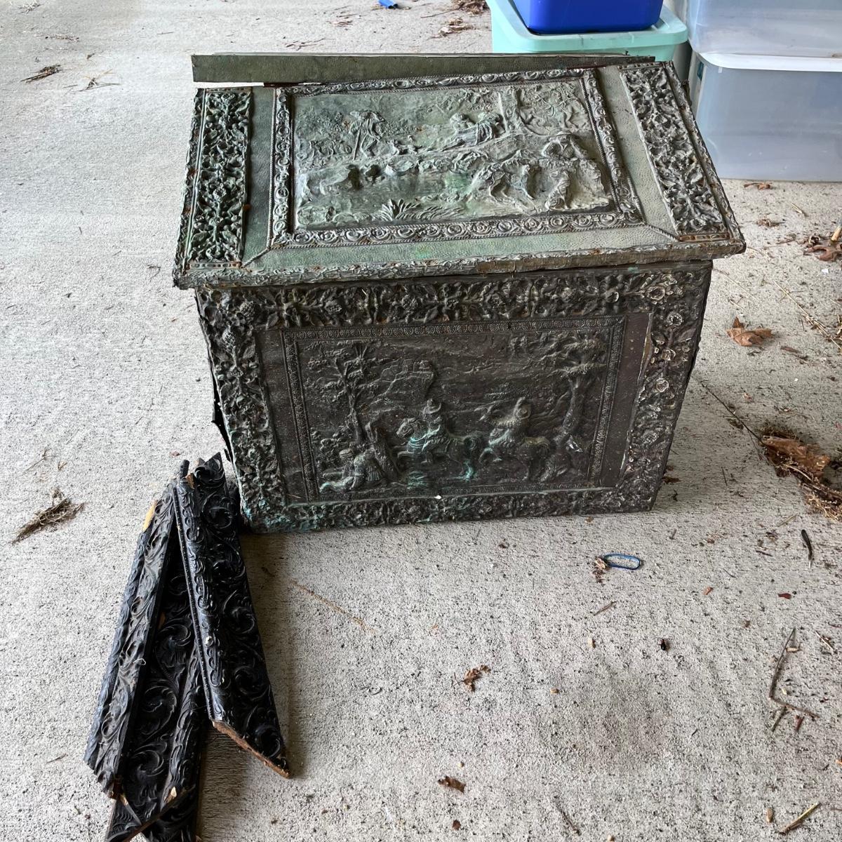 Lot includes an embossed metal over wood trunk. Trunk is in pieces and the sides are rough, see pictures. Also includes a carved wooden frame that is in pieces.