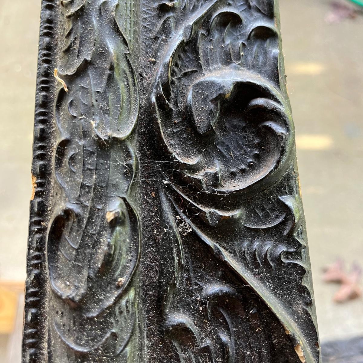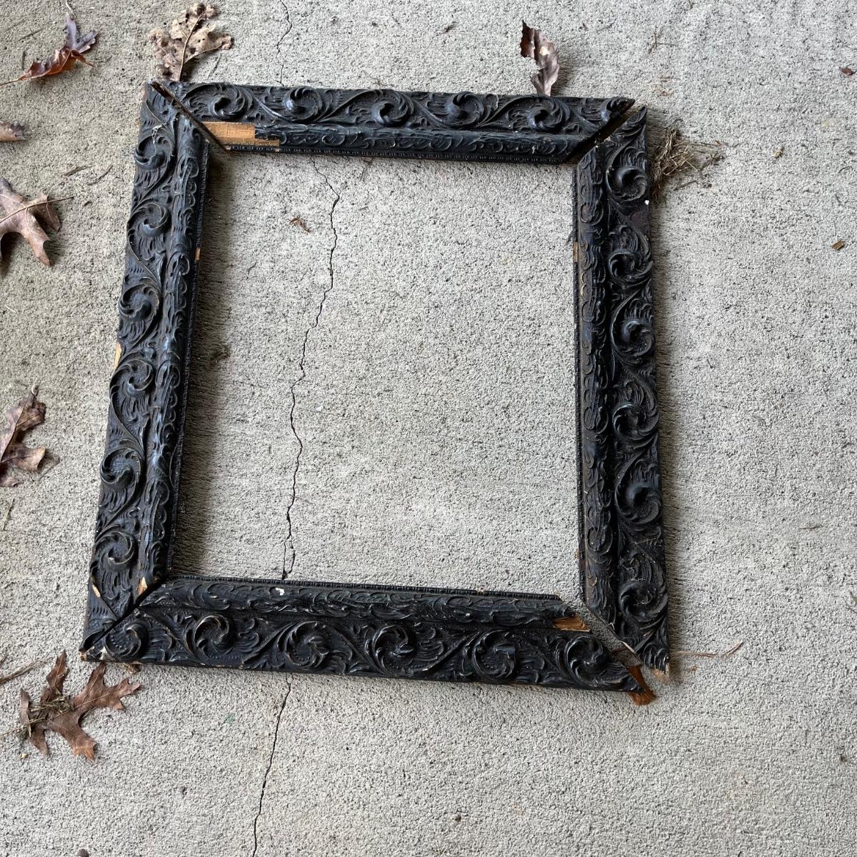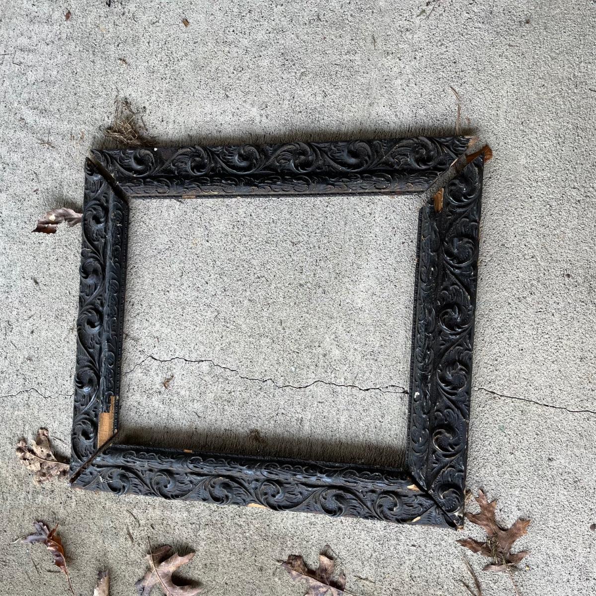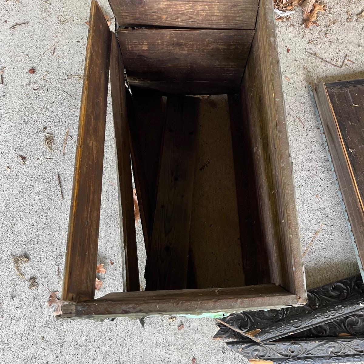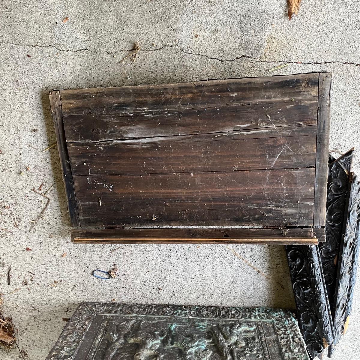 Lot includes an embossed metal over wood trunk. Trunk is in pieces and the sides are rough, see pictures. Also includes a carved wooden frame that is in pieces.