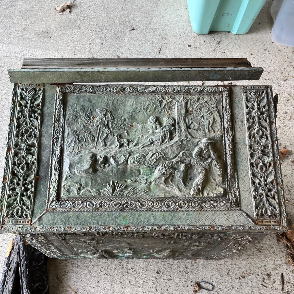 Trunk measures 16” x 26.5” x 22.5”. The embossed metal appears to be copper.
