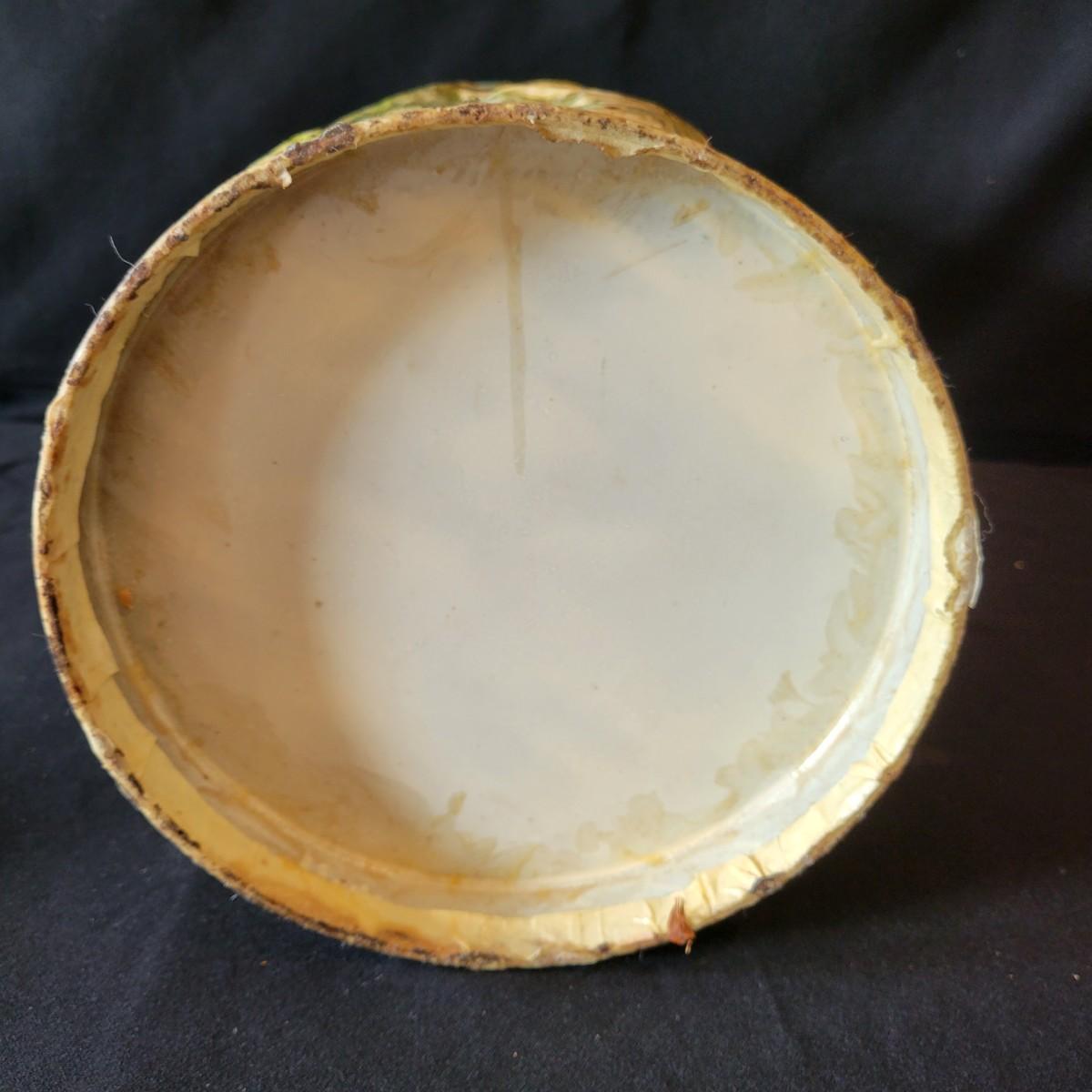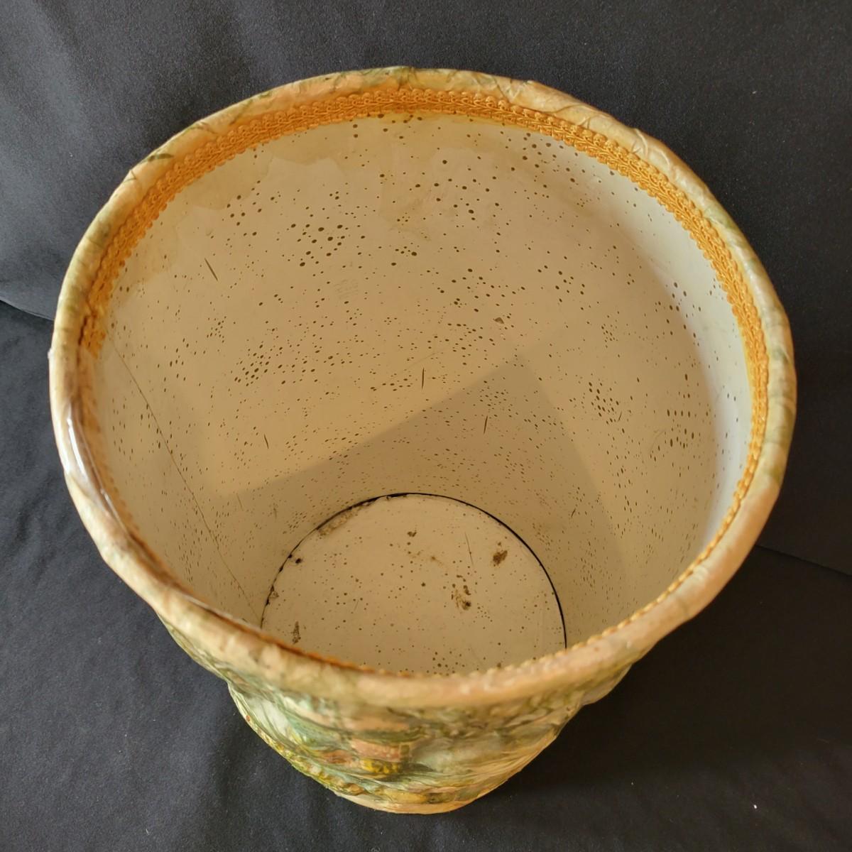 An embossed umbrella stand that is wrapped and embossed in a paper coating. It has three deminsional aspects that coincide with the figures, trees and buildings. It has a 19th century English motif and measures approximately 10"D x 18"H. Shipping available