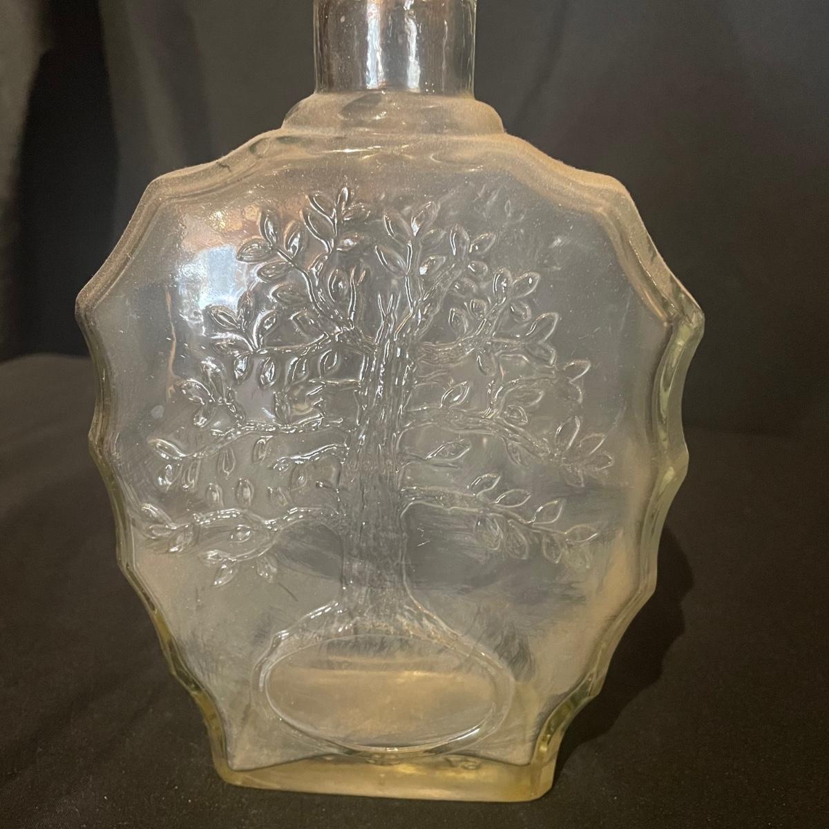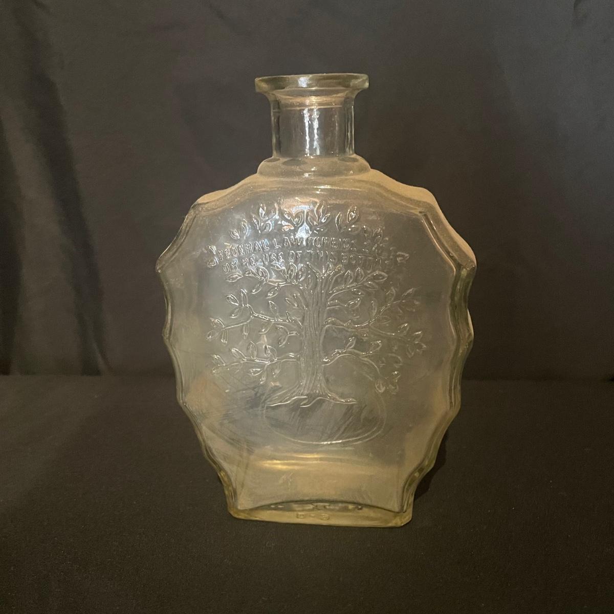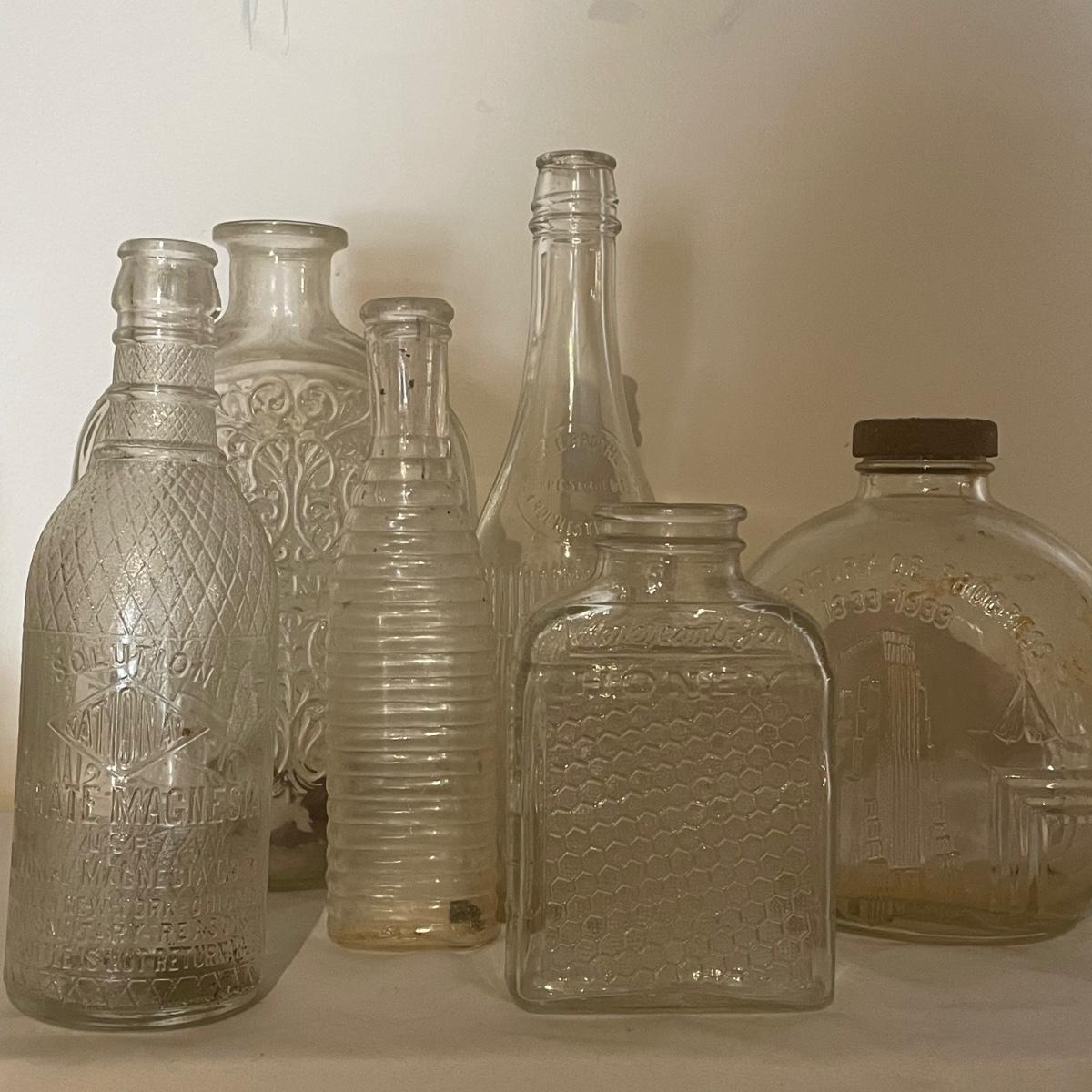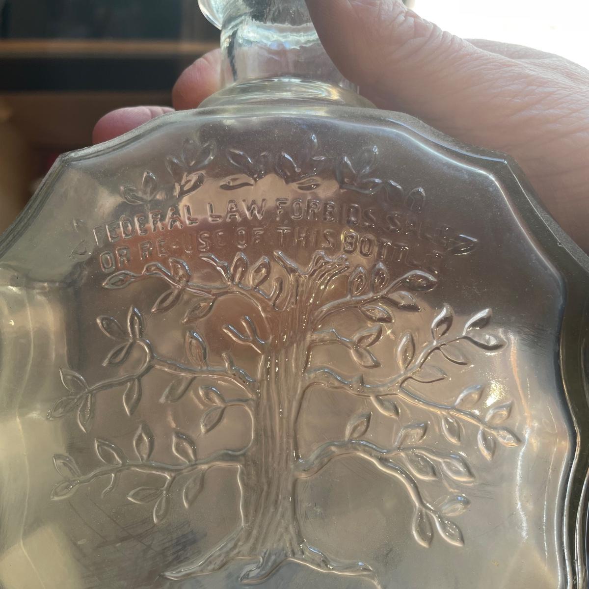 Seven vintage embossed glass bottles in this lot (bottle with tree measures 8” tall). The largest bottle is a Schenley’s whiskey bottle that measures 9.5” tall.