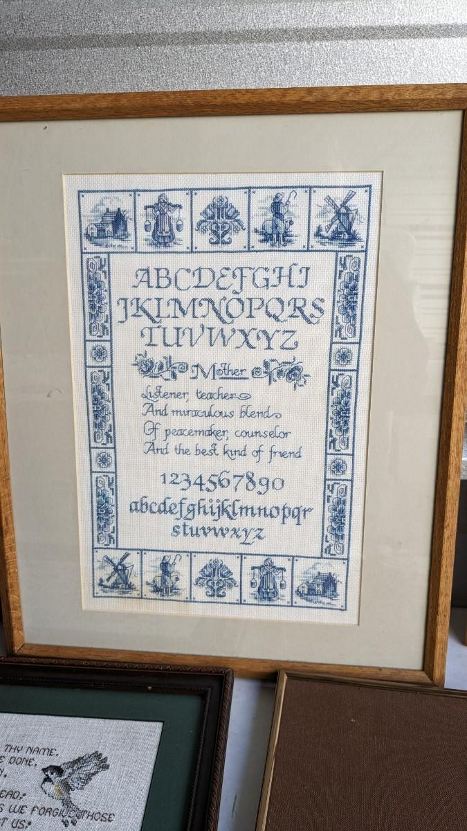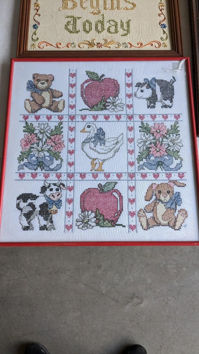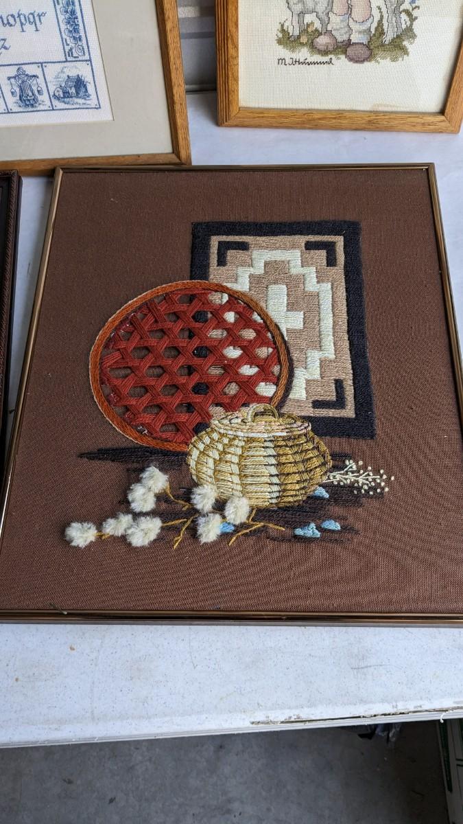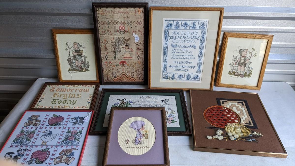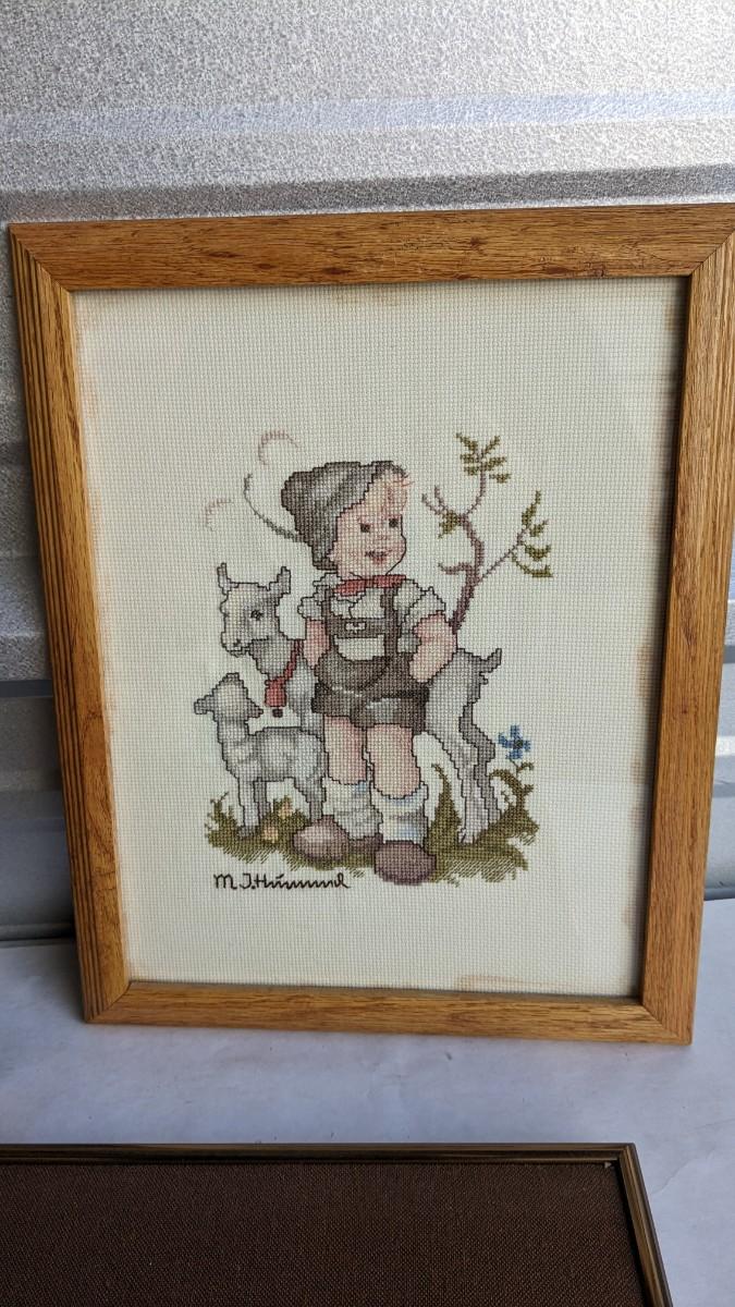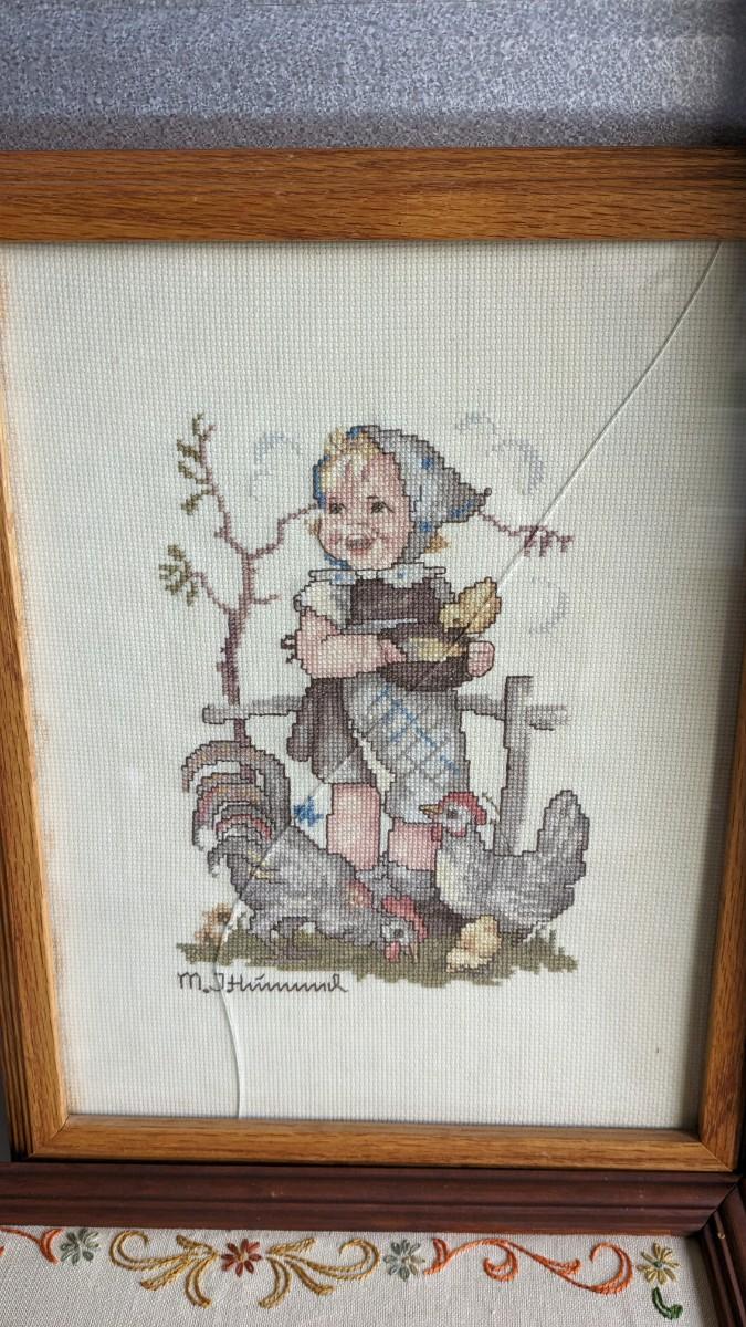 some very lovely handmade artwork. hummels show damage, please note in photos. One item is a print of embroidery. largest piece at 21.5"x16.25". no shipping. 2604