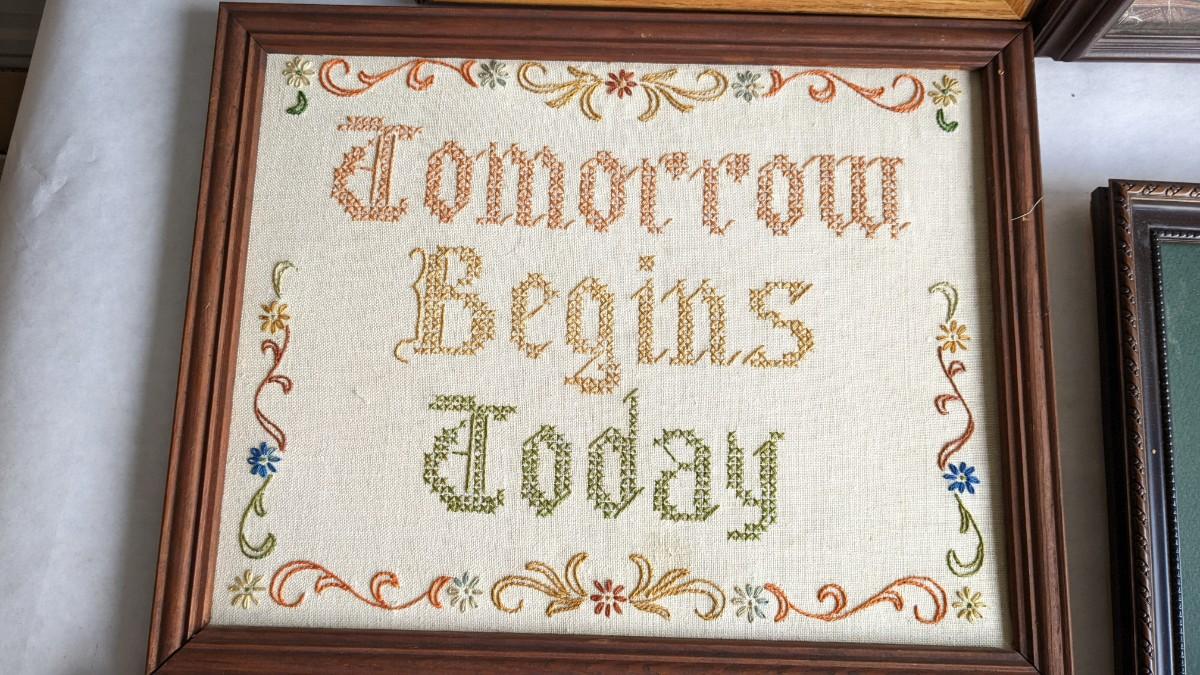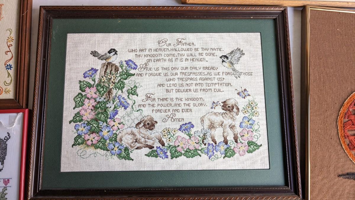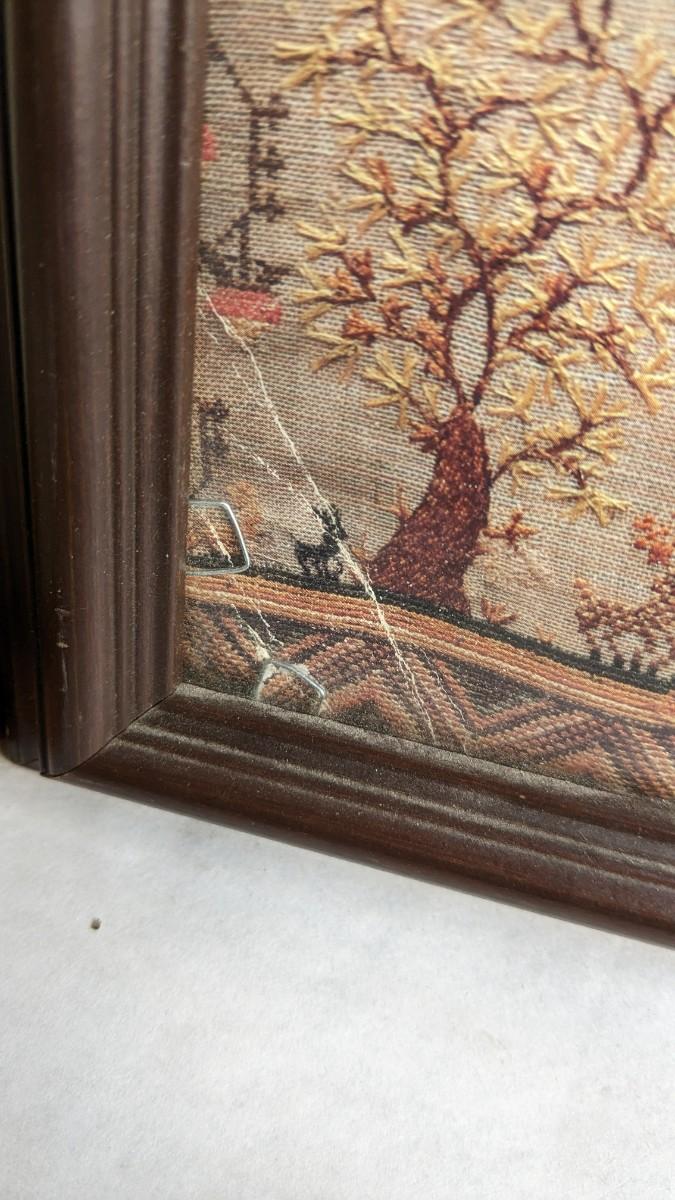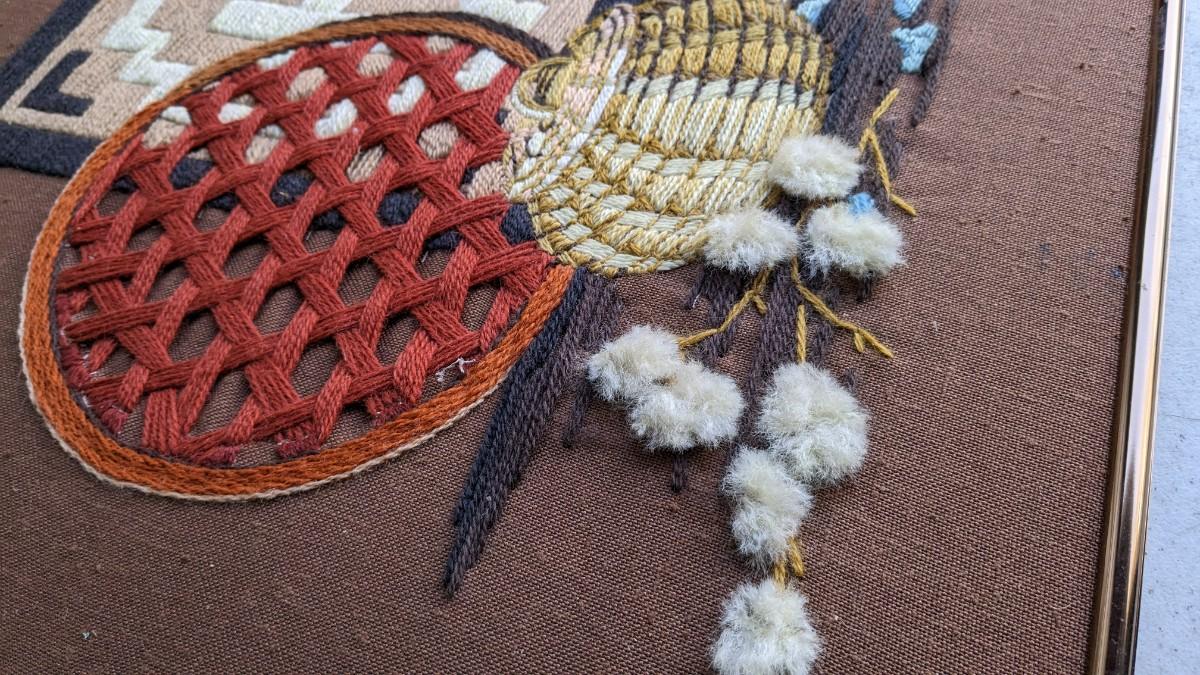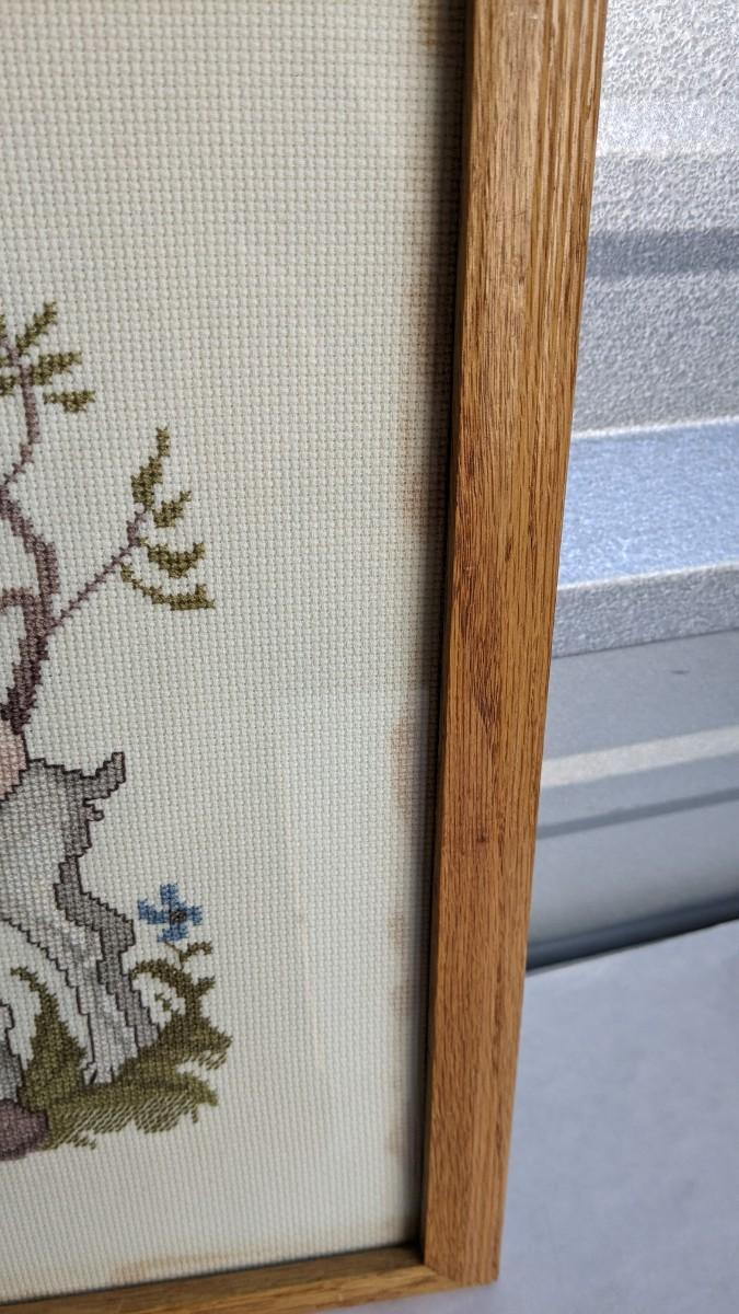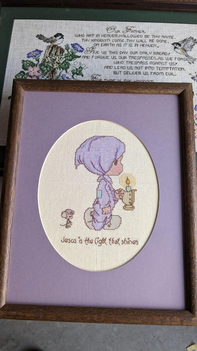 some very lovely handmade artwork. hummels show damage, please note in photos. One item is a print of embroidery. largest piece at 21.5"x16.25". no shipping. 2604