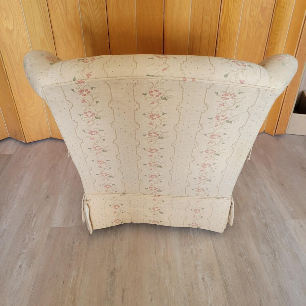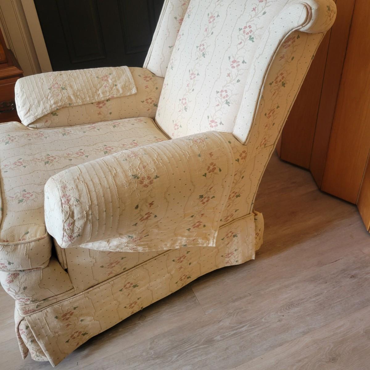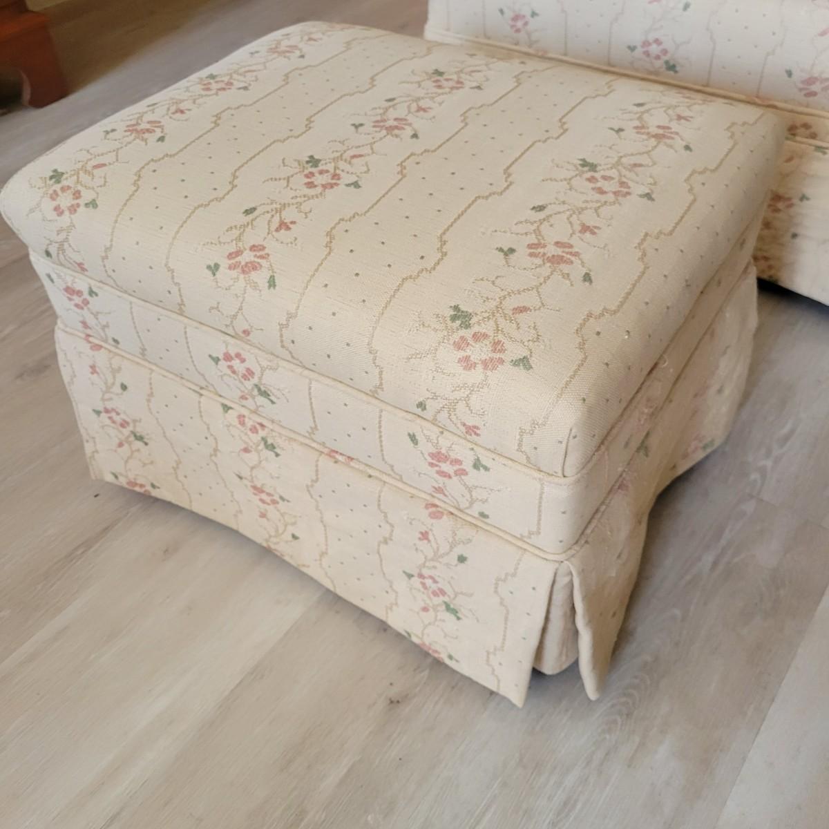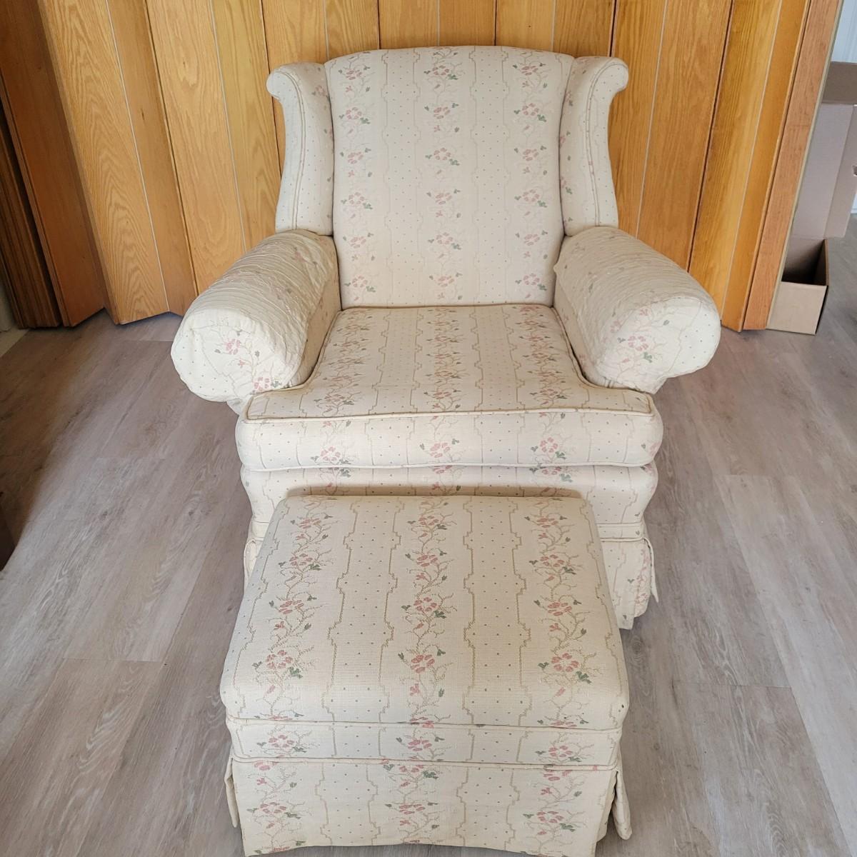 An embroidered chair and footstool in good condition with no notable stains or damage. Fabric is a cream color with embroidered pink and green accents. Chair measures approximately 36" x 36" x 33" seat height is approximately 18". Footstool measures approximately 20" x 16" x 13.5" Local pickup only