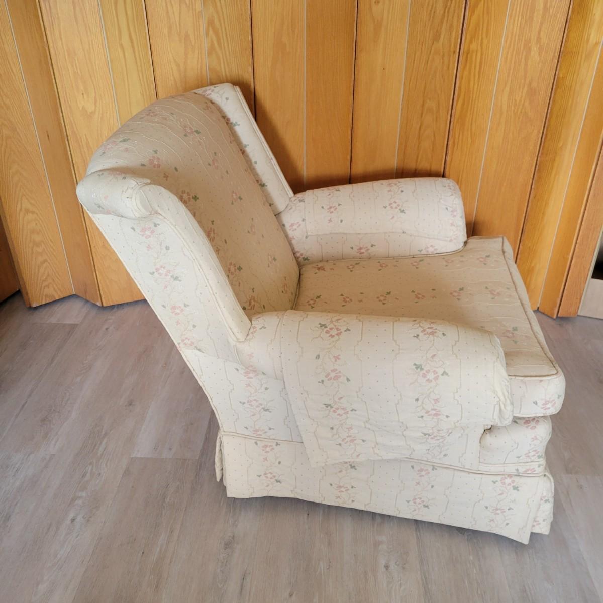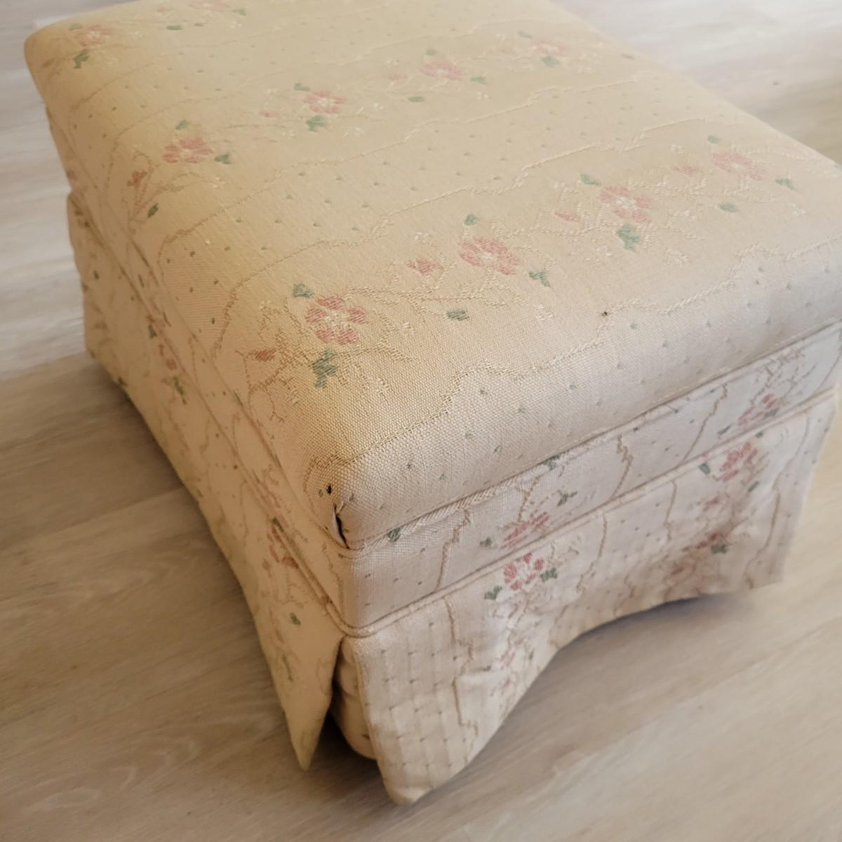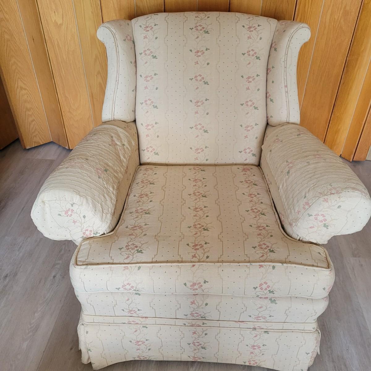 An embroidered chair and footstool in good condition with no notable stains or damage. Fabric is a cream color with embroidered pink and green accents. Chair measures approximately 36" x 36" x 33" seat height is approximately 18". Footstool measures approximately 20" x 16" x 13.5" Local pickup only