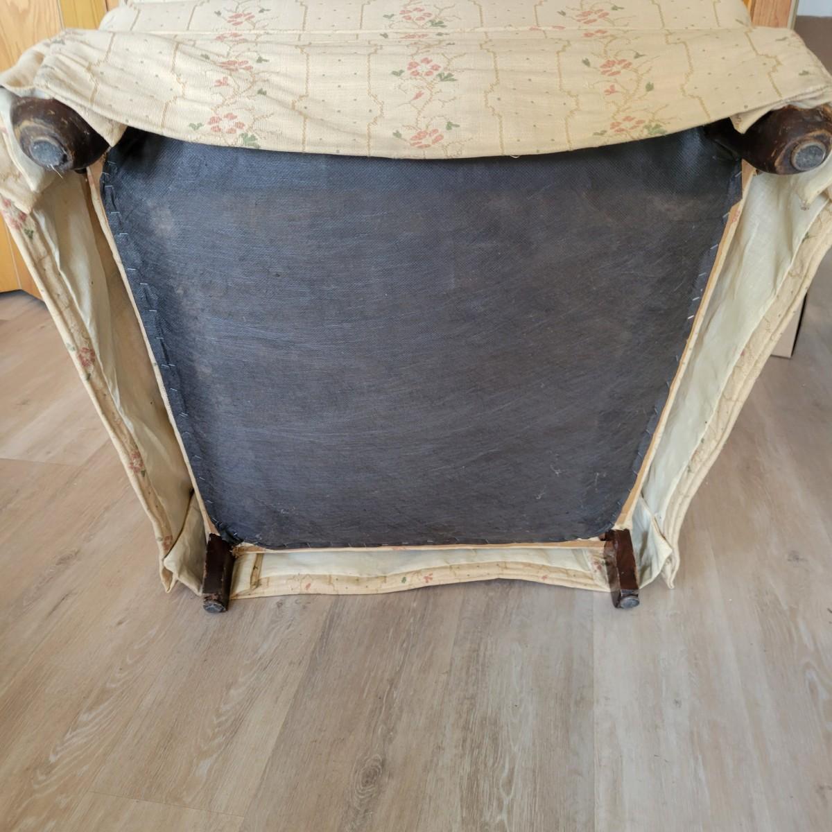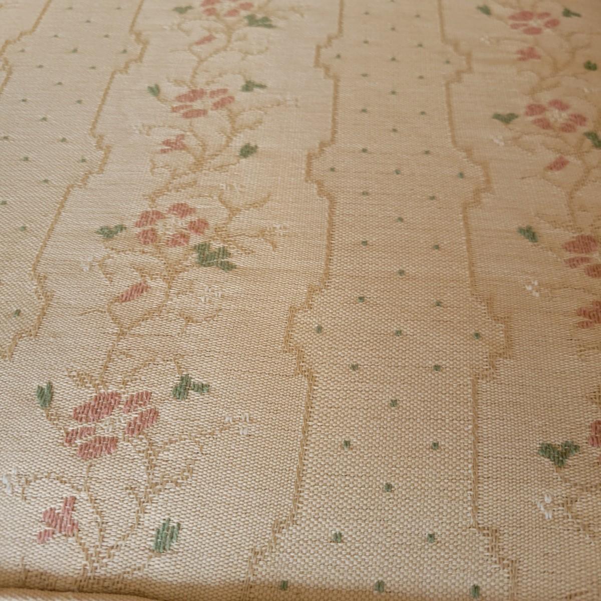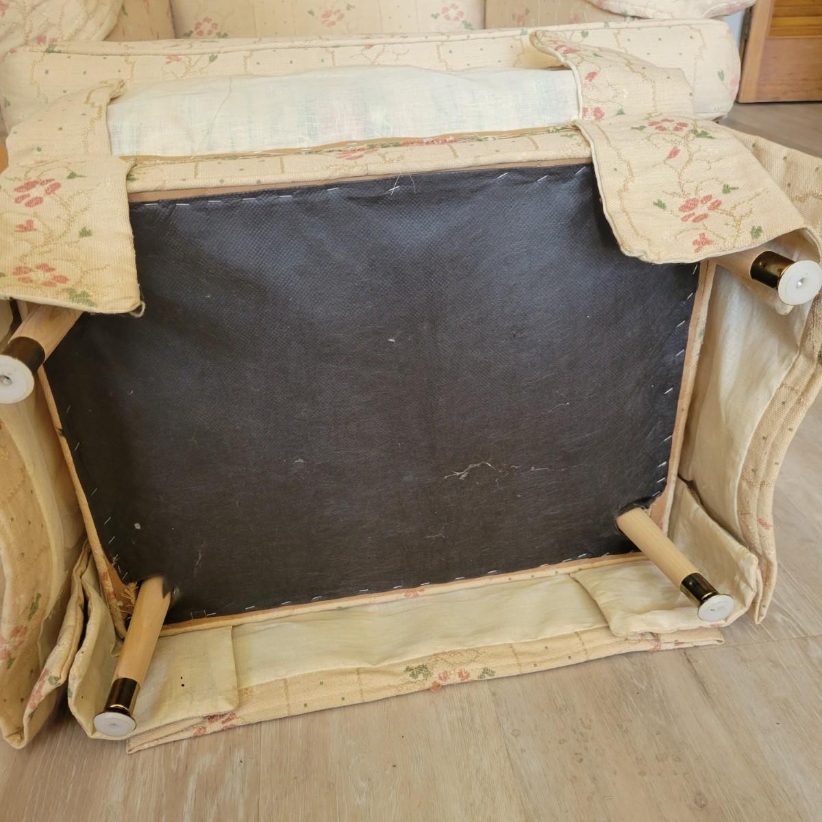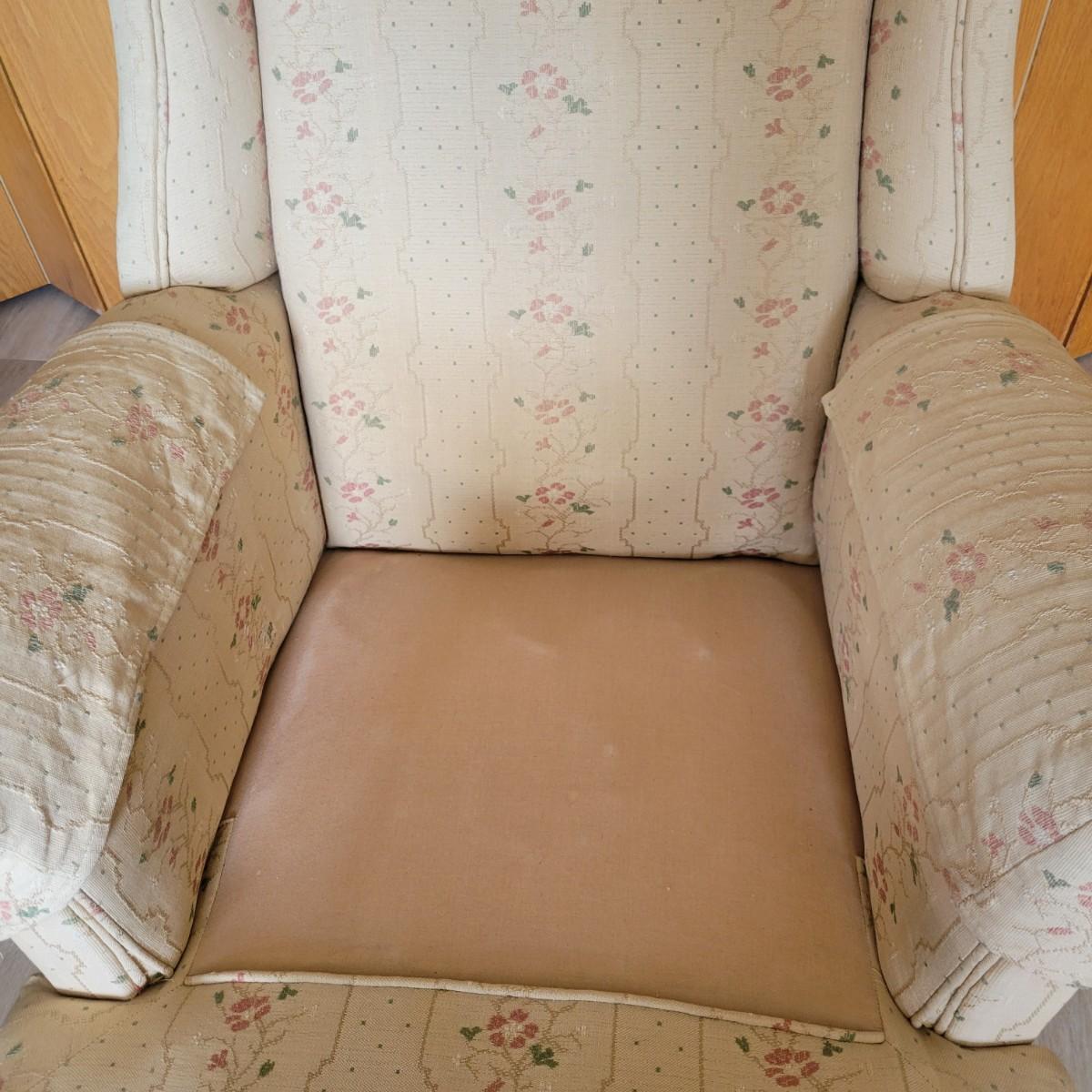 An embroidered chair and footstool in good condition with no notable stains or damage. Fabric is a cream color with embroidered pink and green accents. Chair measures approximately 36" x 36" x 33" seat height is approximately 18". Footstool measures approximately 20" x 16" x 13.5" Local pickup only