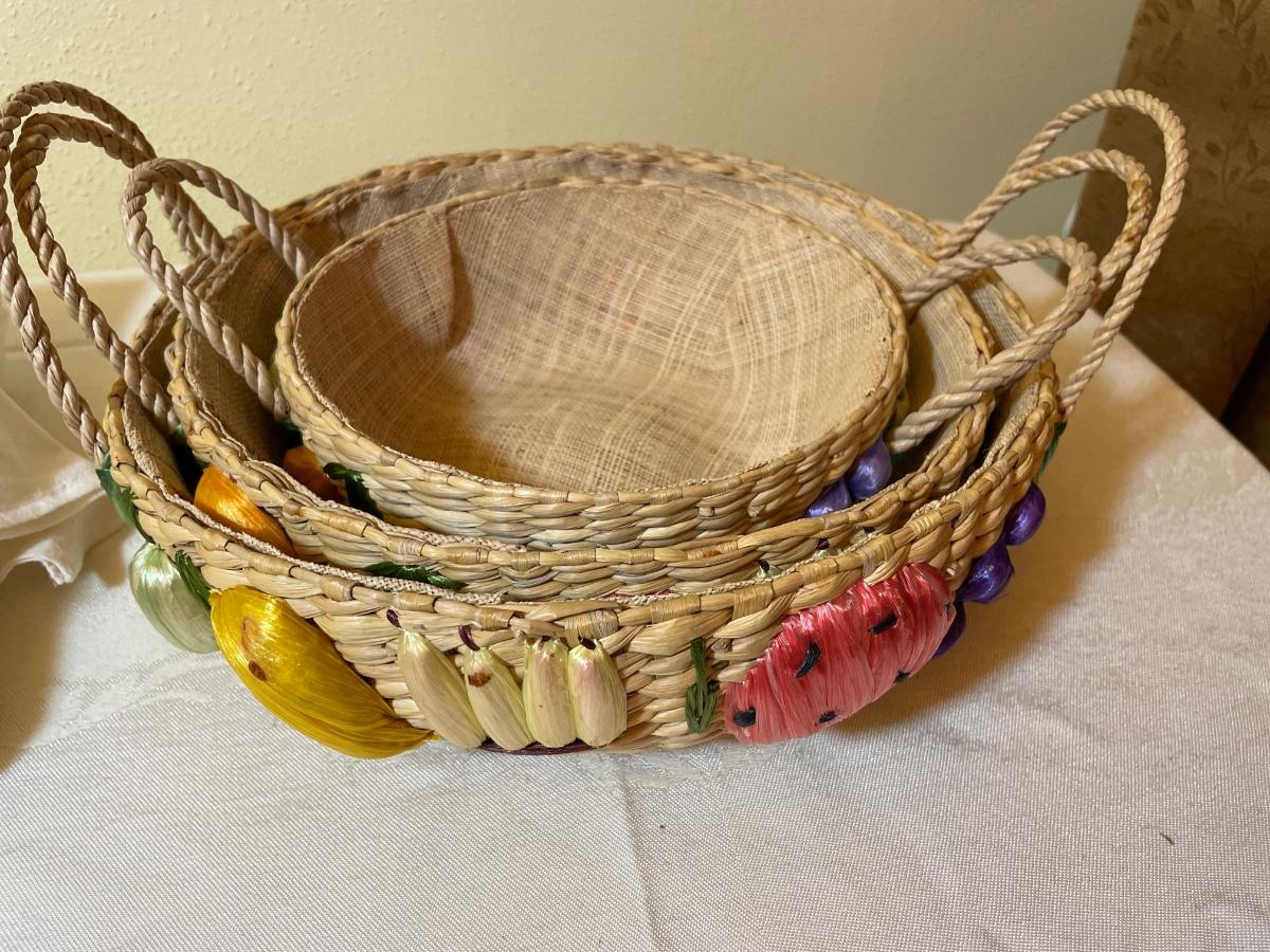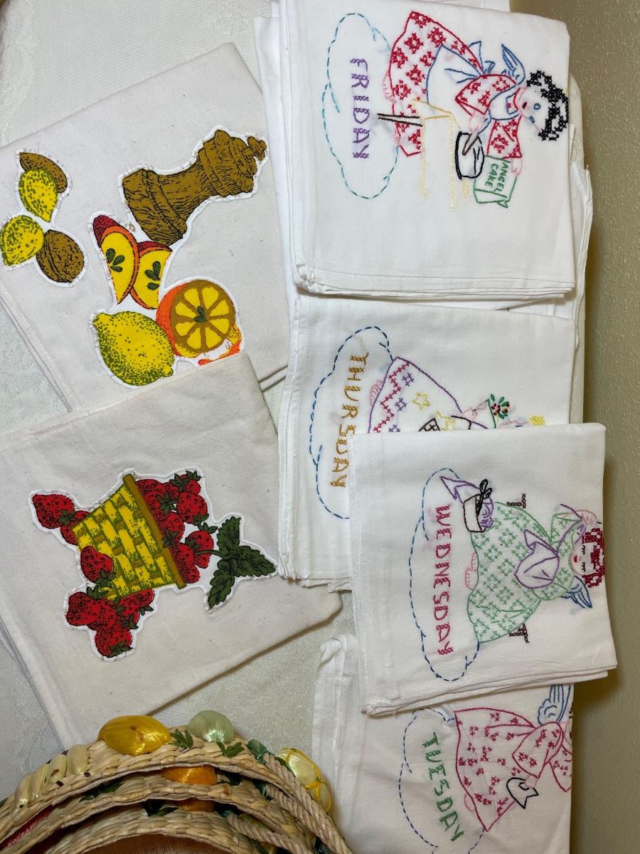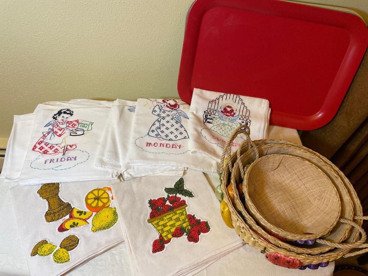 Embroidered dish towels, baskets and trays