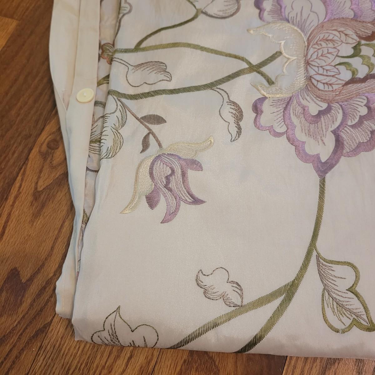 A lovely satin style embroidered queen duvet with sham pillow cases, as well as a paisley print queen sheet set that os new in package. Shipping available.